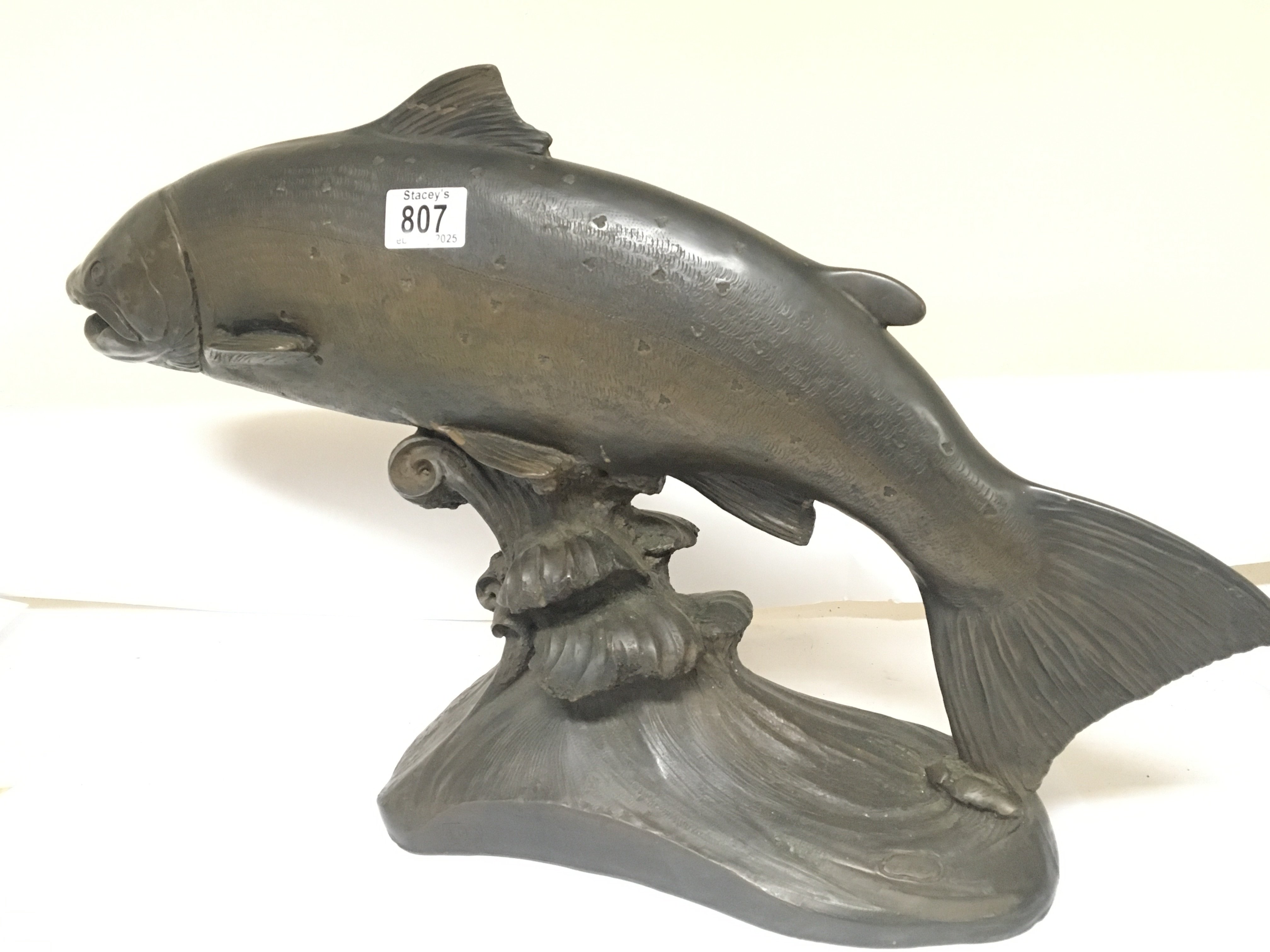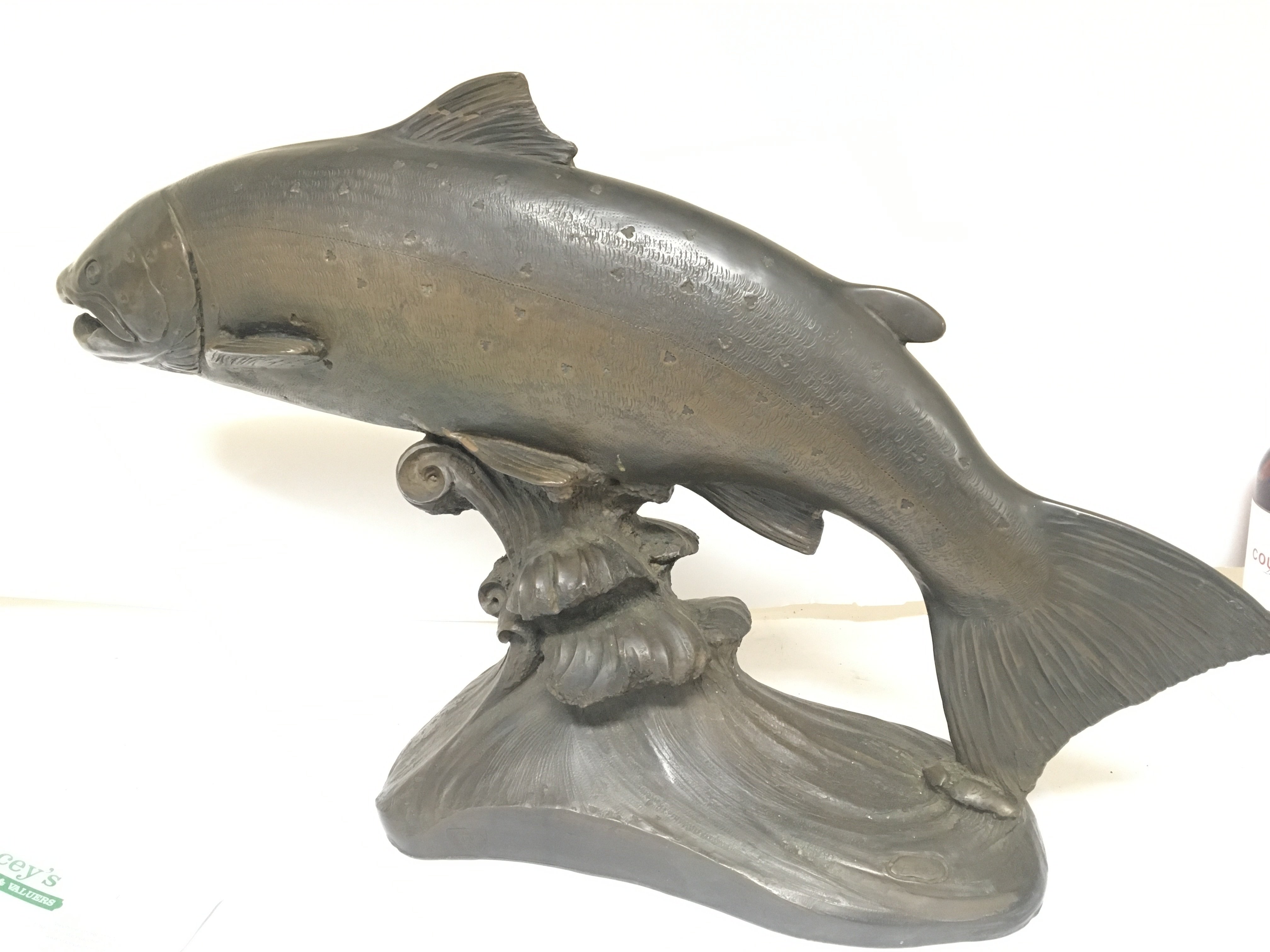 A large cold cast bronze of a leaping wild Salmon on a scrolling wave. Signed by B Elton length 64cm.