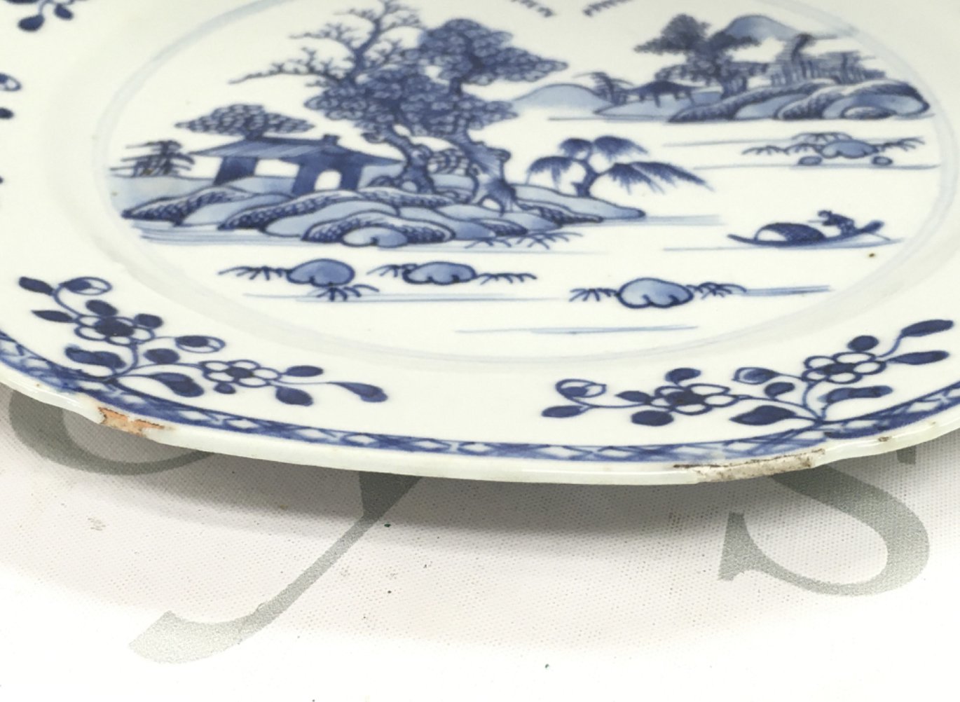 An 18th century Chinese octagonal blue and white plate decorated with a river scene , 23cm wide. Chips seen on plate. This lot cannot be posted NO RESERVE