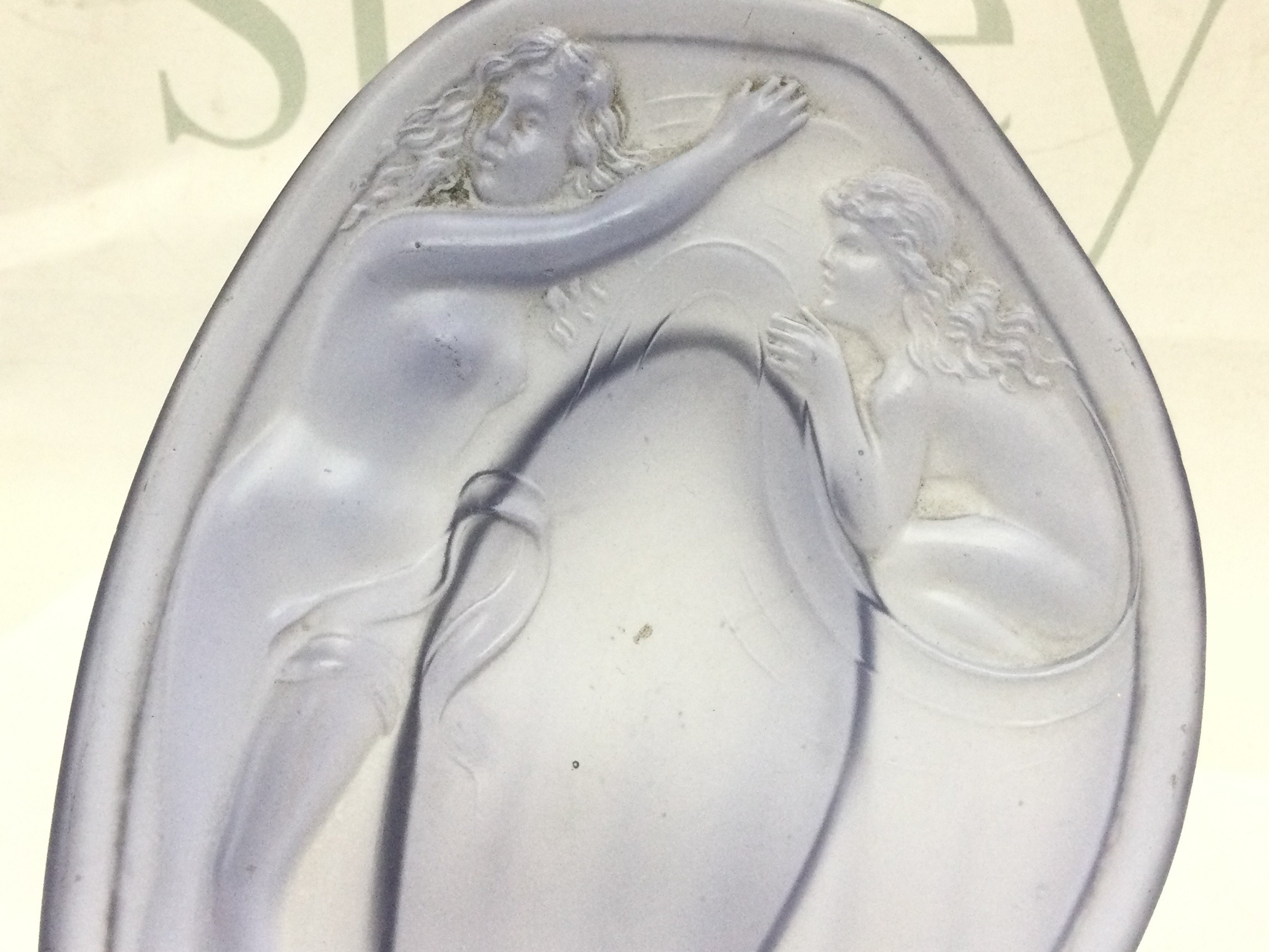 A small Art Deco glass dish with nude women design. 16cm tall. This lot cannot be posted