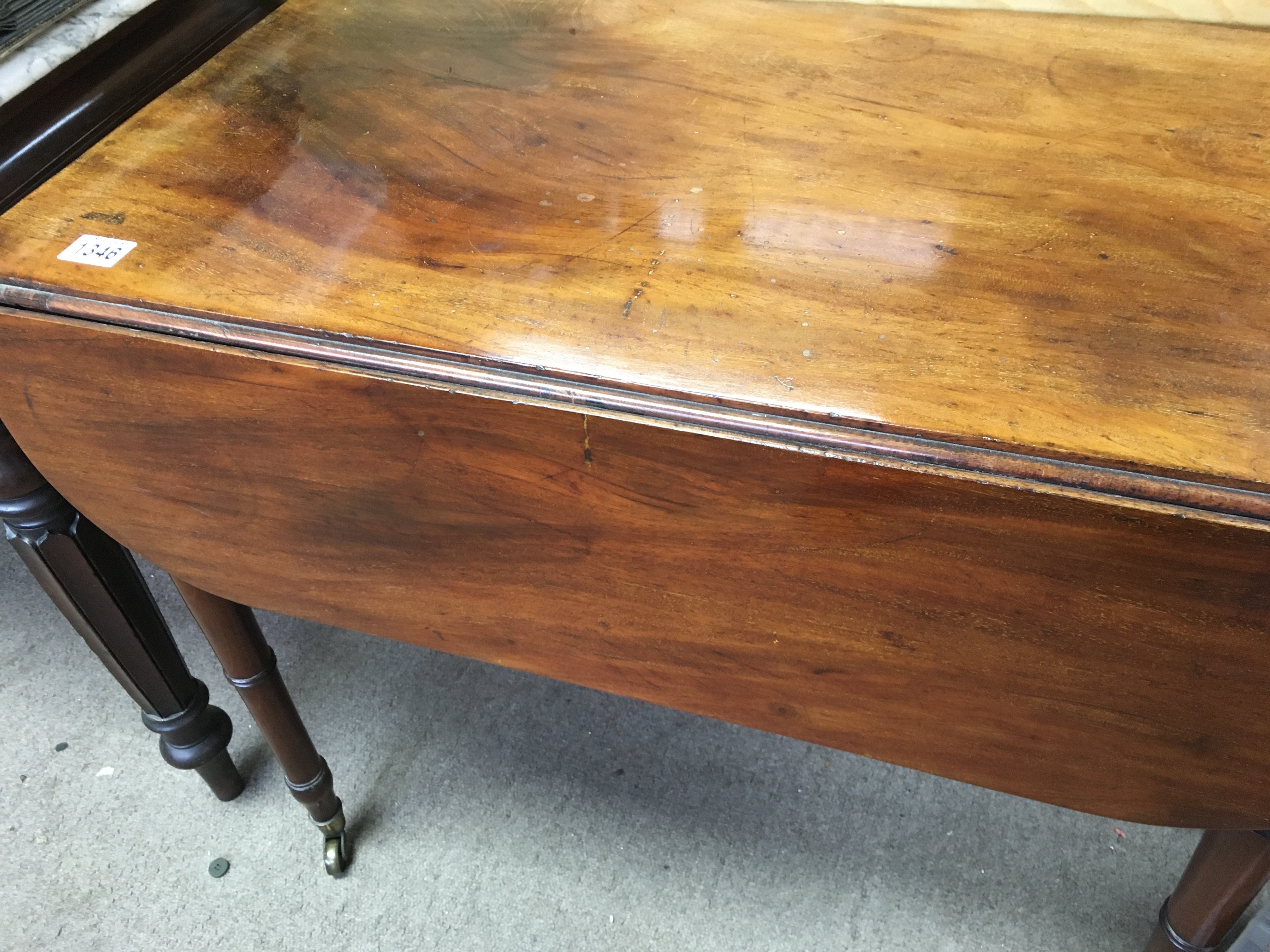 A Georgian mahogany drop leaf table the twin flap top above turned legs . NO RESERVE