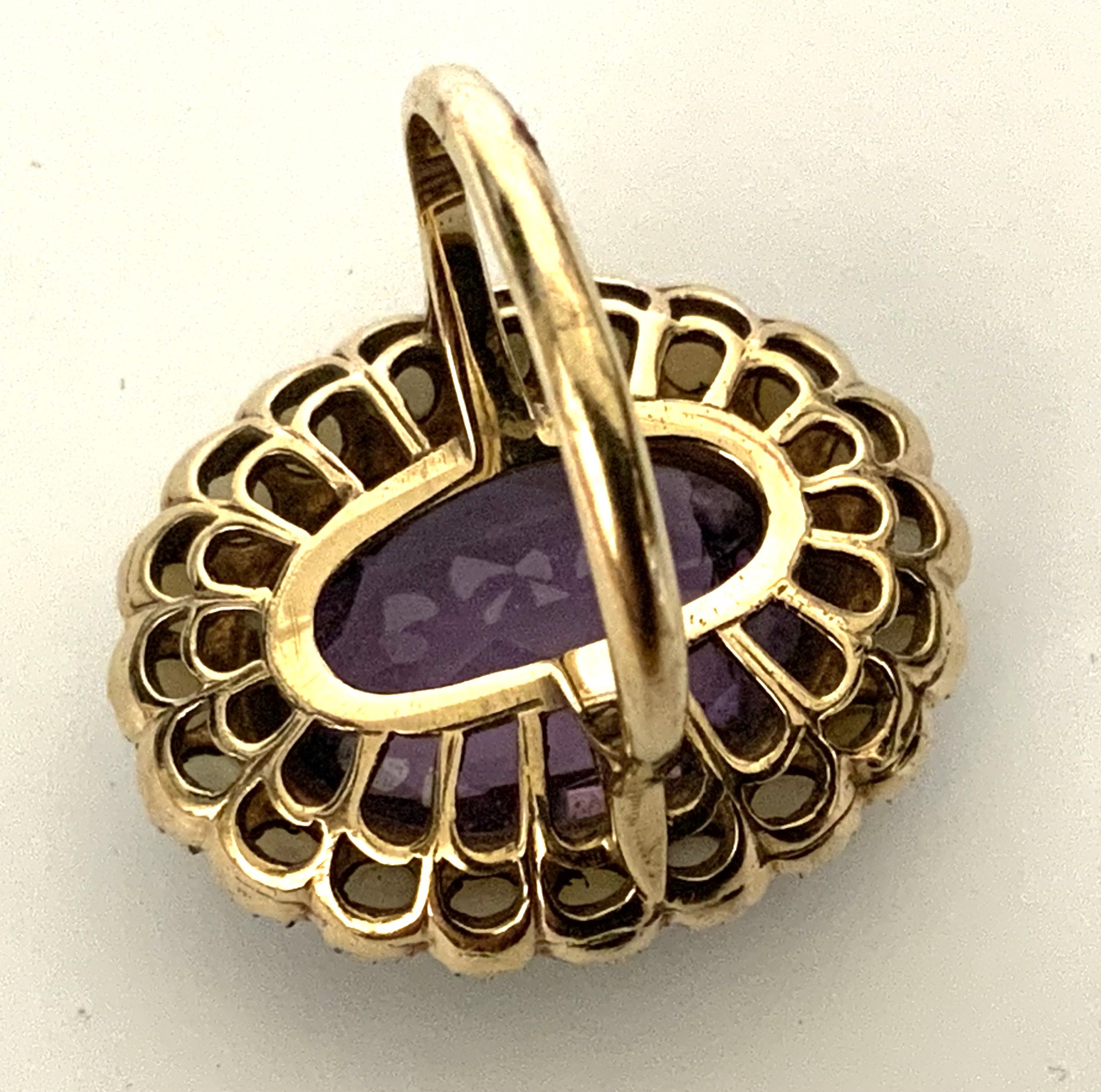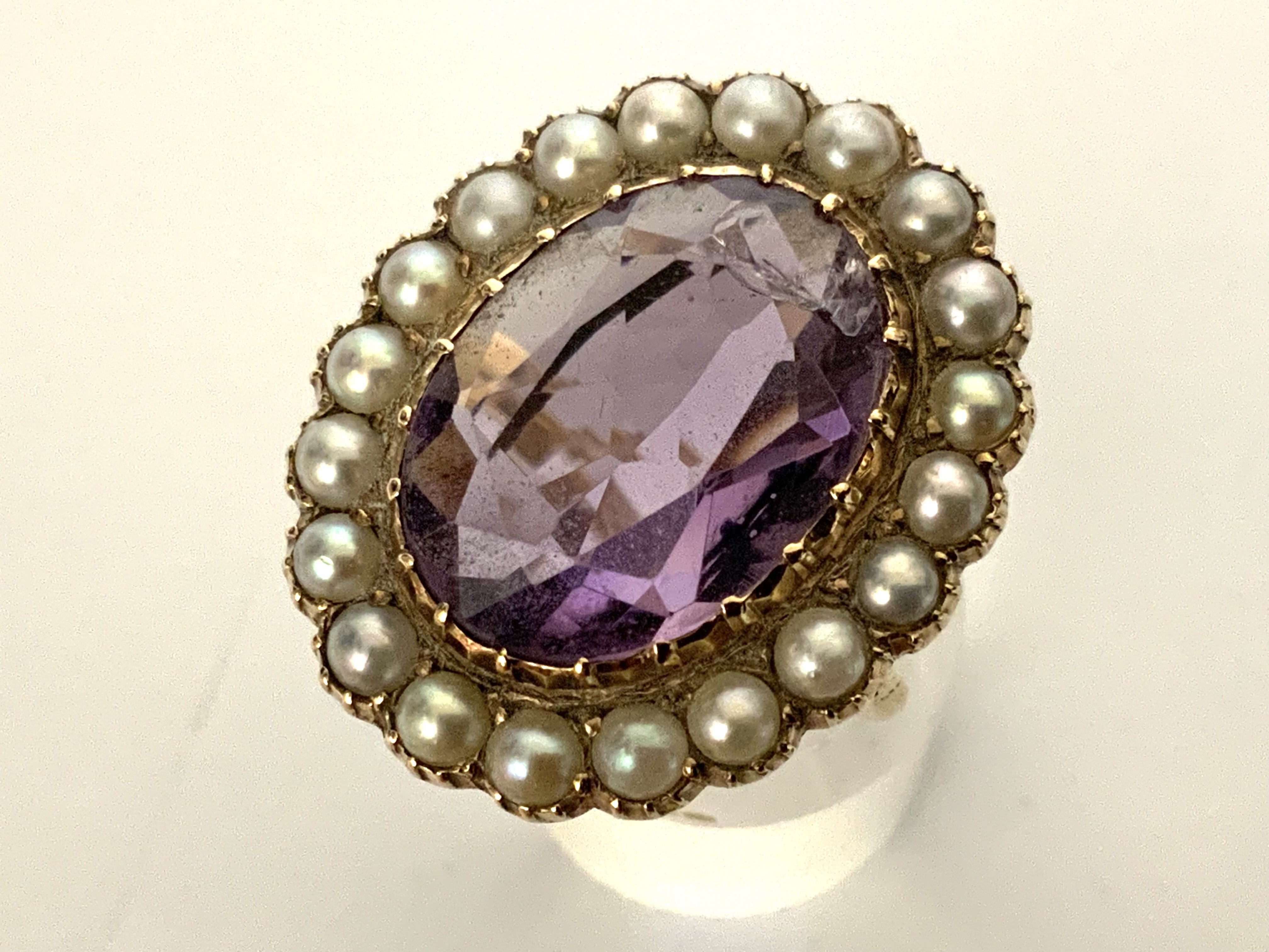A 9ct gold dress ring inset with a large amethyst surrounded by seed pearls. (A)