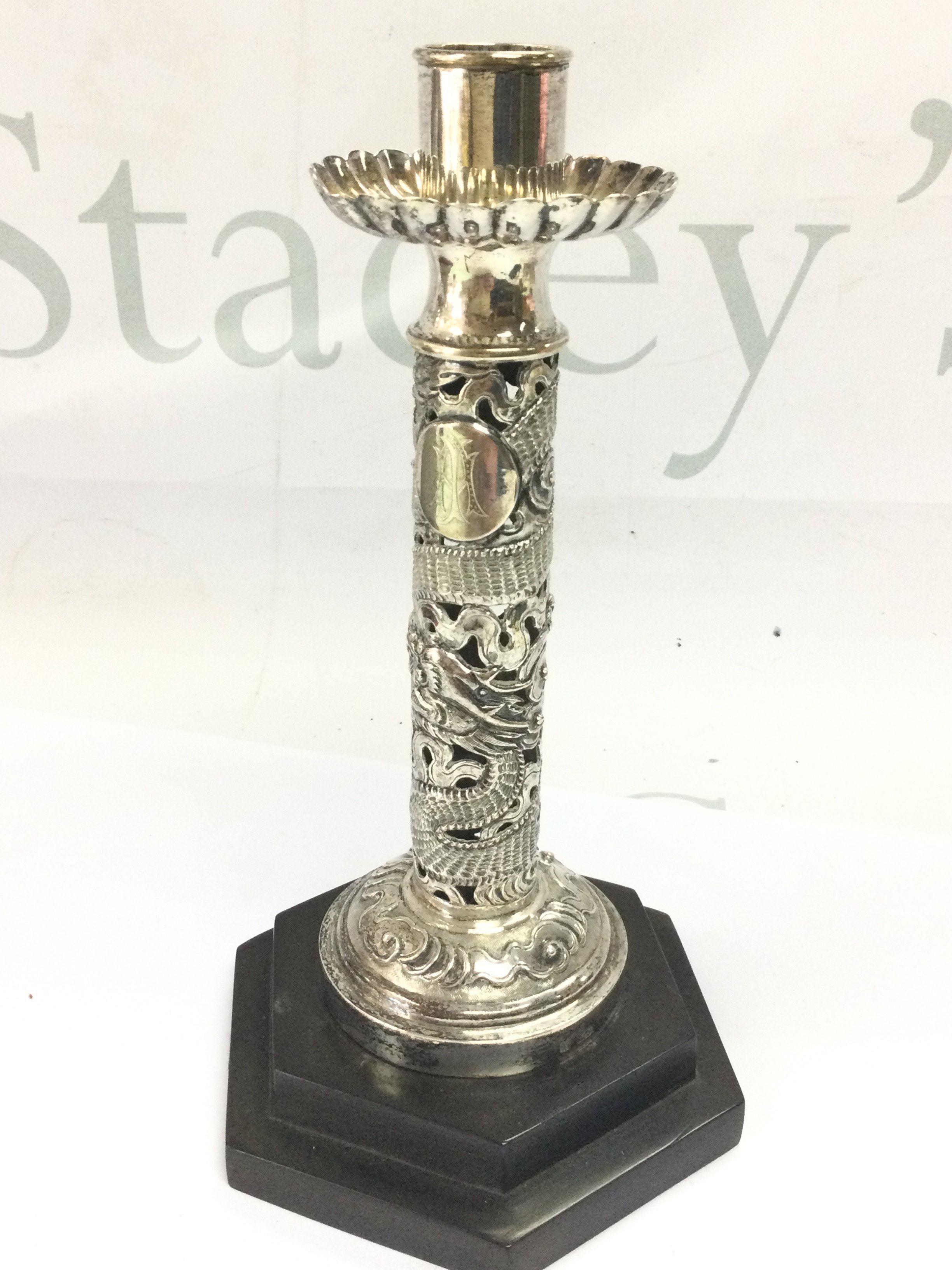 A Chinese silver candlestick with dragon design , 19cm tall. Postage category B