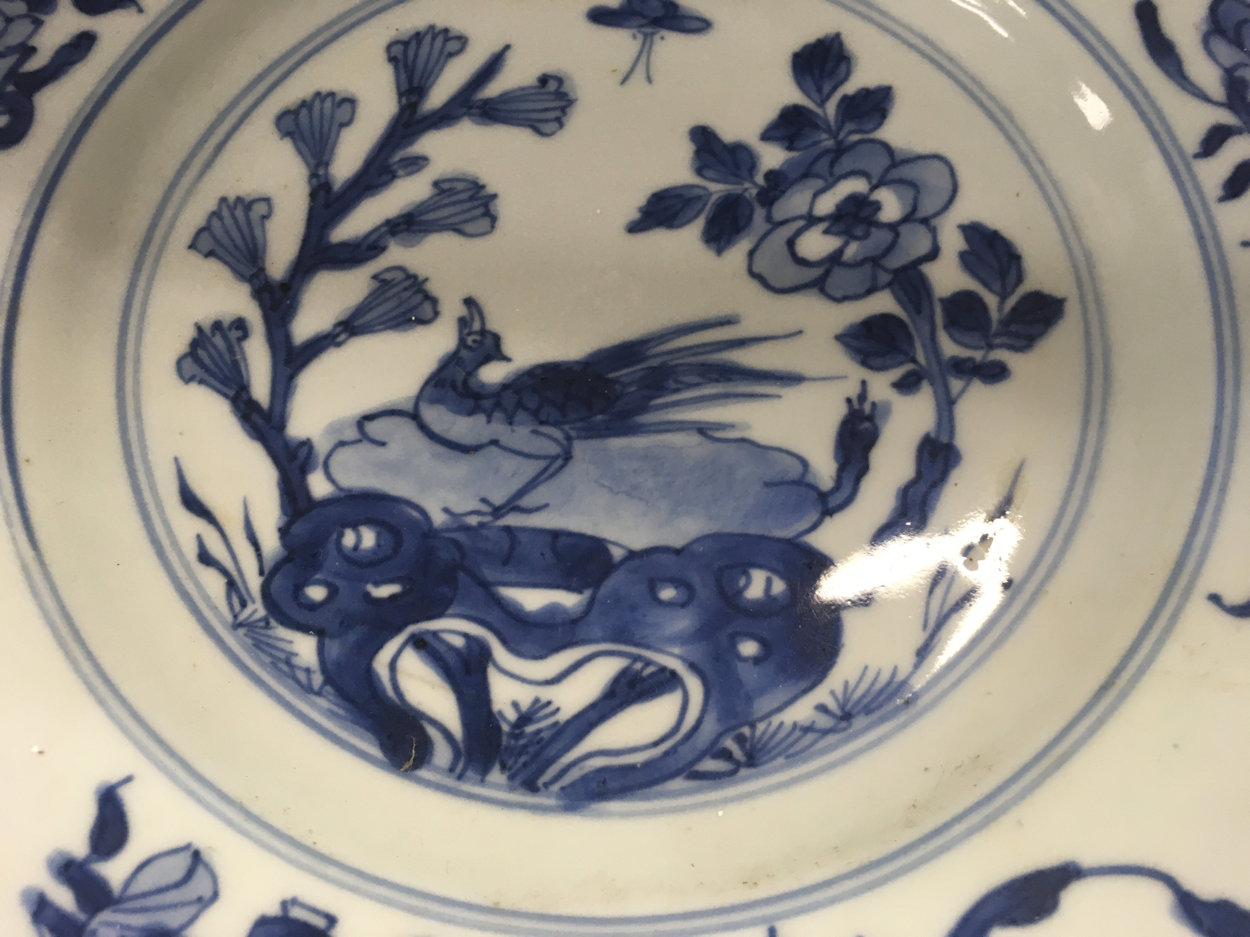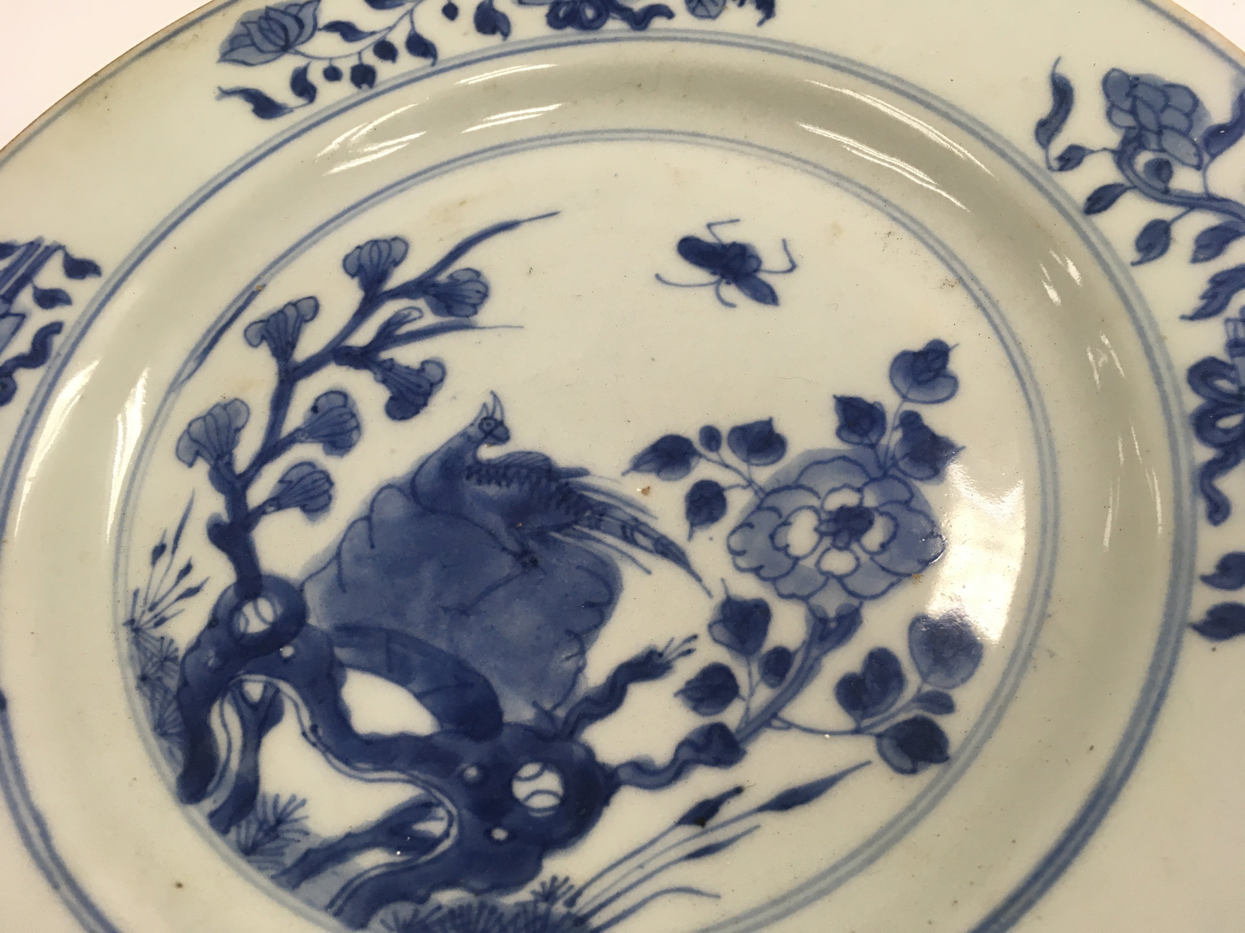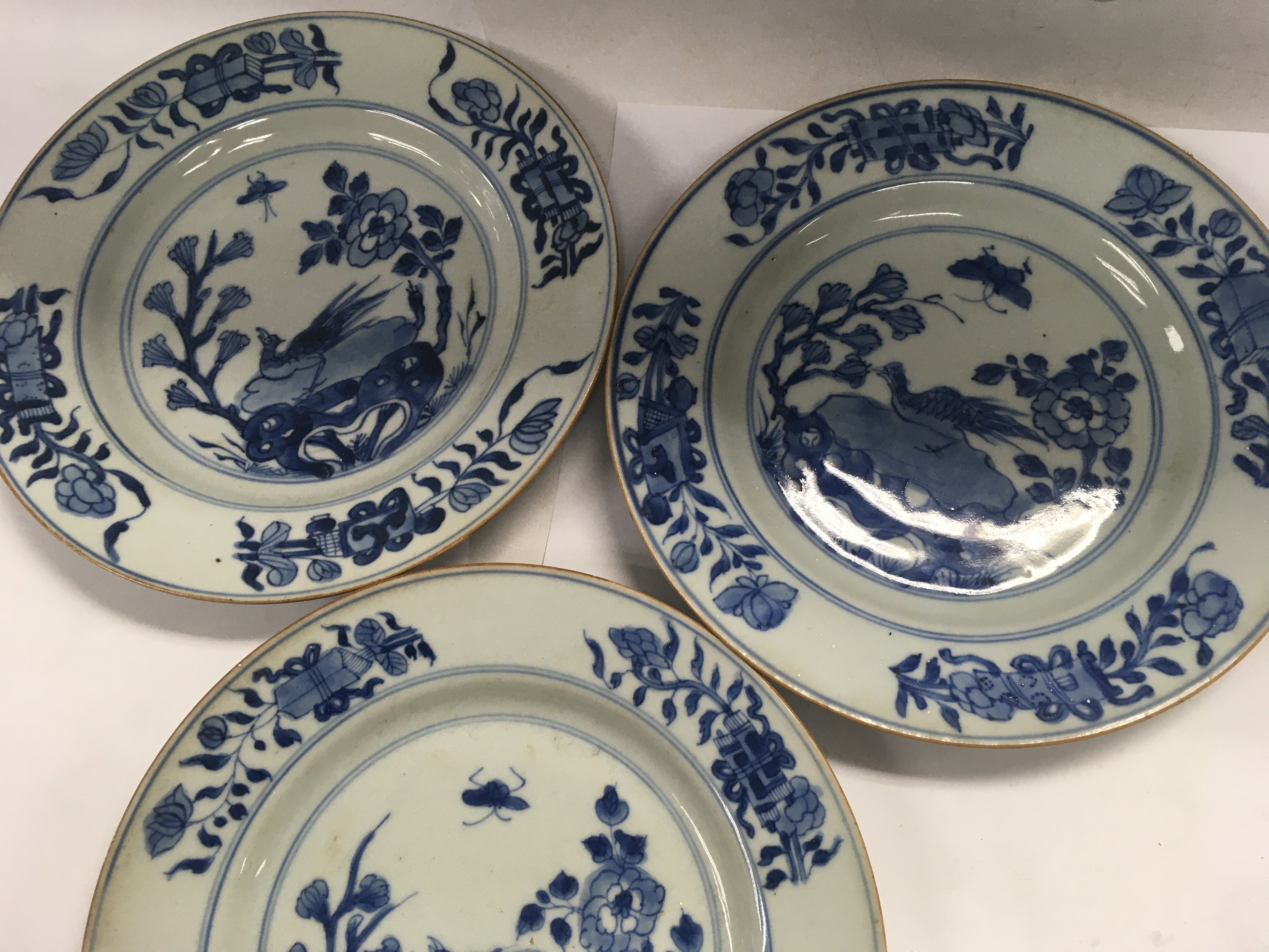 Three Early 19 th Chinese blue and white plates decorated with birds flowers and foliage.