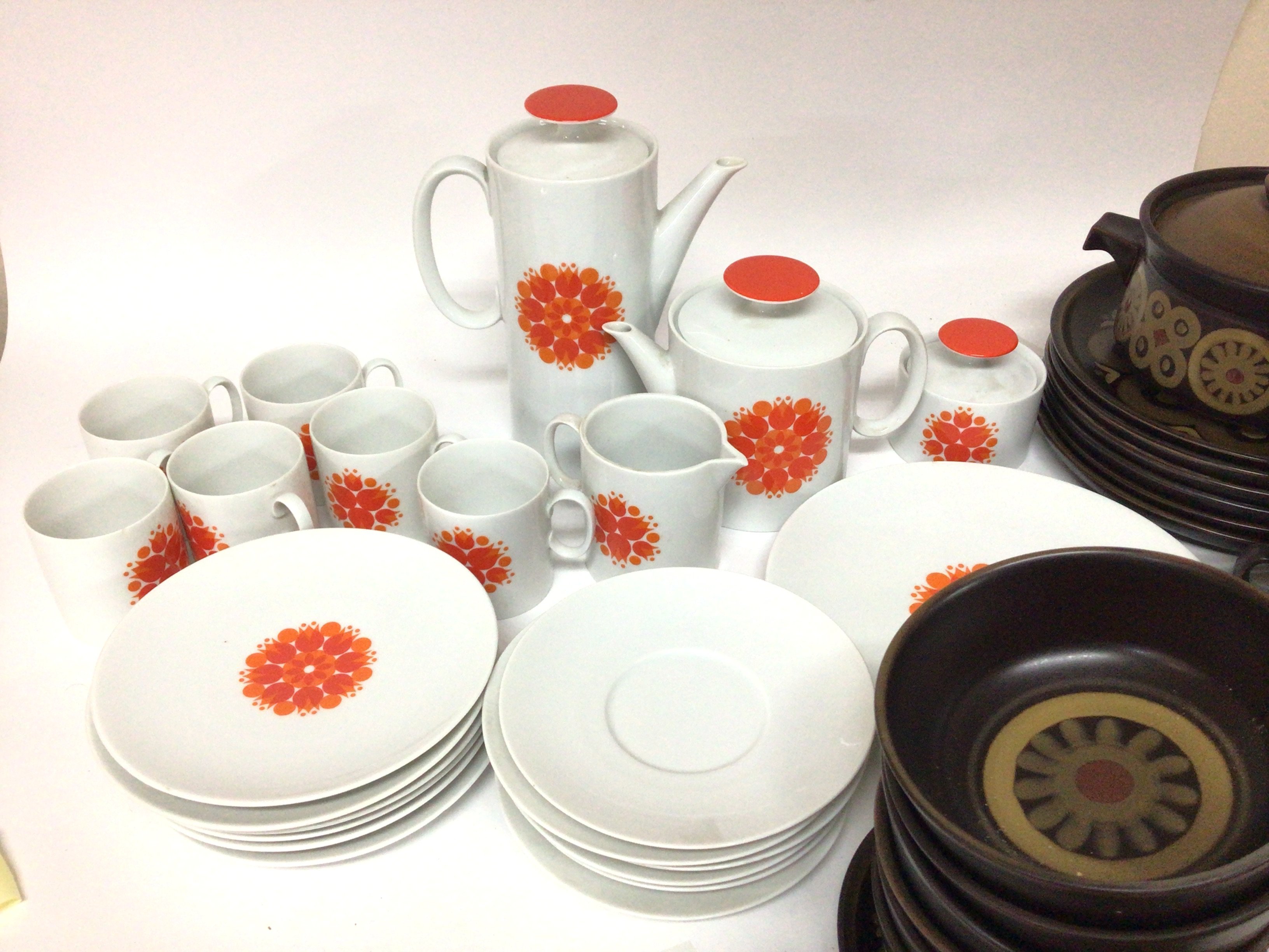 A mid 20th century design Thomas German porcelain tea coffee set with a an orange modern design pattern and a Denby ceramic dinner and tea set dark brown pattern. NO RESERVE