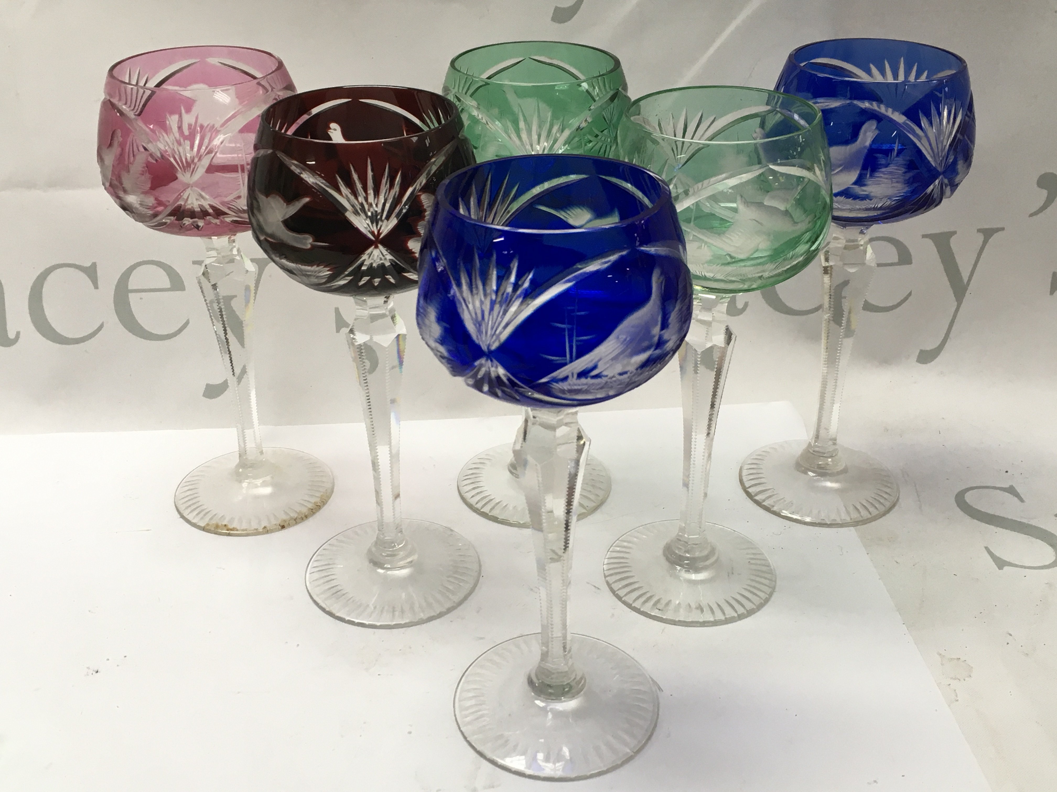 A set of 6 bohemian Glasses with pheasant design, this lot cannot be posted NO RESERVE