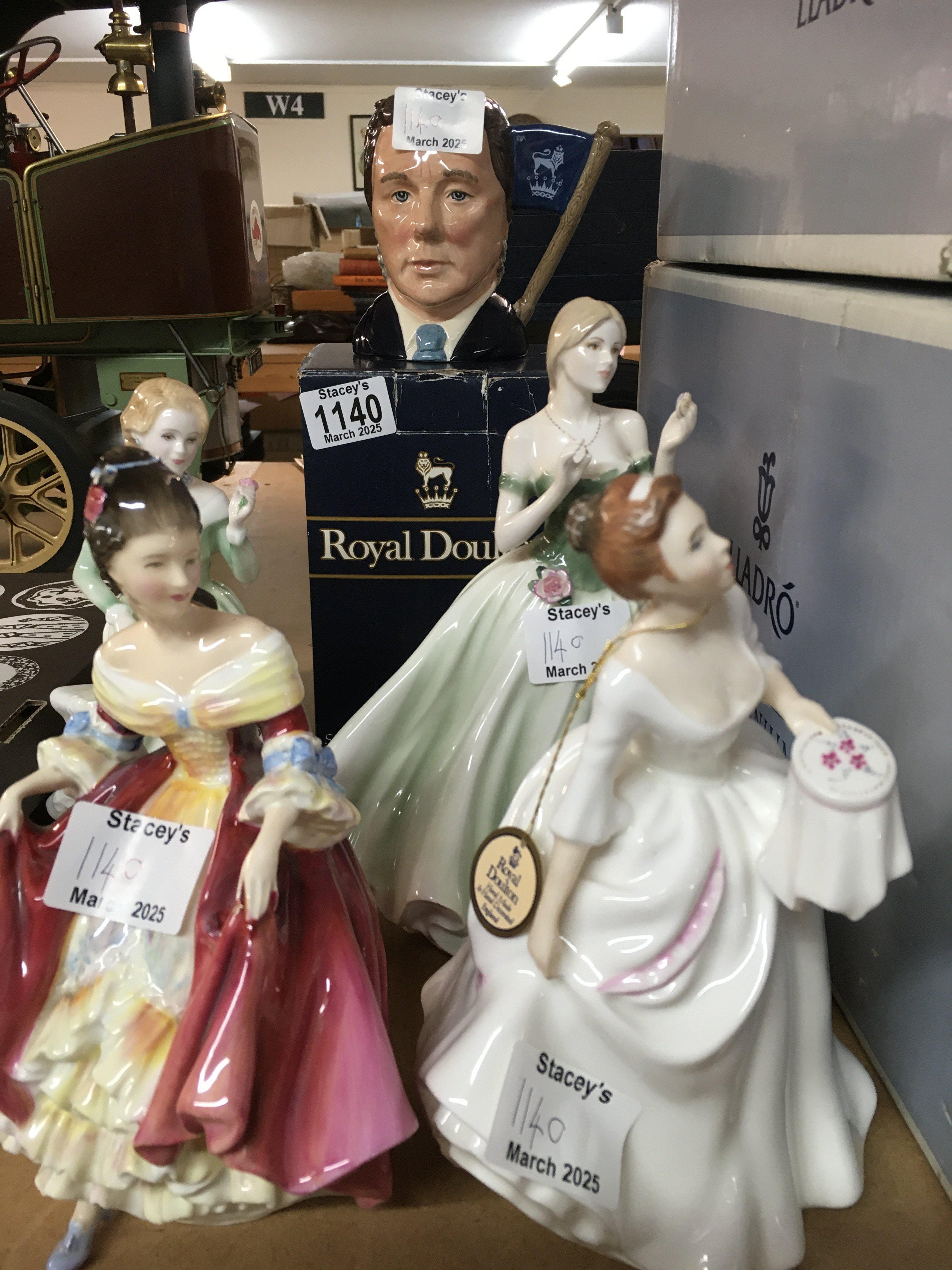 WITHDRAWN - Four Doulton figures a small character jug a boxed English enamel together with two Gaudi plates NO RESERVE