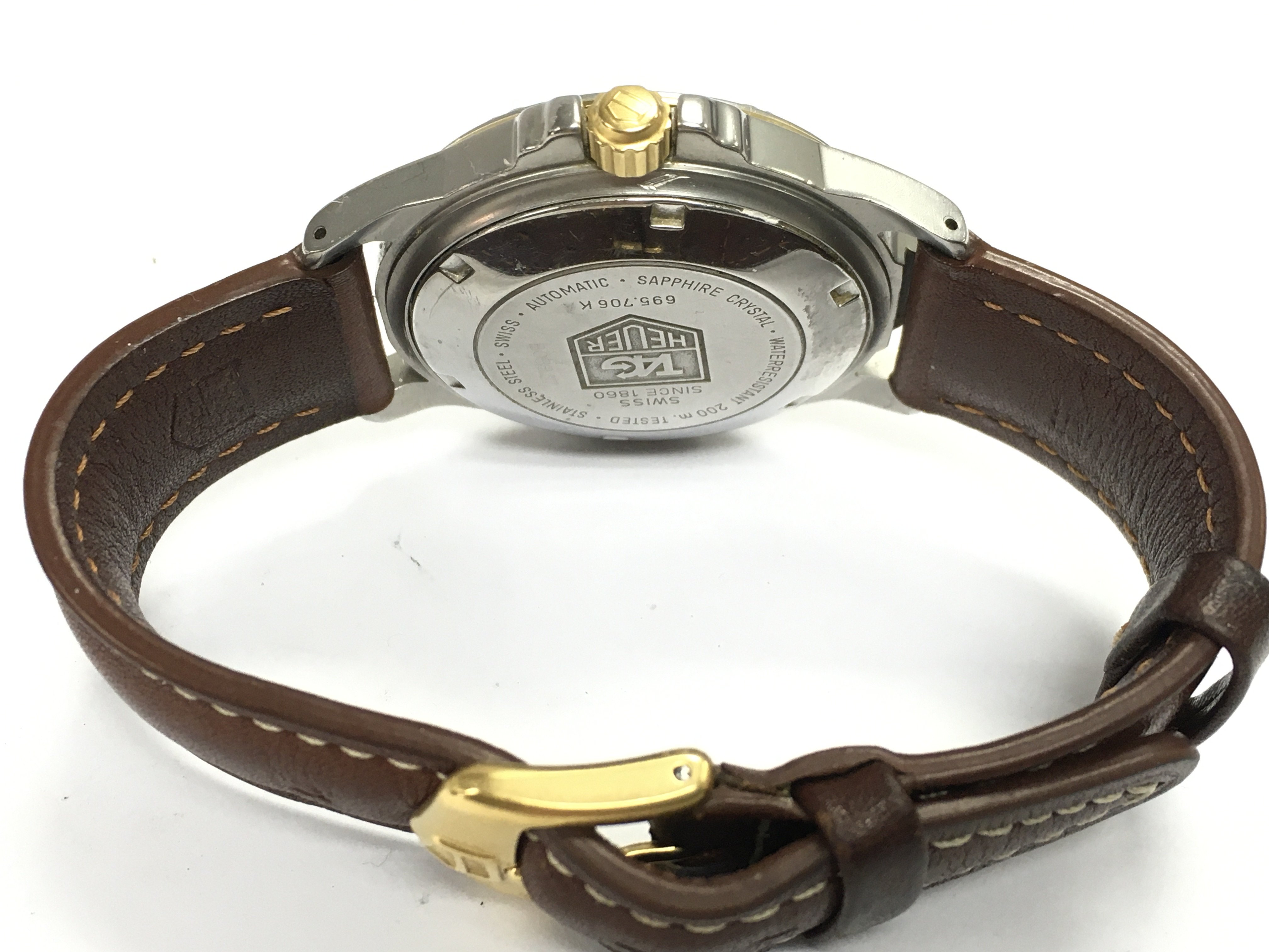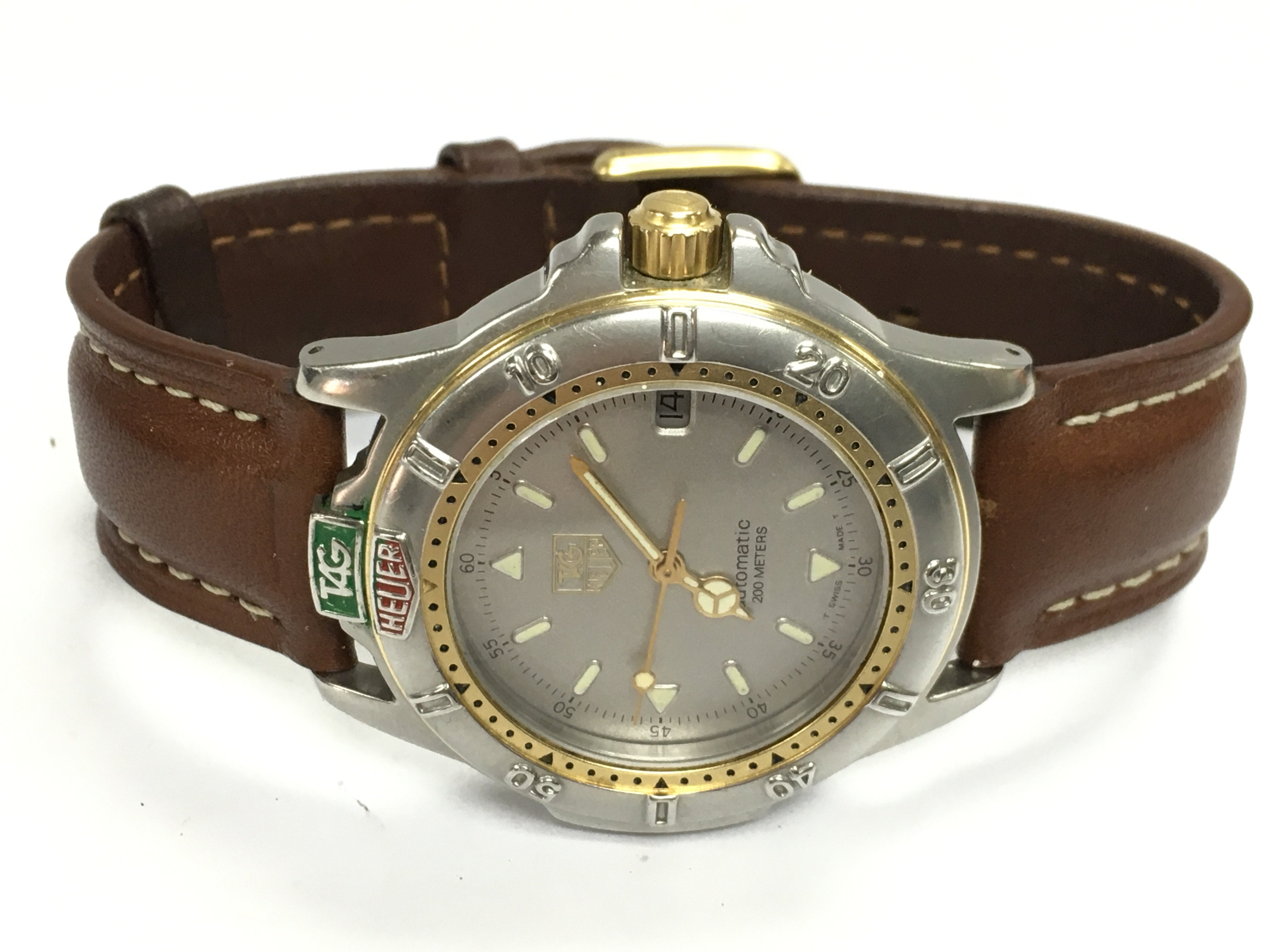 a Tag Heuer automatic 200 metres mens watch with a leather strap. Seen working Postage category A