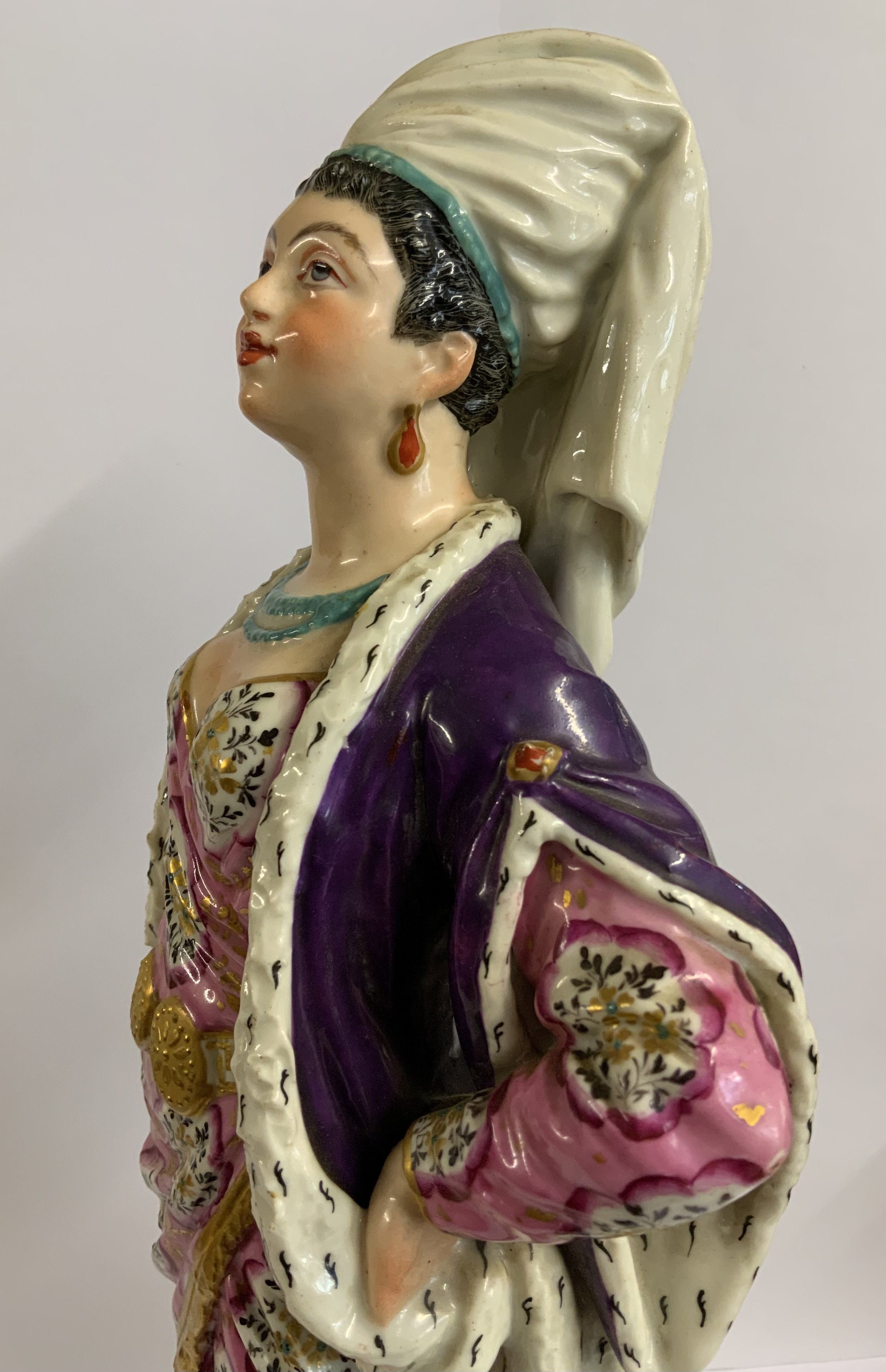 A rare large porcelain figure of an eastern lady with Derby porcelain marks, 34.5cm. (D) this figure is mentioned in by J.Twitchett p.71 in a group of 18. Dates 1830-1847. Neales 1985 Alma country house sale.