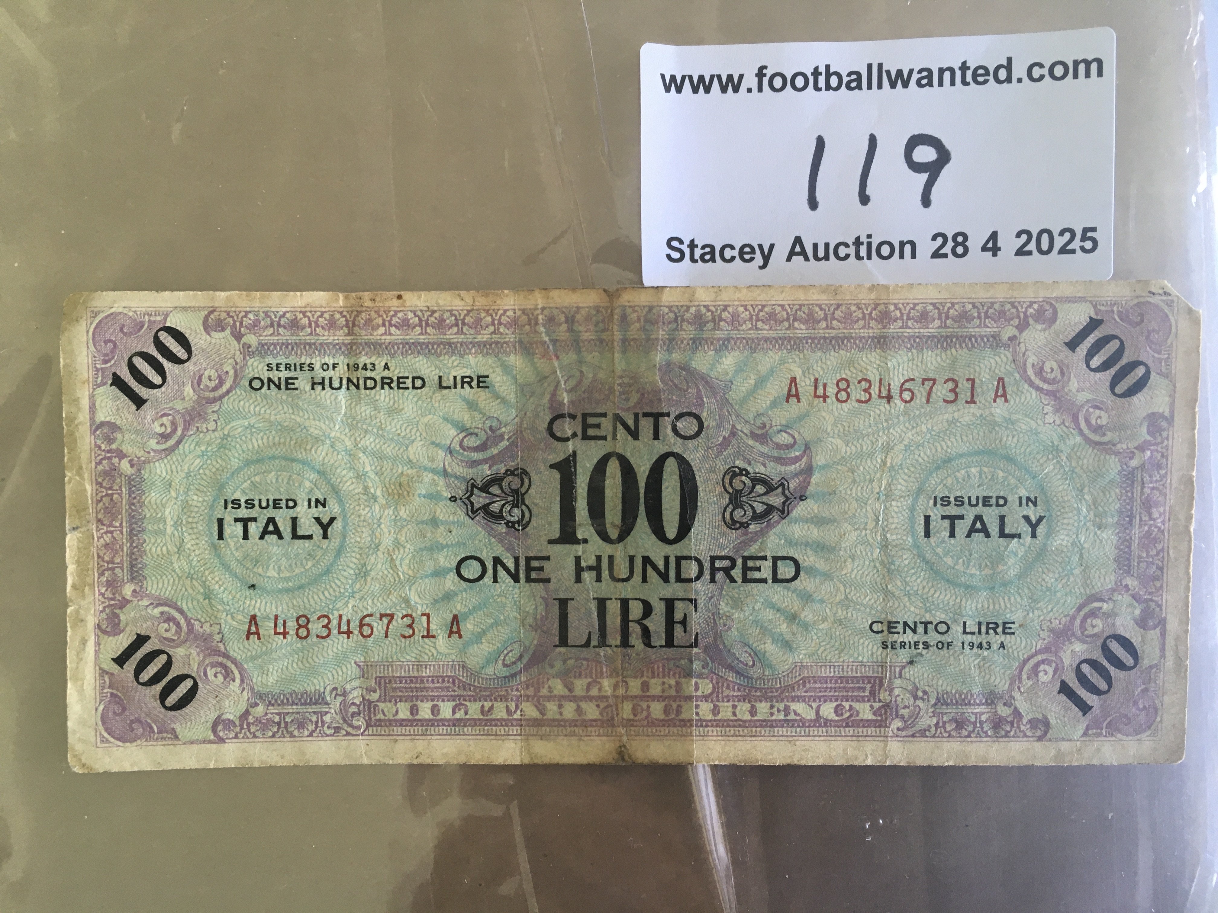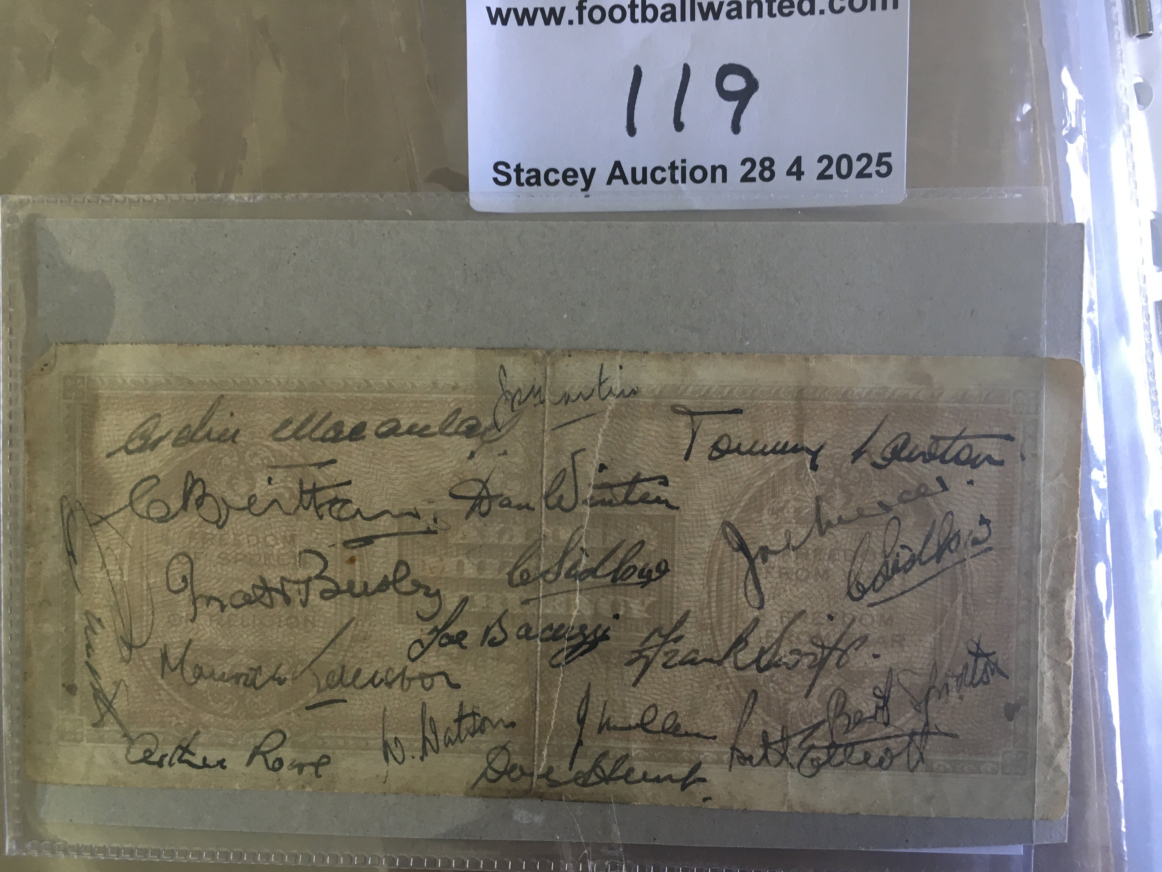 1940s England Football Stars Signed Item: A 100 lira bank note obtained by a soldier when either a Forces team or English FA team toured Italy. 19 autographs include greats such as Tommy Lawton Matt Busby Joe Bacuzzi Arthur Rowe Frank Swift Archie Macauley and Joe Mercer.