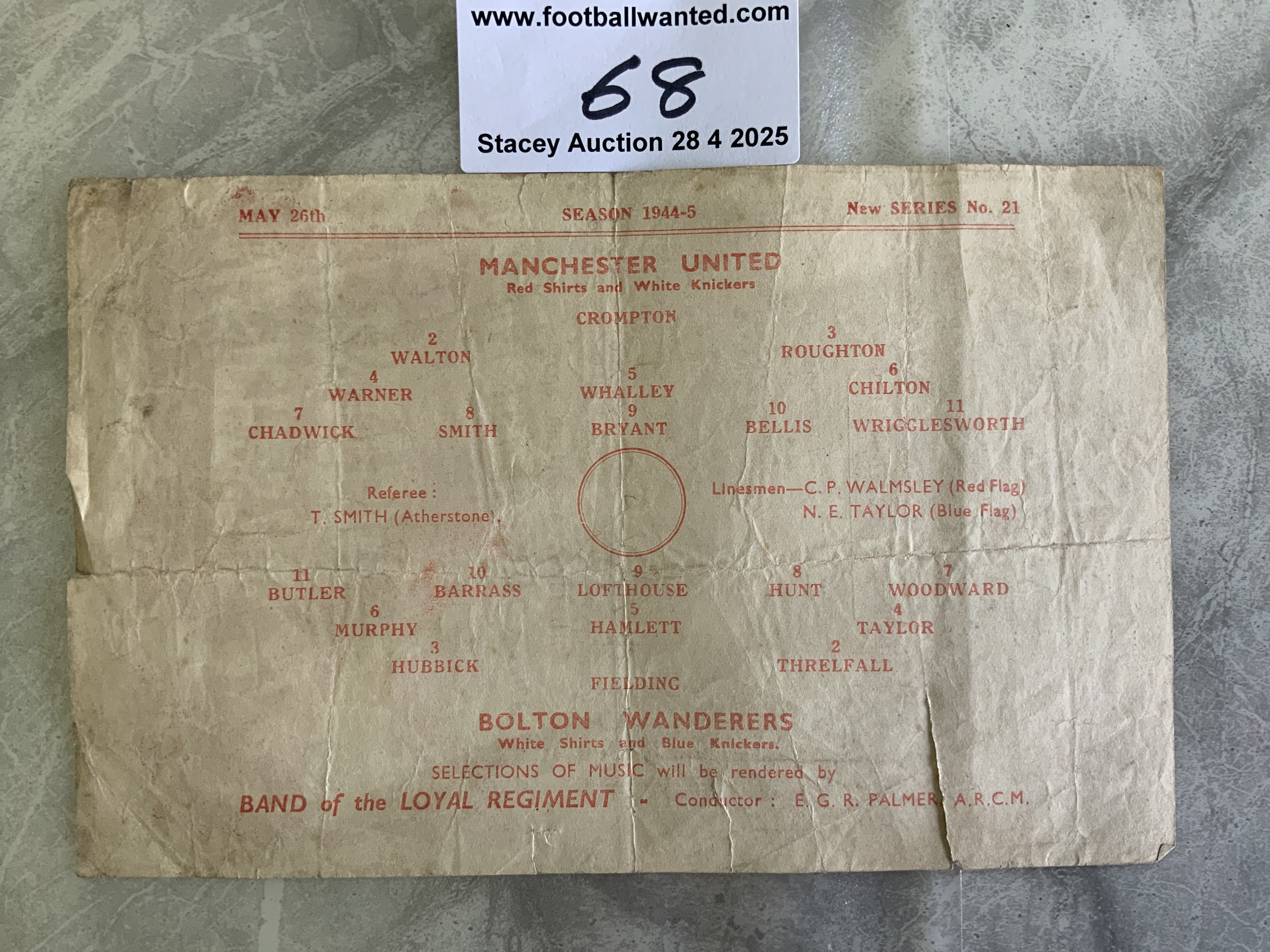1945 Manchester United v Bolton War Cup Final Football Programme: Single sheet for the North final 2nd leg at Old Trafford. Fair condition with no team changes. Few tears on the folding.