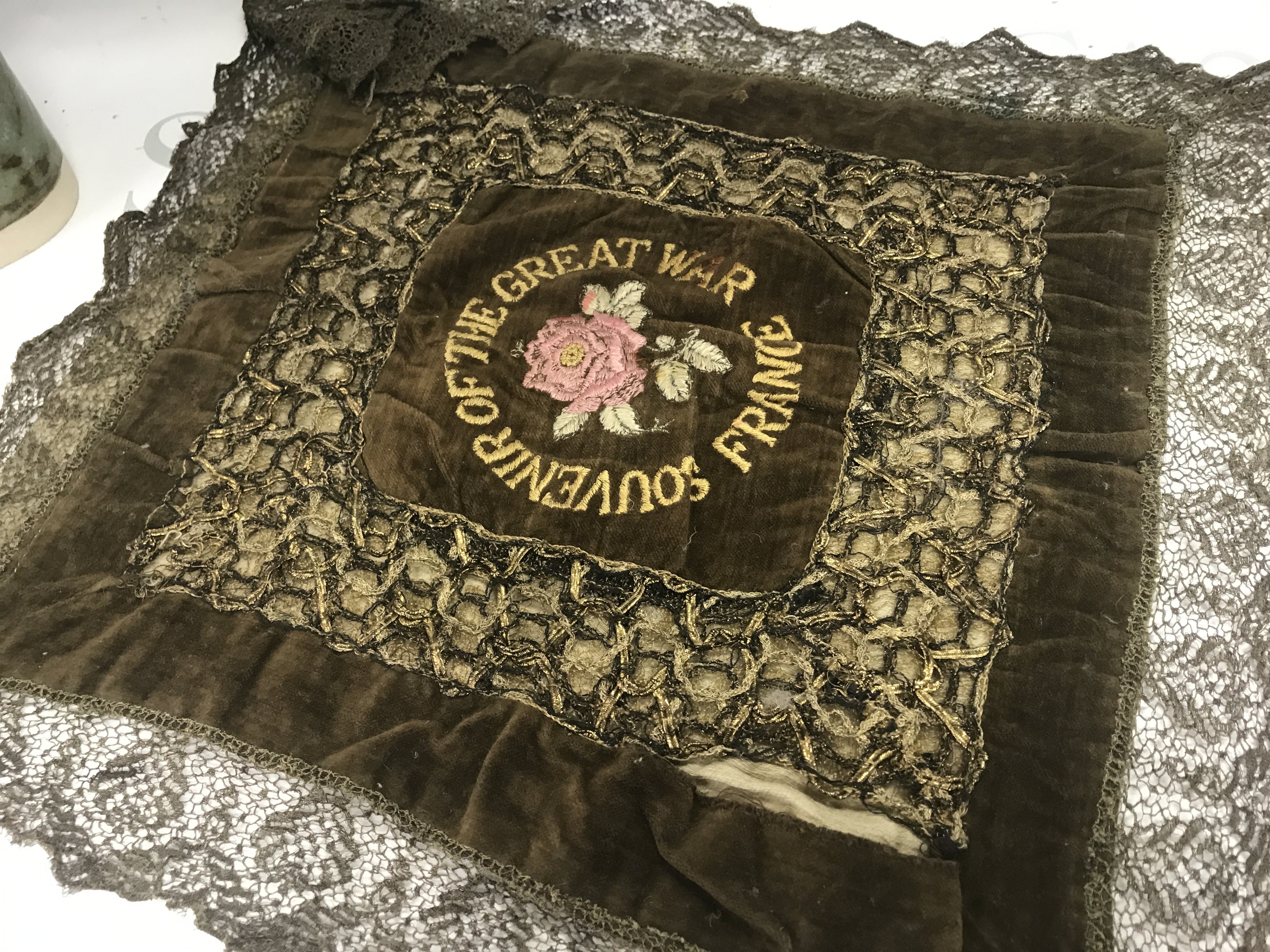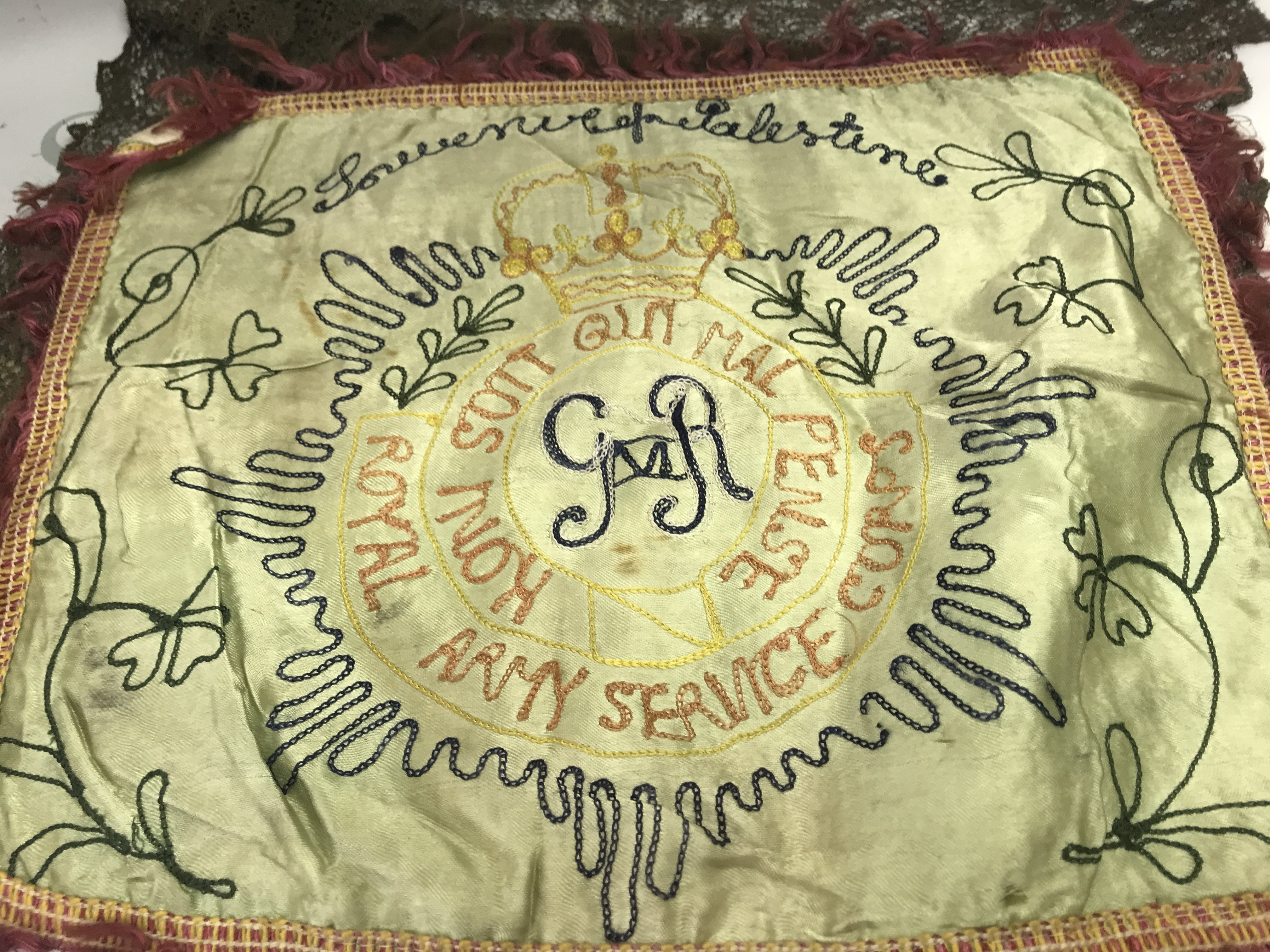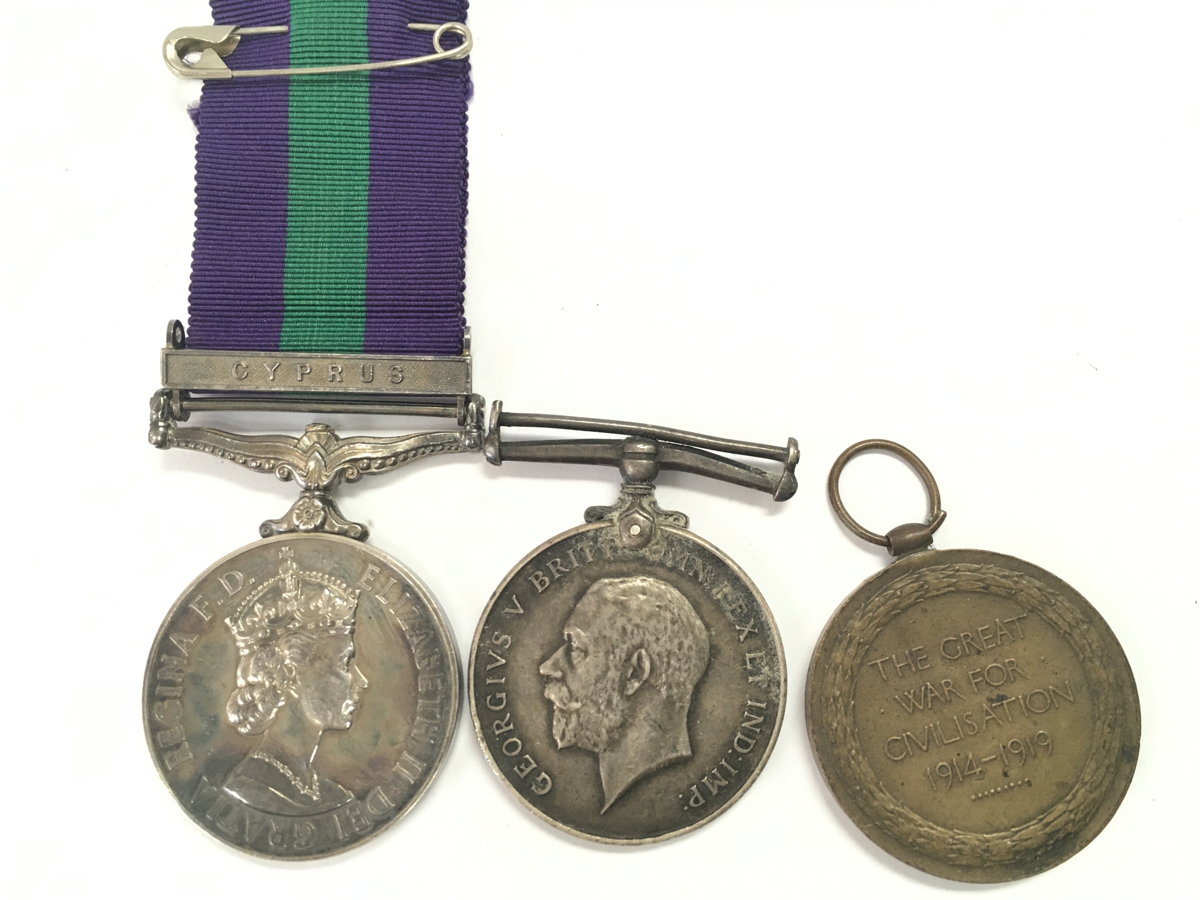 A British General Service medal with Cyprus bar presented to 5048190 A.C.2 E.R Kirby R.A.F, Two WW1 presented to L-1113 DVR.C.A Bridges .R.A including a defence medal and a victory medal. A circa 1920s vintage The Raleigh Cycle Company promotional/advertising pin badge . Trench art WW1 needlework Postage category A