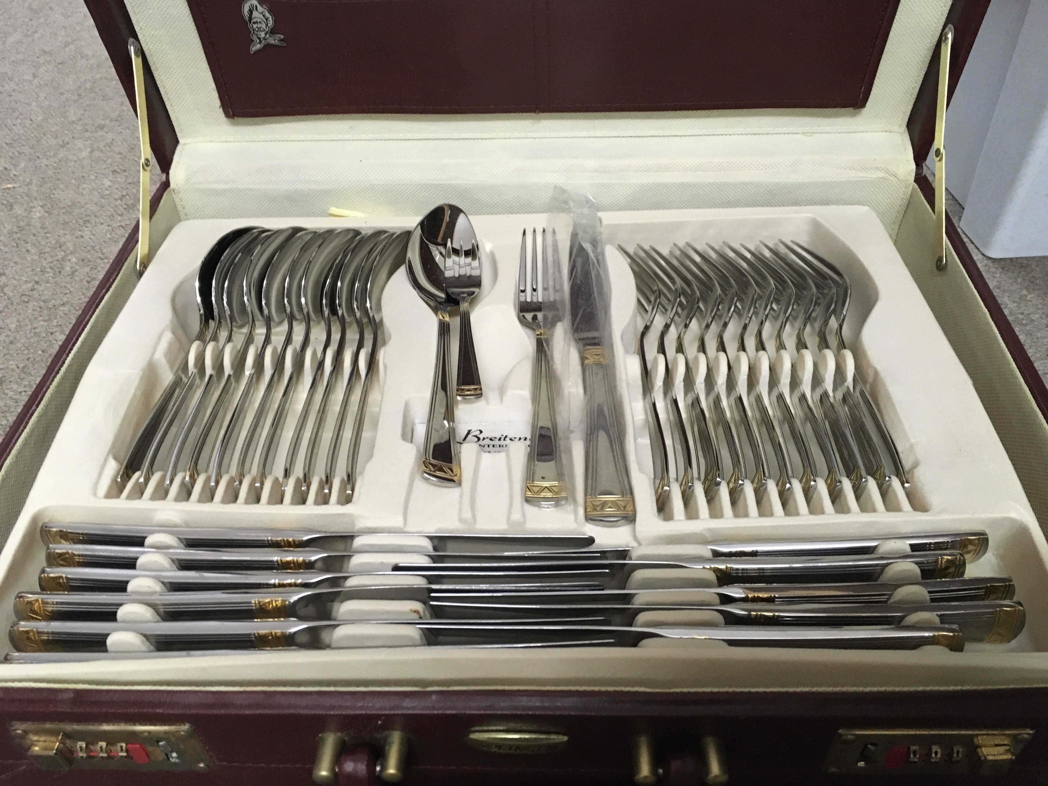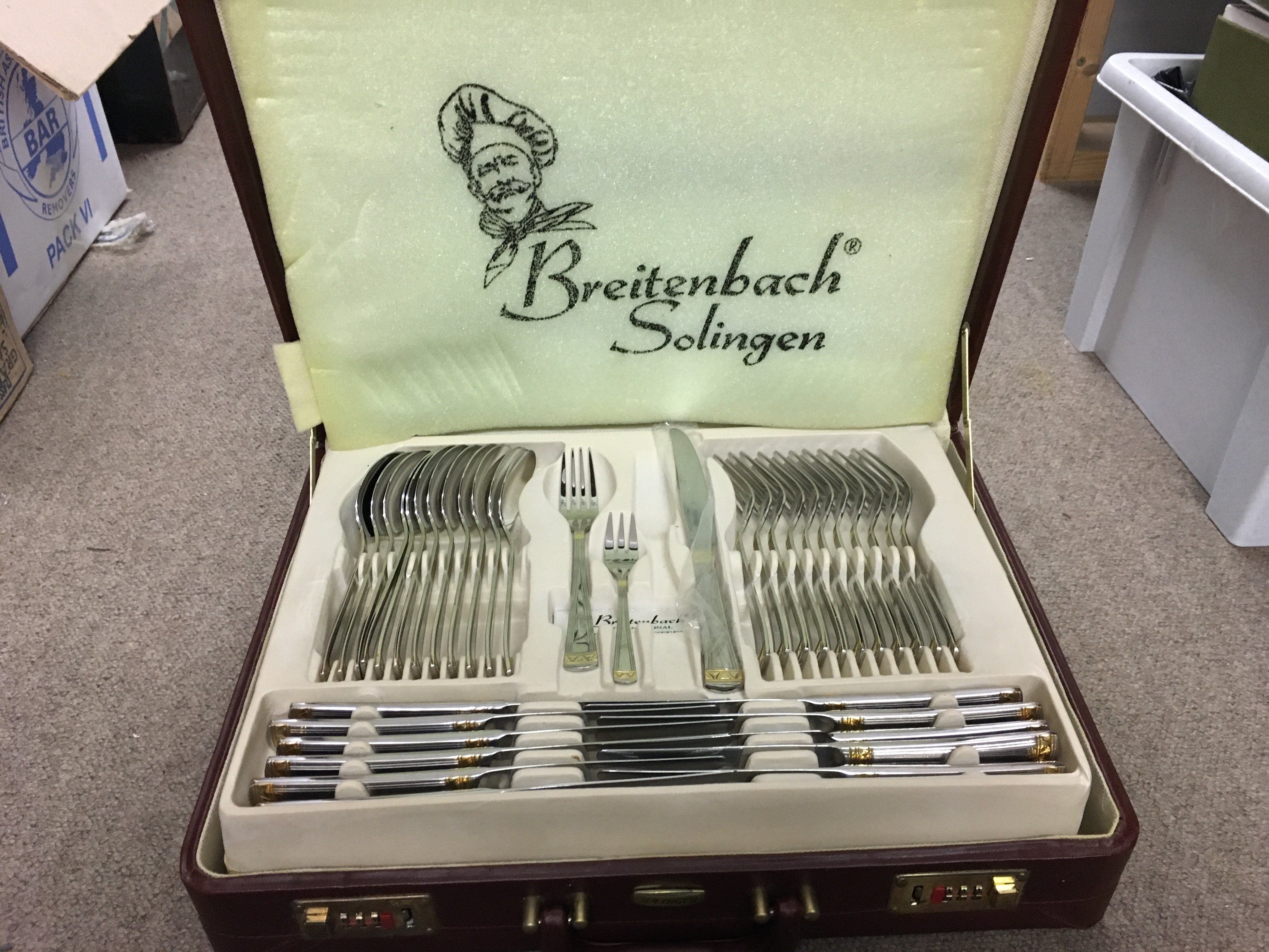 Cased Breitenbach Solingen stainless steel cutlery canteen containing forks, spoons, knives etc. postage category c
