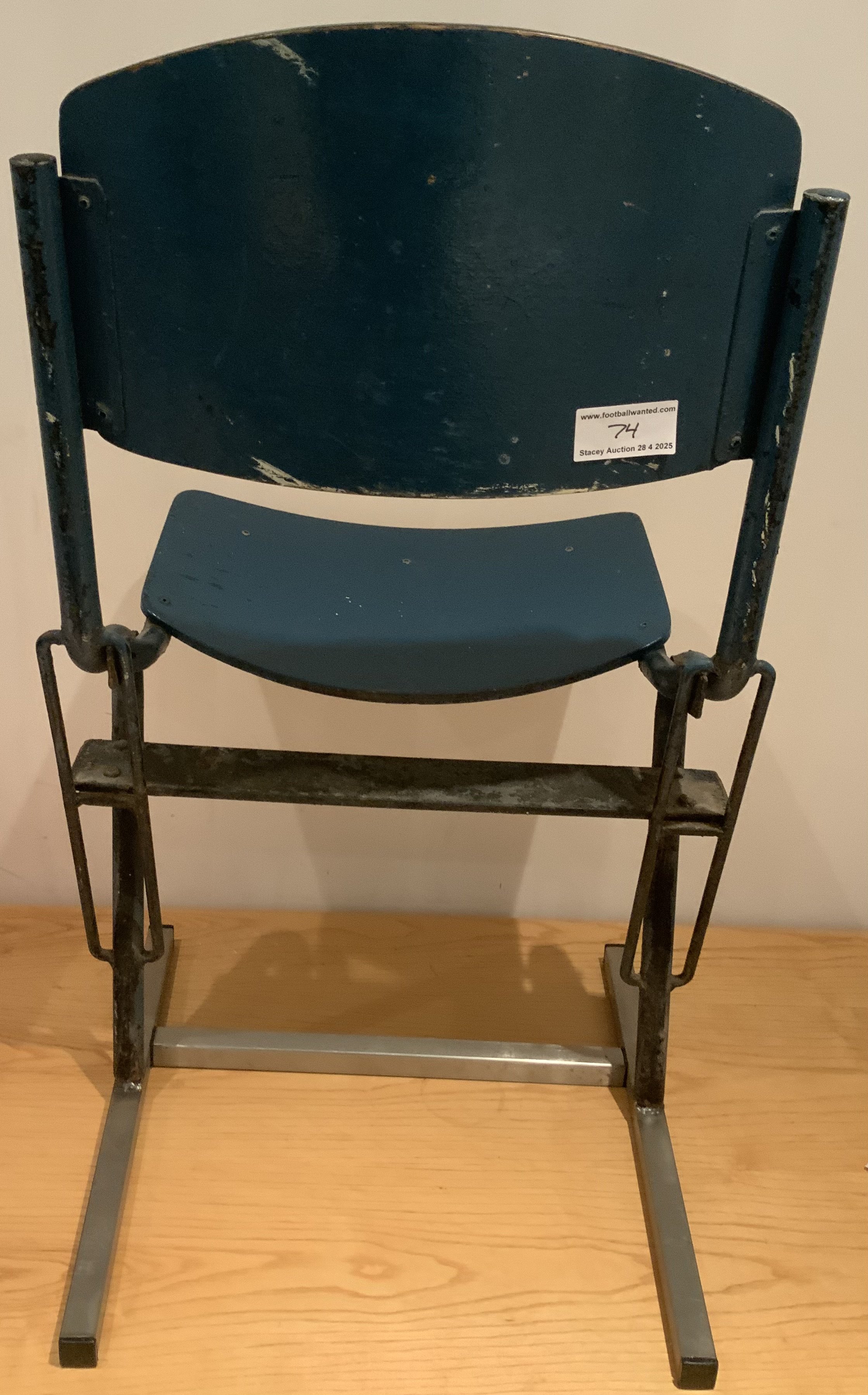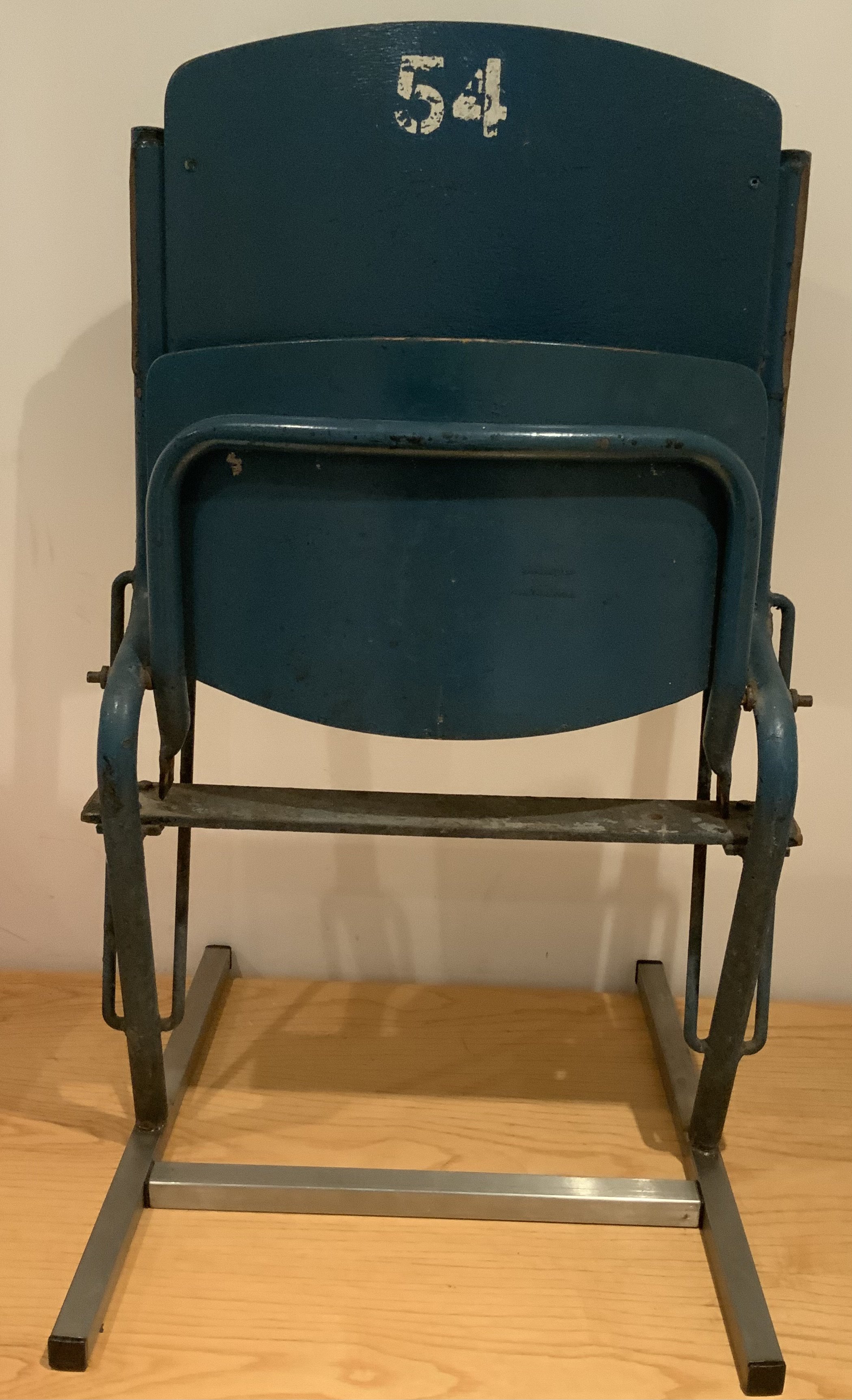Old Wembley Football Stadium Original Seat: Not many whole seats made it out of the old Wembley after its closure in 2001. There was a contract for some seat backs to be removed though. This is the whole seat cut where it entered concrete. A stand has been made for it to slot into so its fully useable in a man cave or museum. Blue seat still has number 54 and has original blue paint.