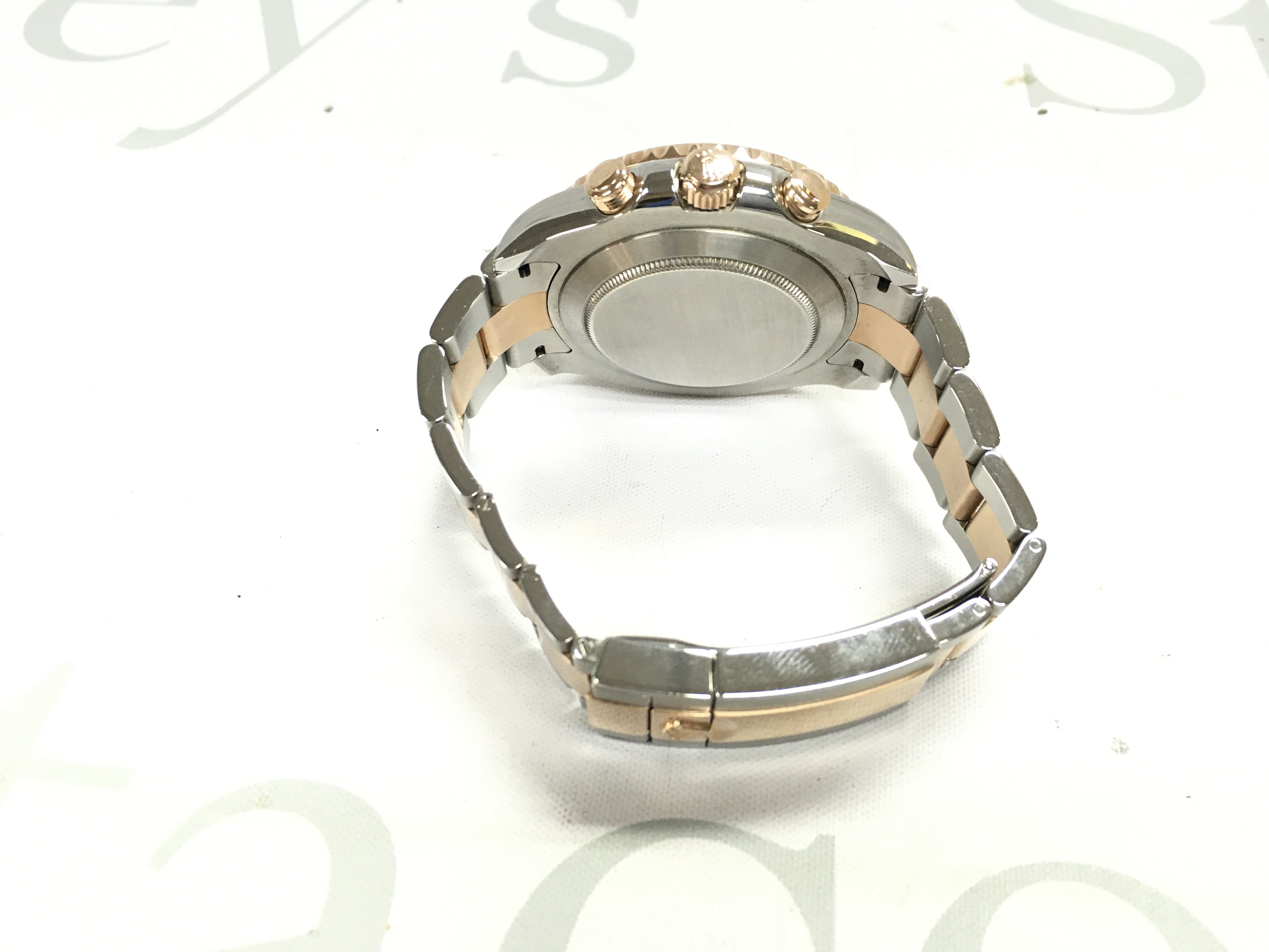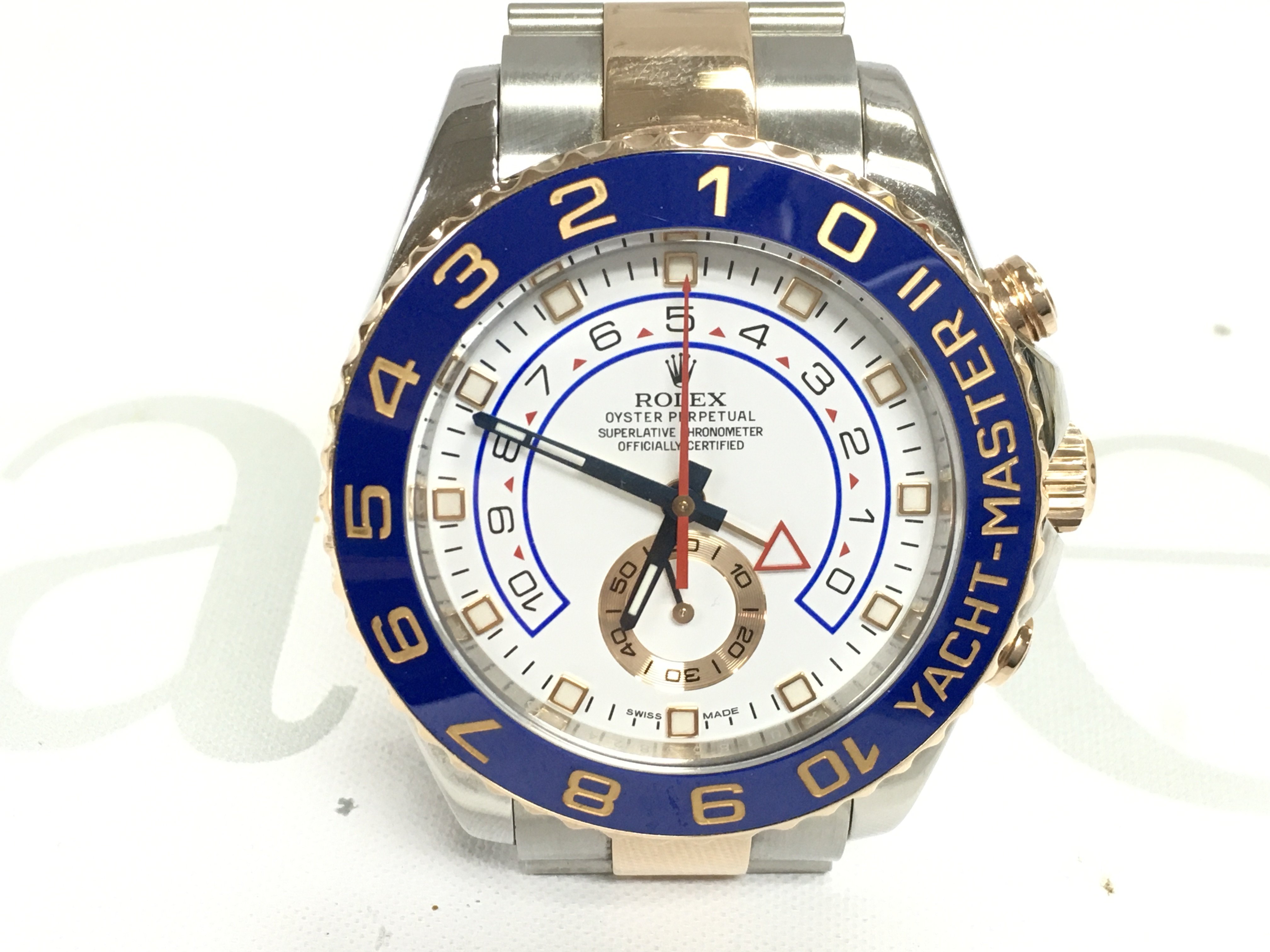 A Rolex yacht master II 2015 comes with box papers and swing tags. 44mm case with steel and gold oyster bracelet. White dial. Seen running. Model 116681.