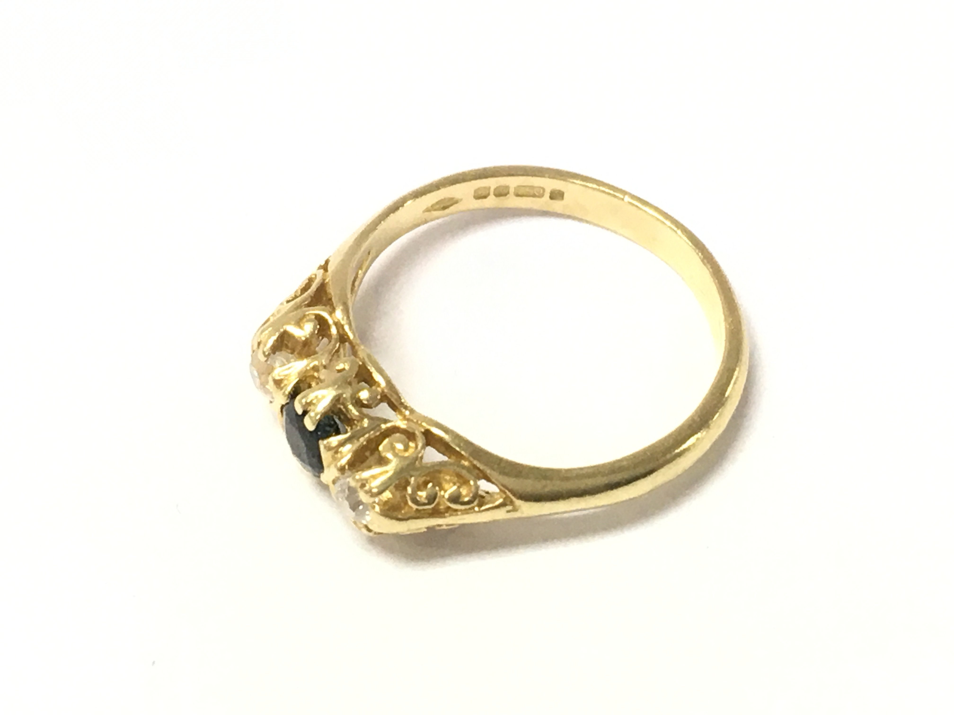 An 18ct gold sapphire and diamond three stone ring. Size L and 3.35g Postage A