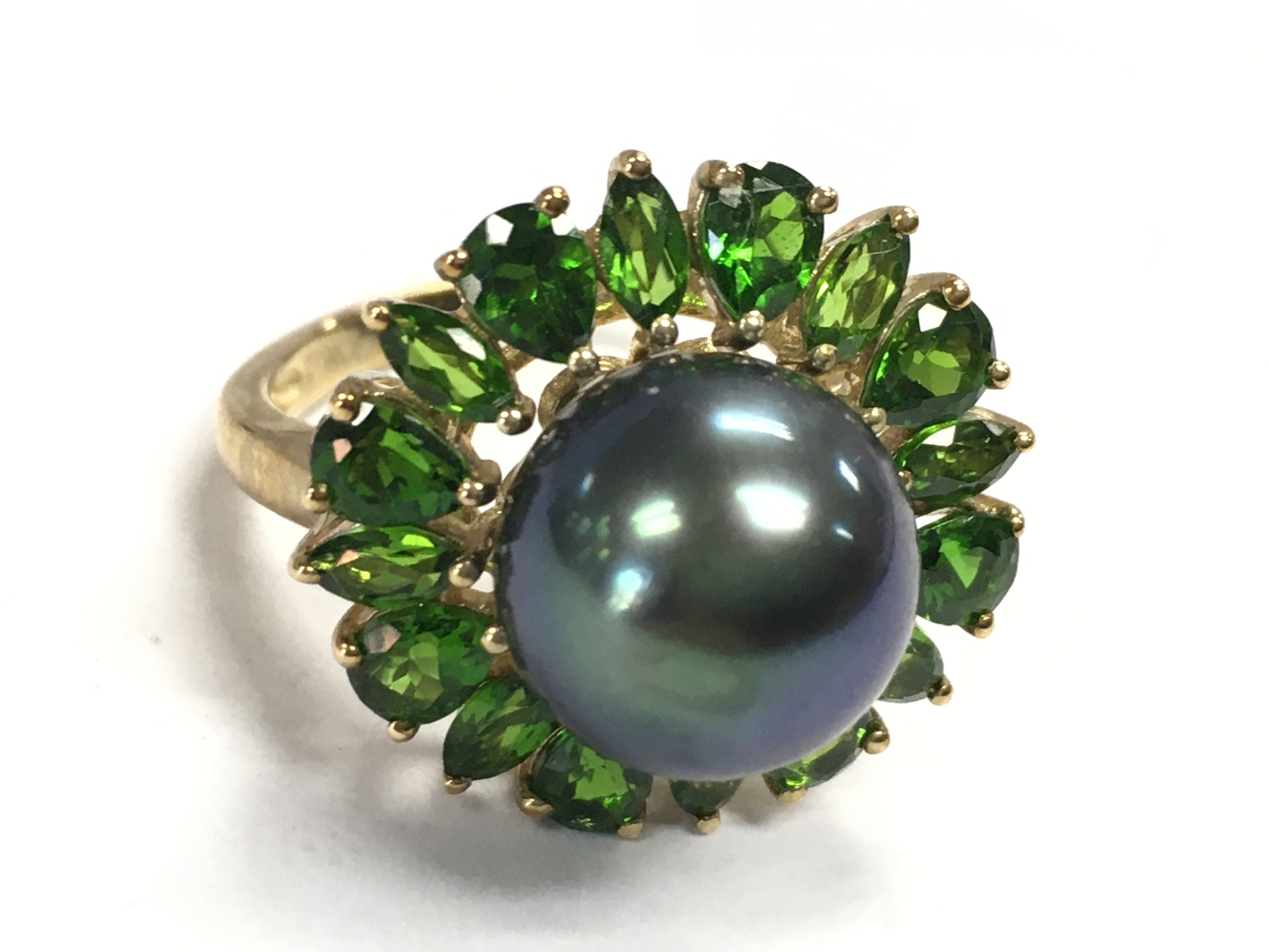 9ct Yellow Gold Black Tahitian Pearl and Diopside Cluster Ring, size P, 5.2g total weight. Postage category A