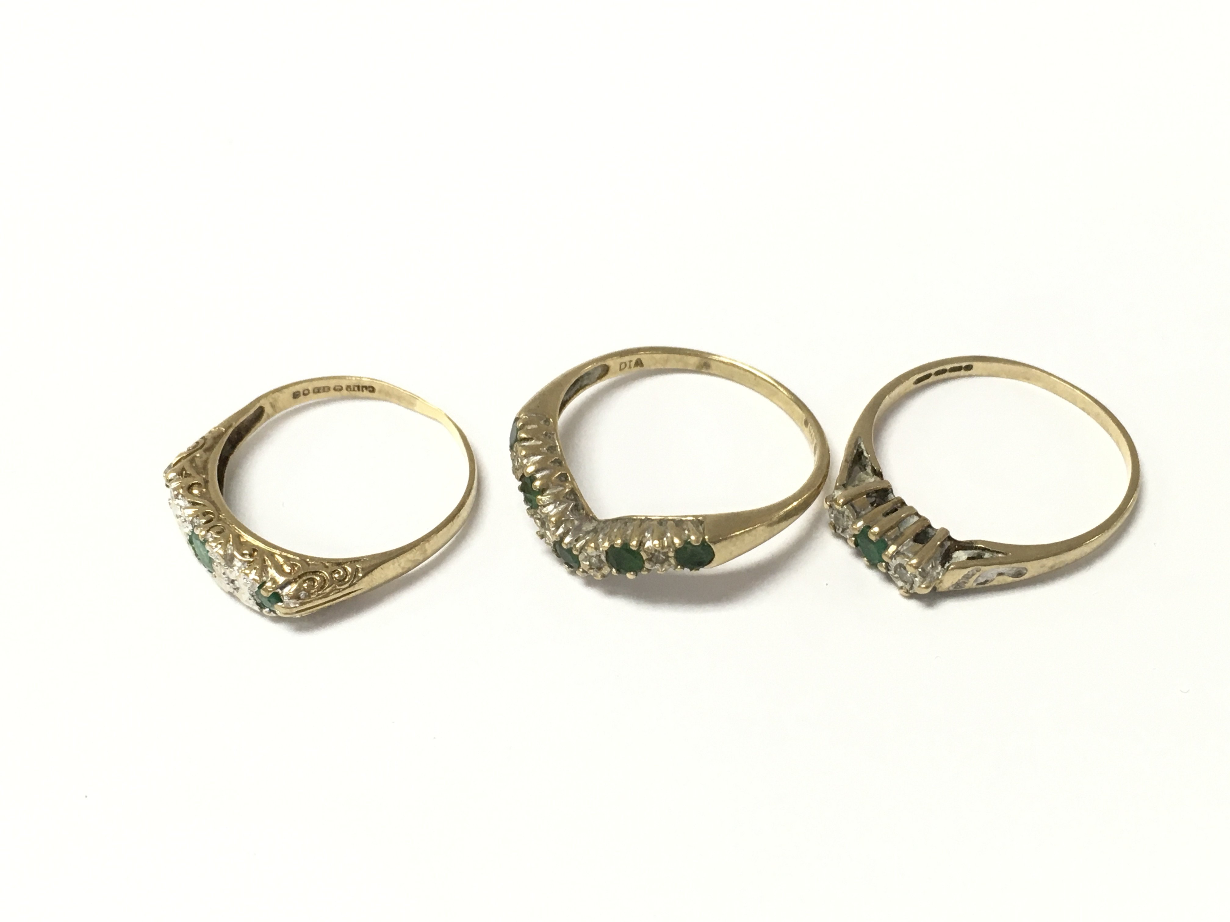 Three 9ct gold emerald and diamond rings. 5.43g Postage A