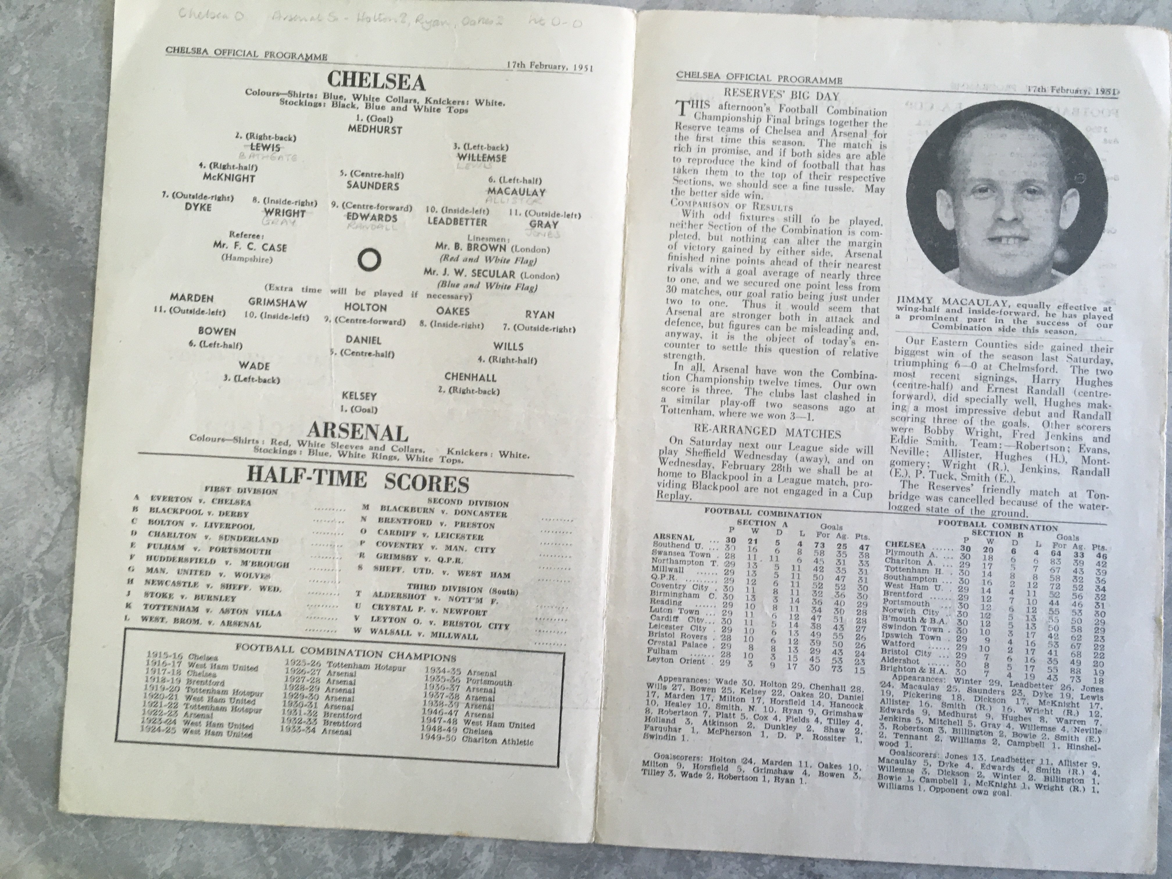 1951 Combination Cup Final Football Programme: Chelsea v Arsenal dated 17 2 1951. Very good condition 4 pager with no team changes. Lightest fold.