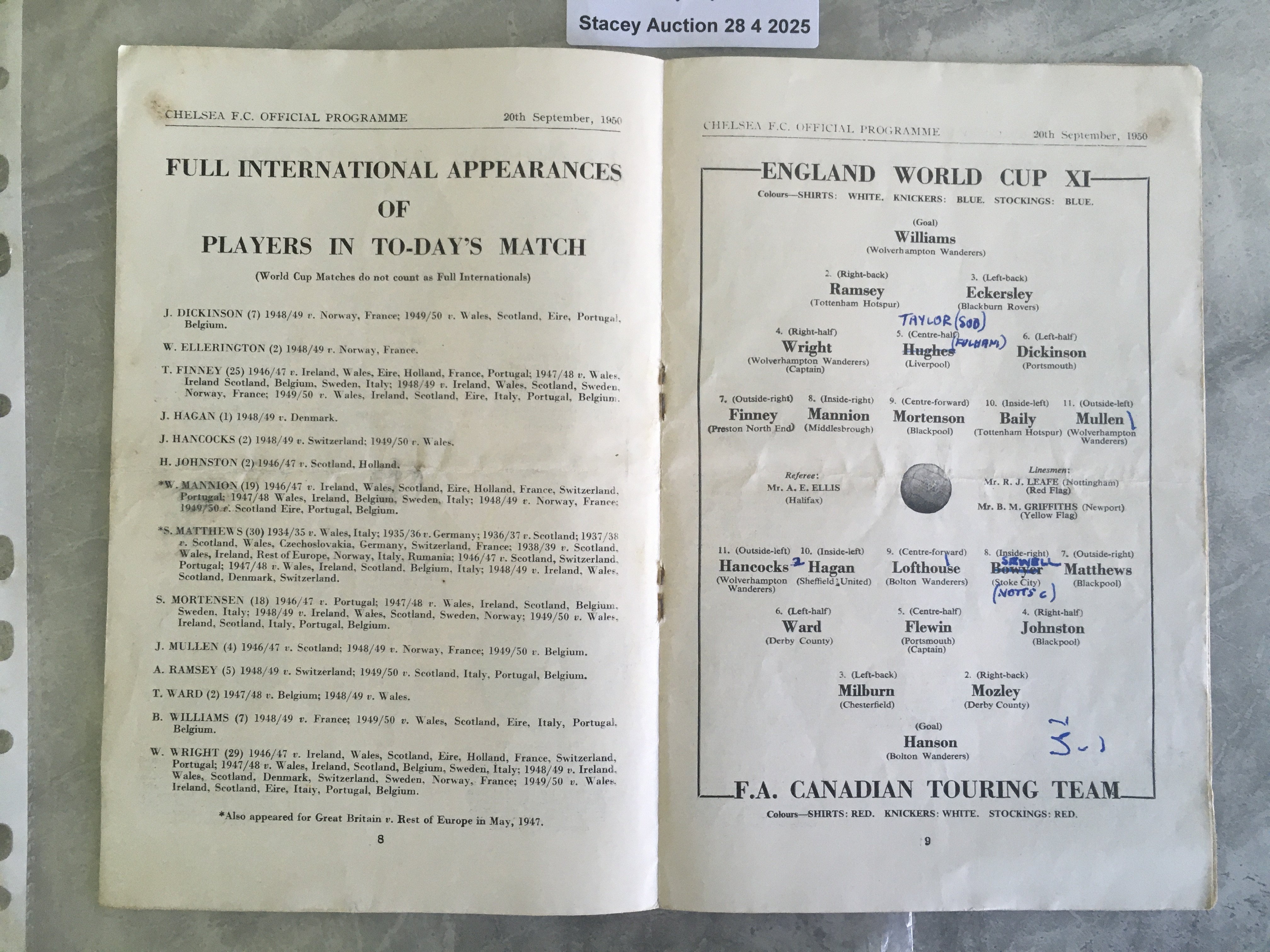 1950 Charity Shield Football Programme: Played at Chelsea between England World Cup X1 and FA Canadian Touring Team. Good condition with team changes and light fold.