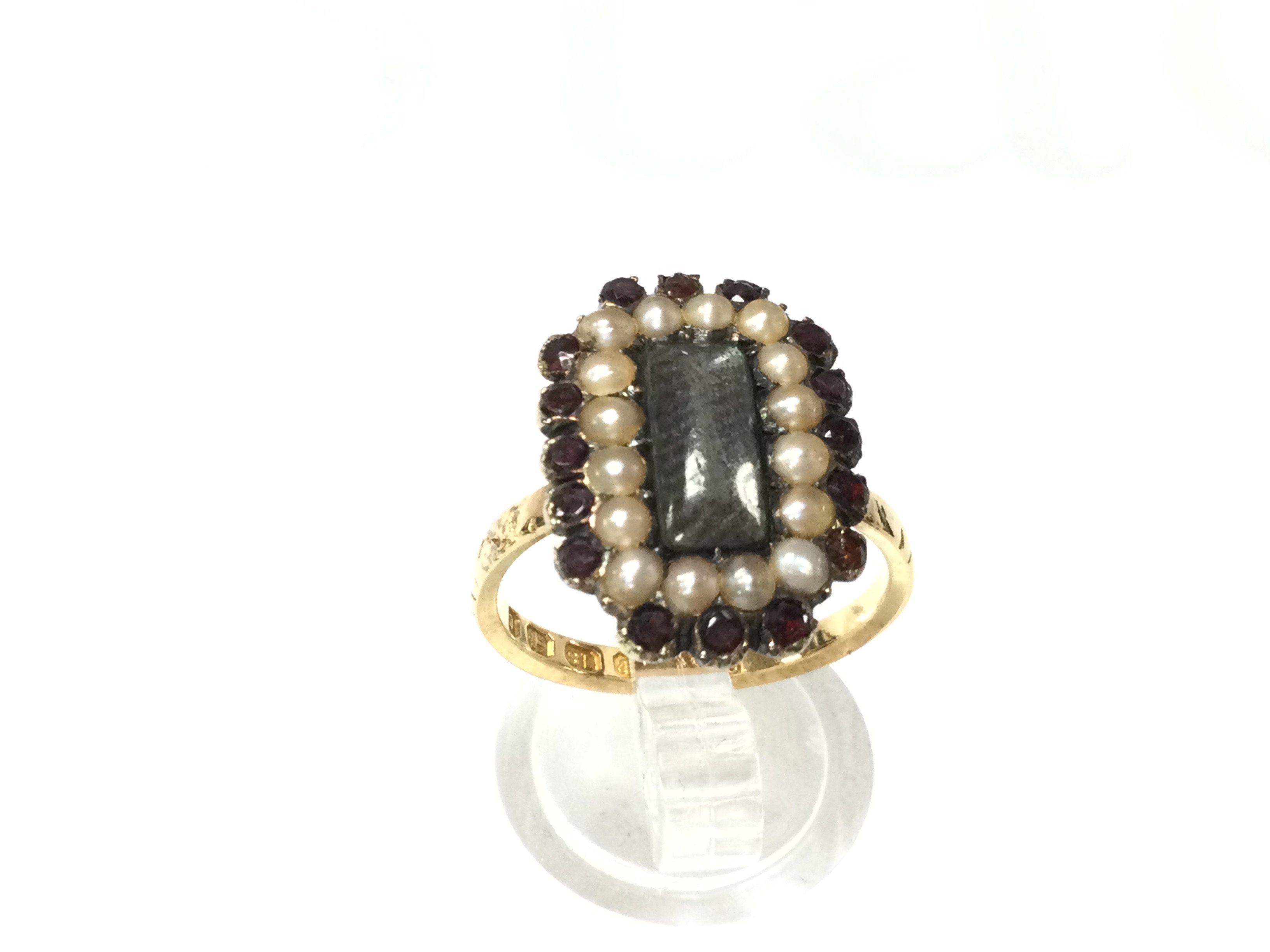 An 18ct pearl and ruby mourning ring. 5.75g and size P 1/2