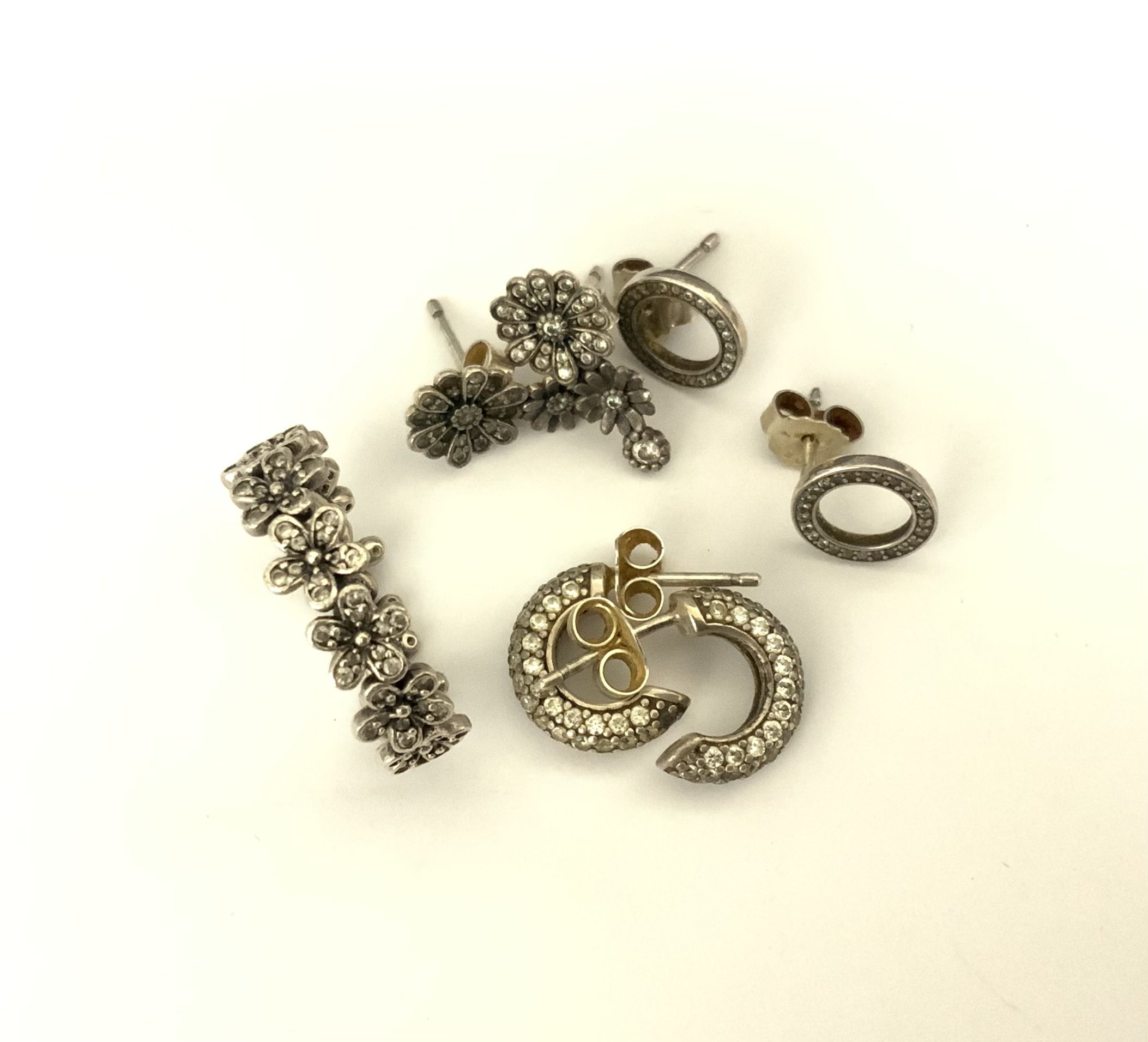 A Pandora Sterling silver Sparkling Daisy's matching earrings and stud earrings together with 2 additional pairs of Pandora silver earrings. (A) NO RESERVE