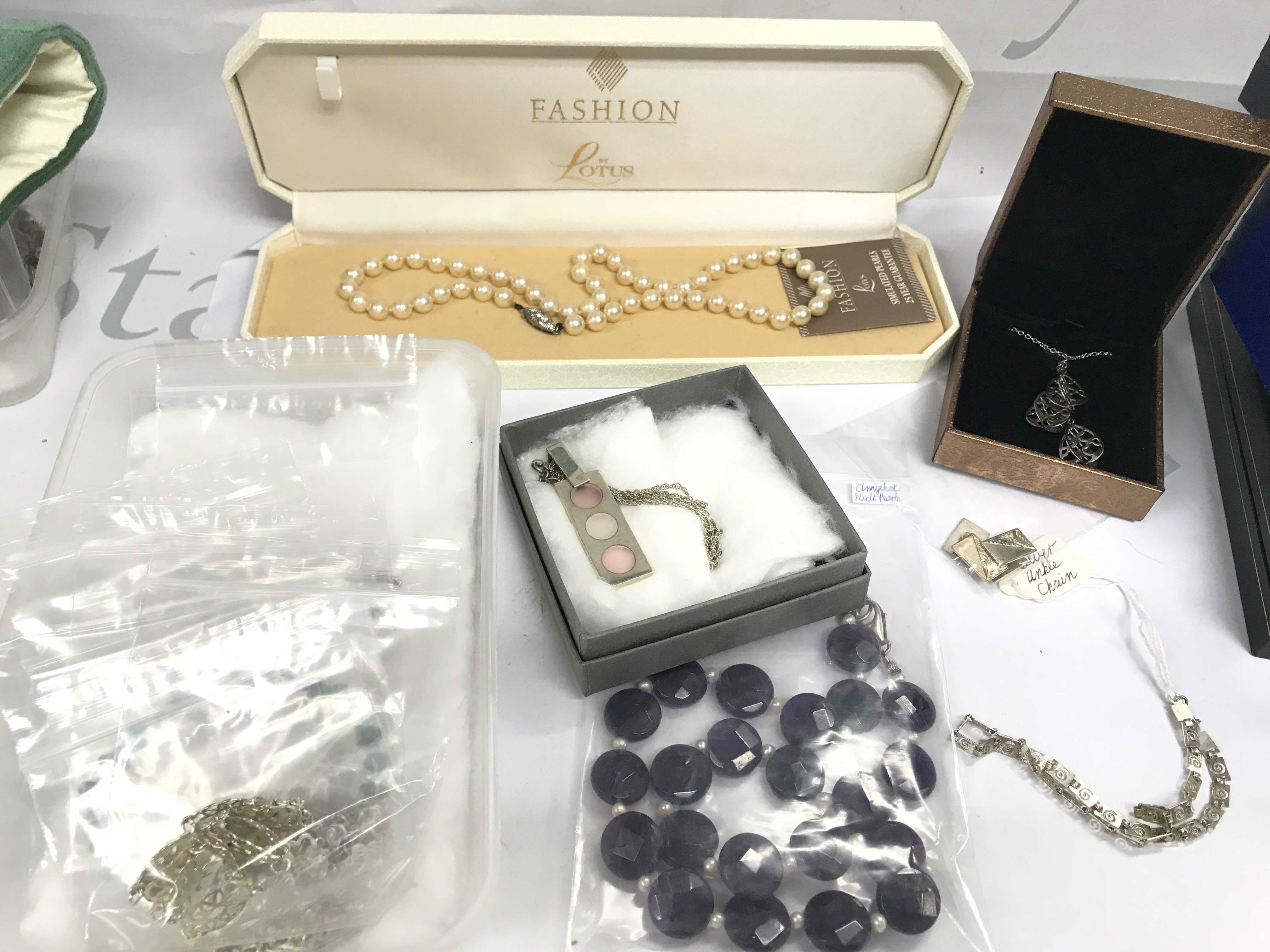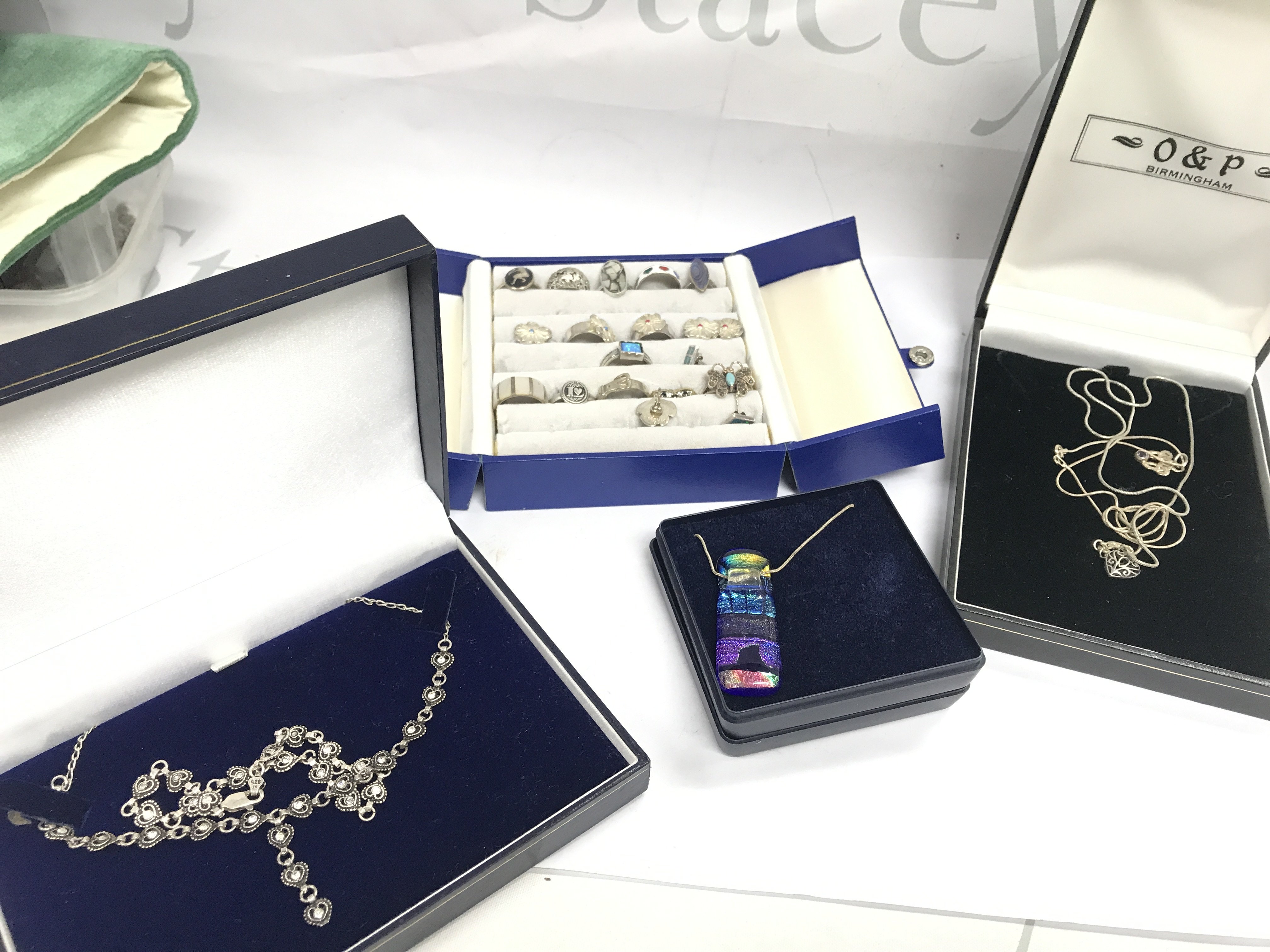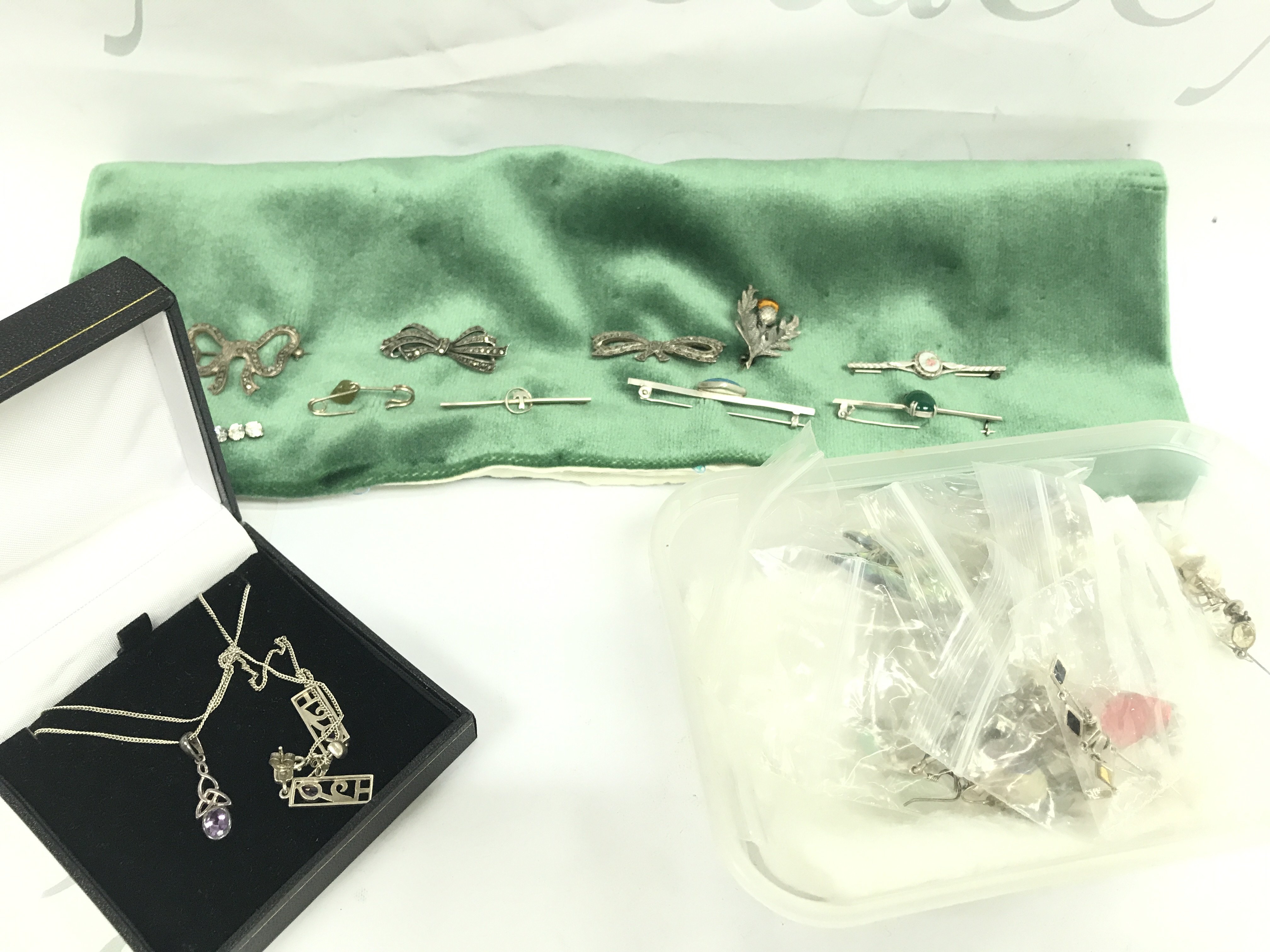 A collection of silver costume Jewellery including a collection of silver brooches, silver necklaces and earrings , some silver rings etc. postage category C