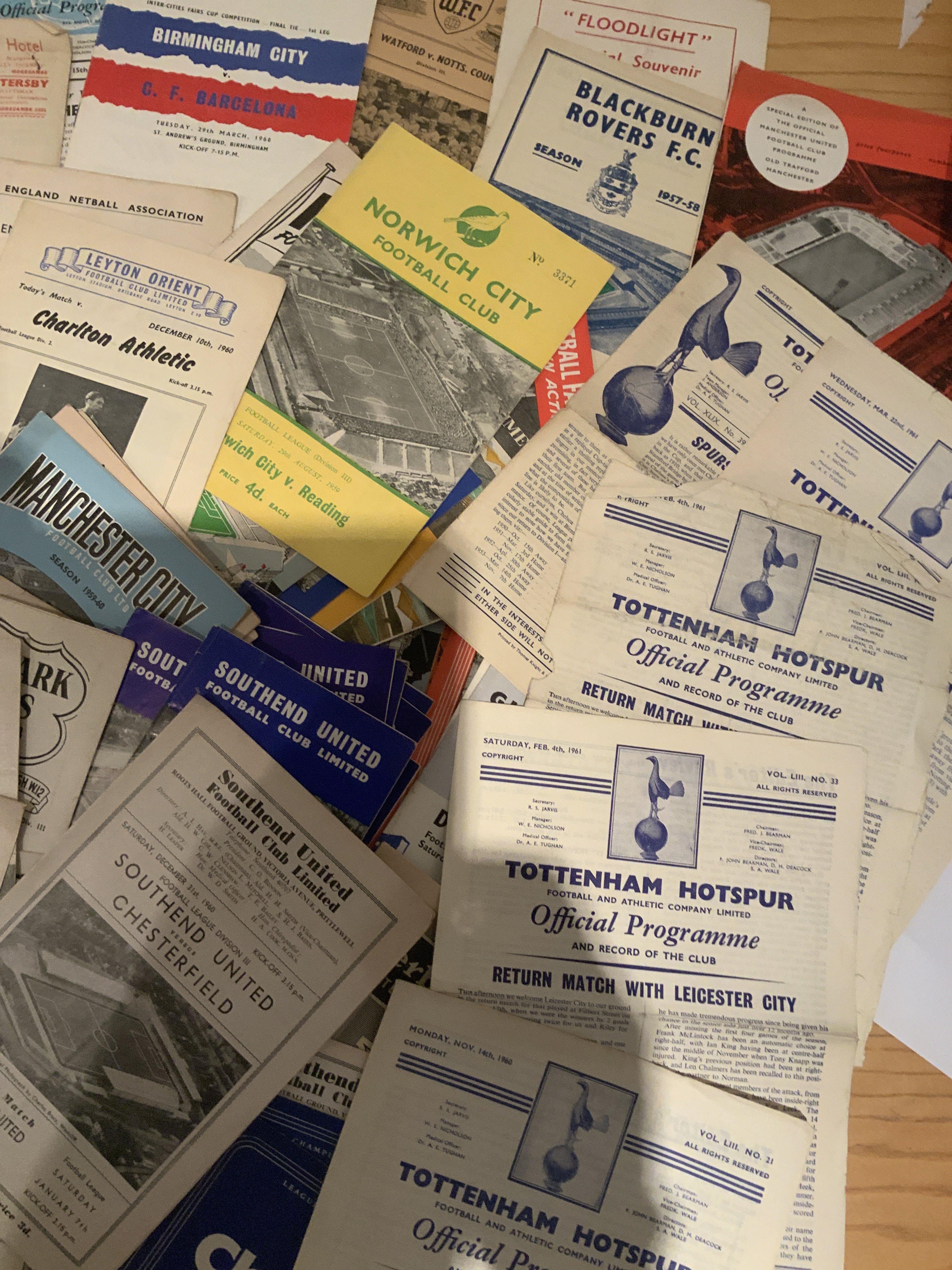 1950s + 1960s Football Programmes: Varied lot from the late 50s and early 60s in good condition. Includes 60/61 Manchester United v Exeter League Cup, 1958 FA Cup final, 59/60 Hearts v Aston Villa, 60/61 Grimsby v Bradford City reserves, Tottenham 60/61 homes x 4. Good QPR Derby Southend and Chelsea content. (Est 150)