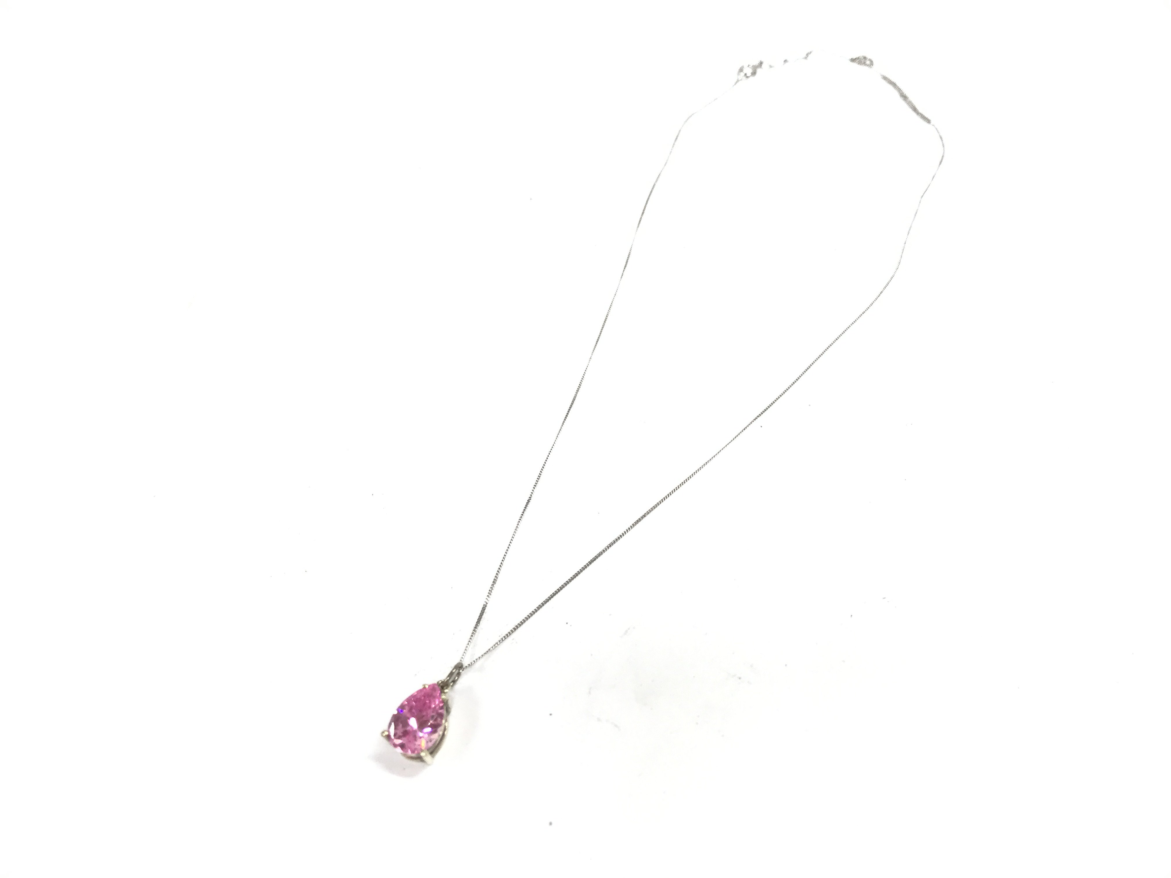 A 9ct white gold chain with a pink stone pendant , 1.8g total weight. Postage category A