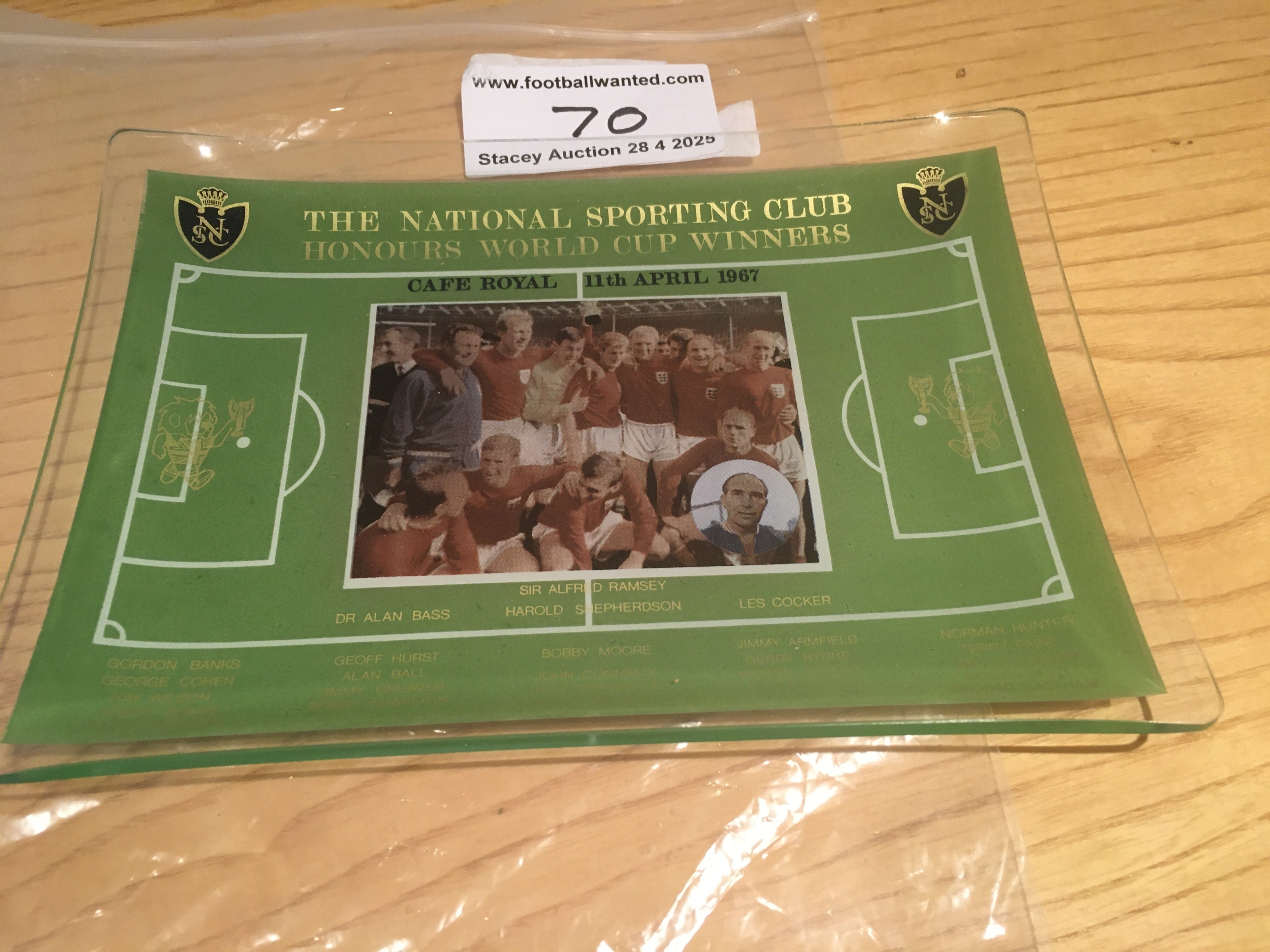 England 1966 World Cup Winners Glass Tray: Possibly a large ash tray with date 11 4 1967 and venue Cafe Royal. National Sporting Club awards dinner. Football pitch with a picture of the England team to middle and World Cup Willie in both goals. Lists all members of the squad in gold. Nice item.