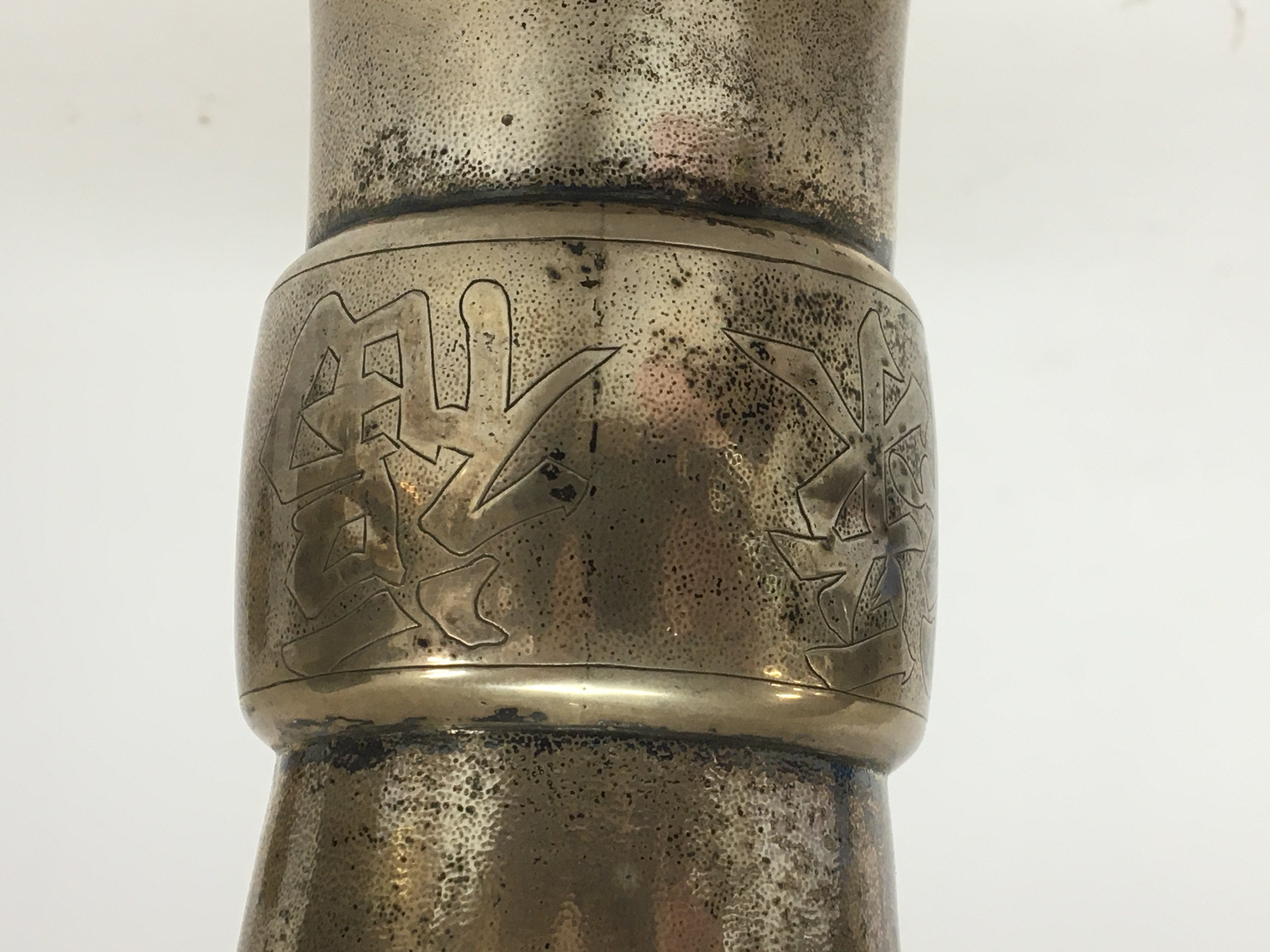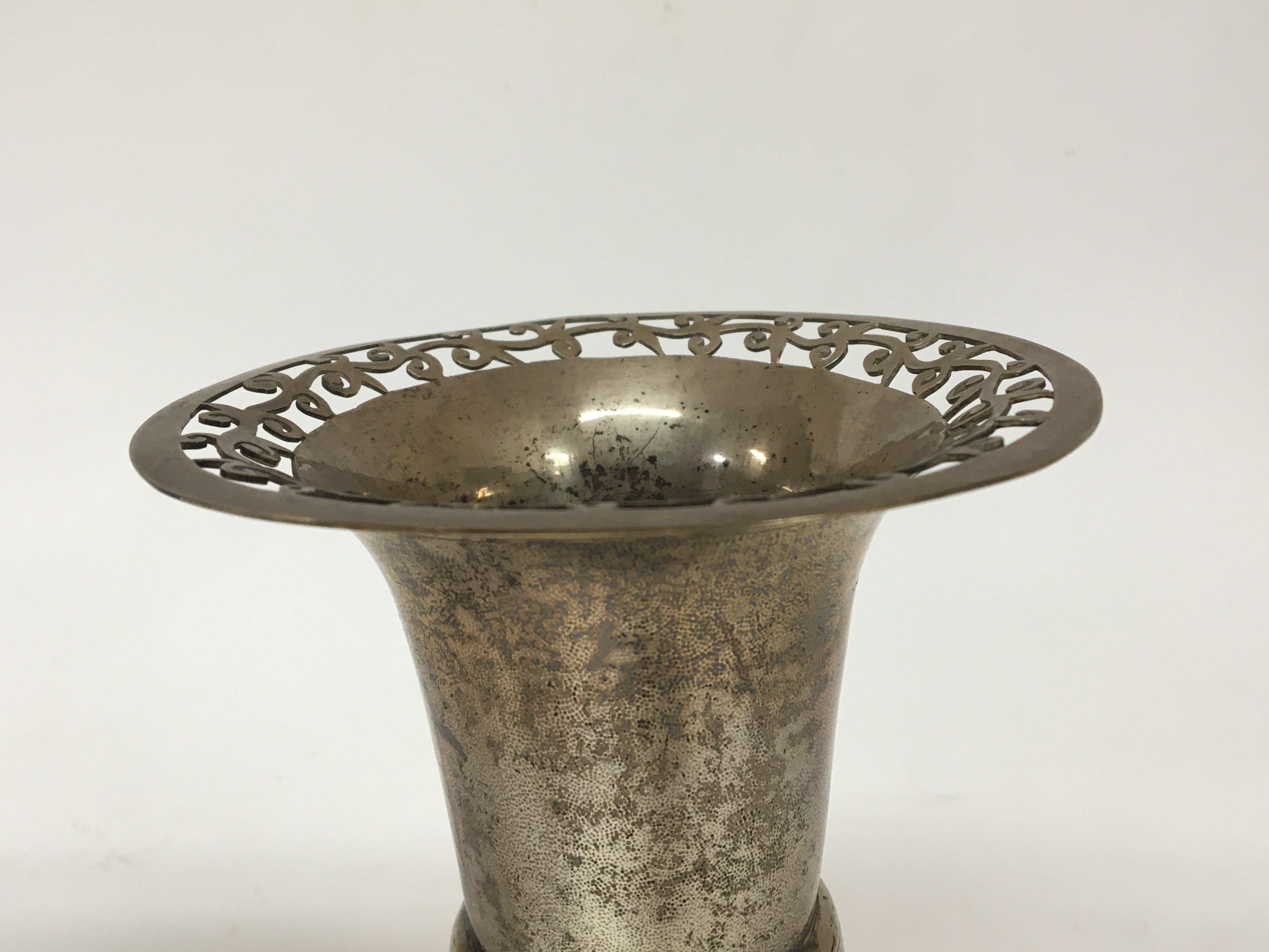 A Quality 19th century Chinese silver vase with a pierced rim the sides with pattern and and a band of caricature marks. makers Mark and silver Mark to the base weight approximately 360g height 20cm good condition.