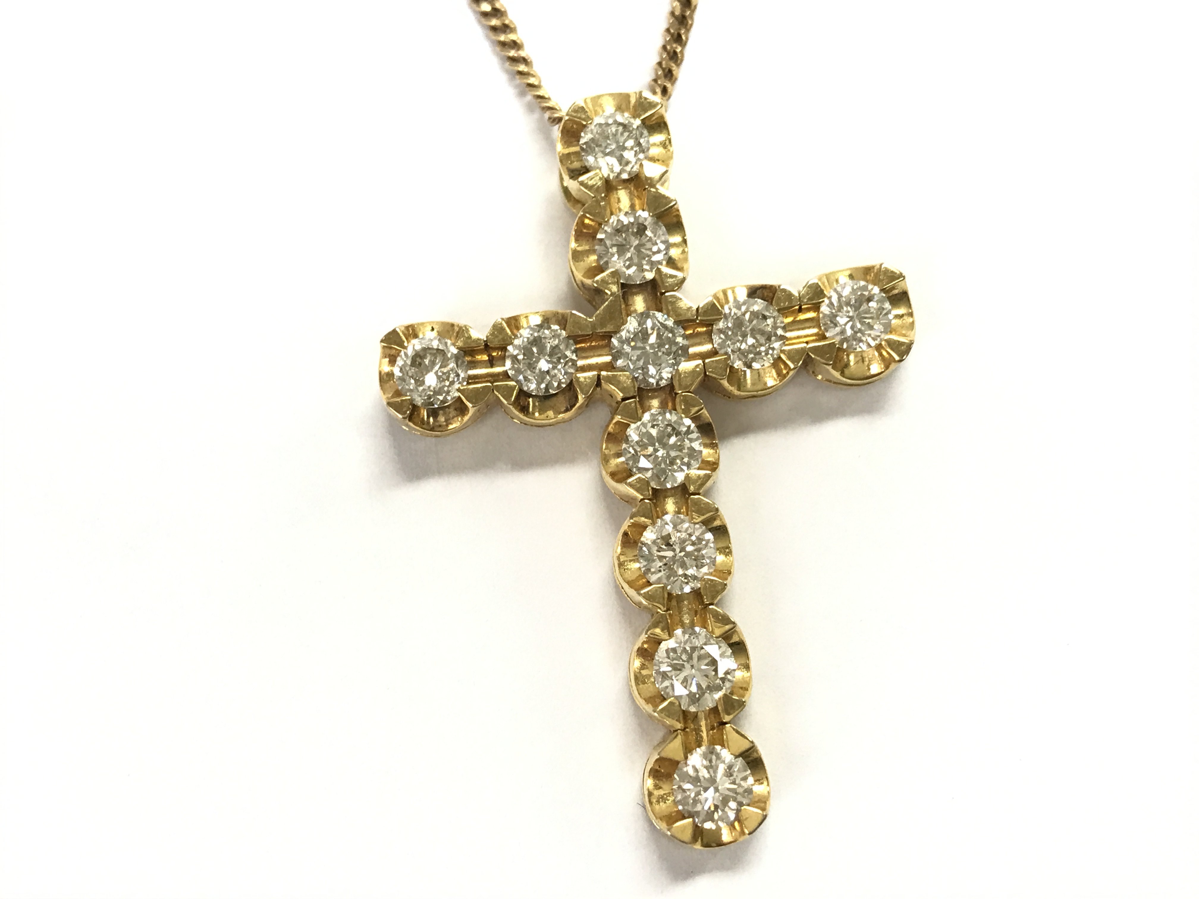 A 9ct gold diamond cross on chain , 10g total weight. Postage category A