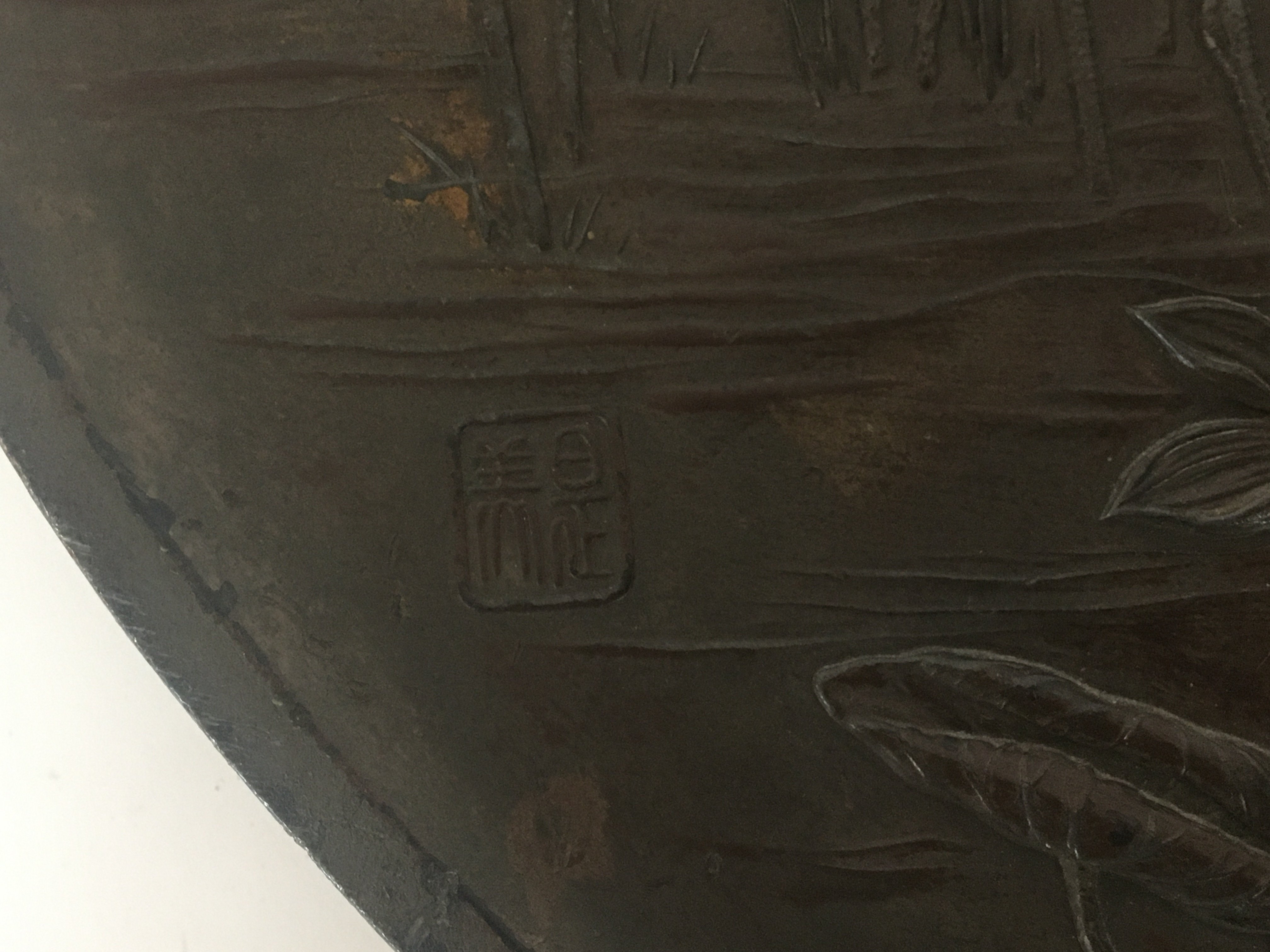 A Quality Japanese 19th century bronzed metal plaque with raised stalks and lily pads signed with a seal mark diameter 46cm