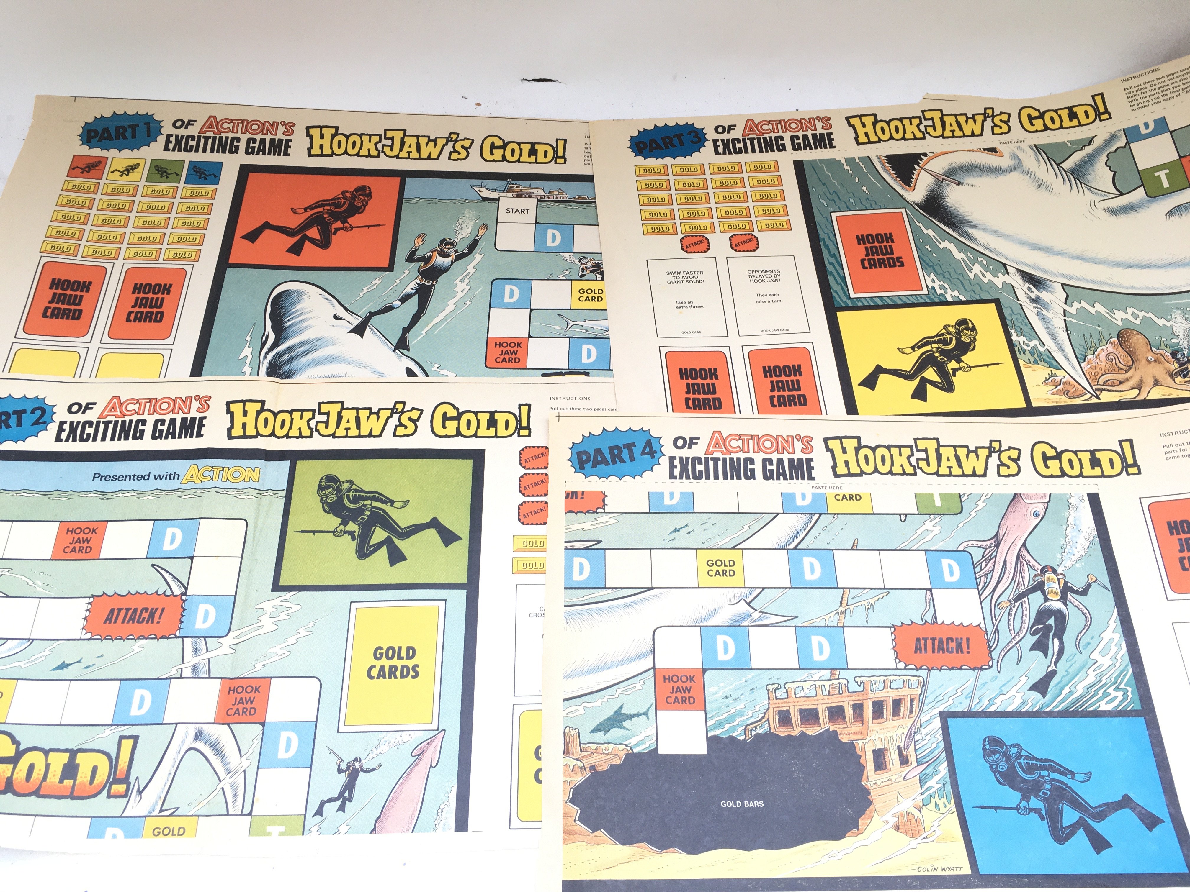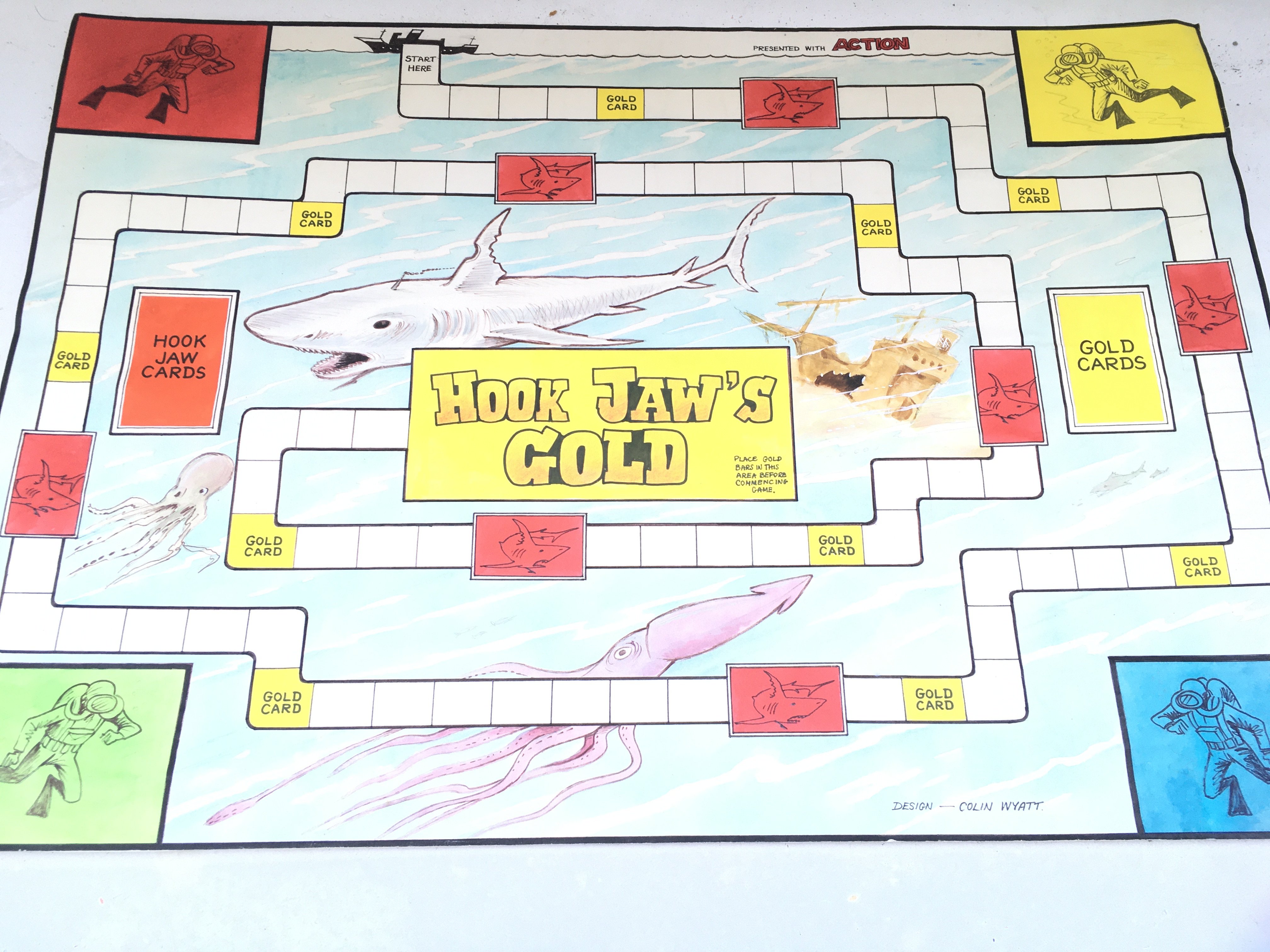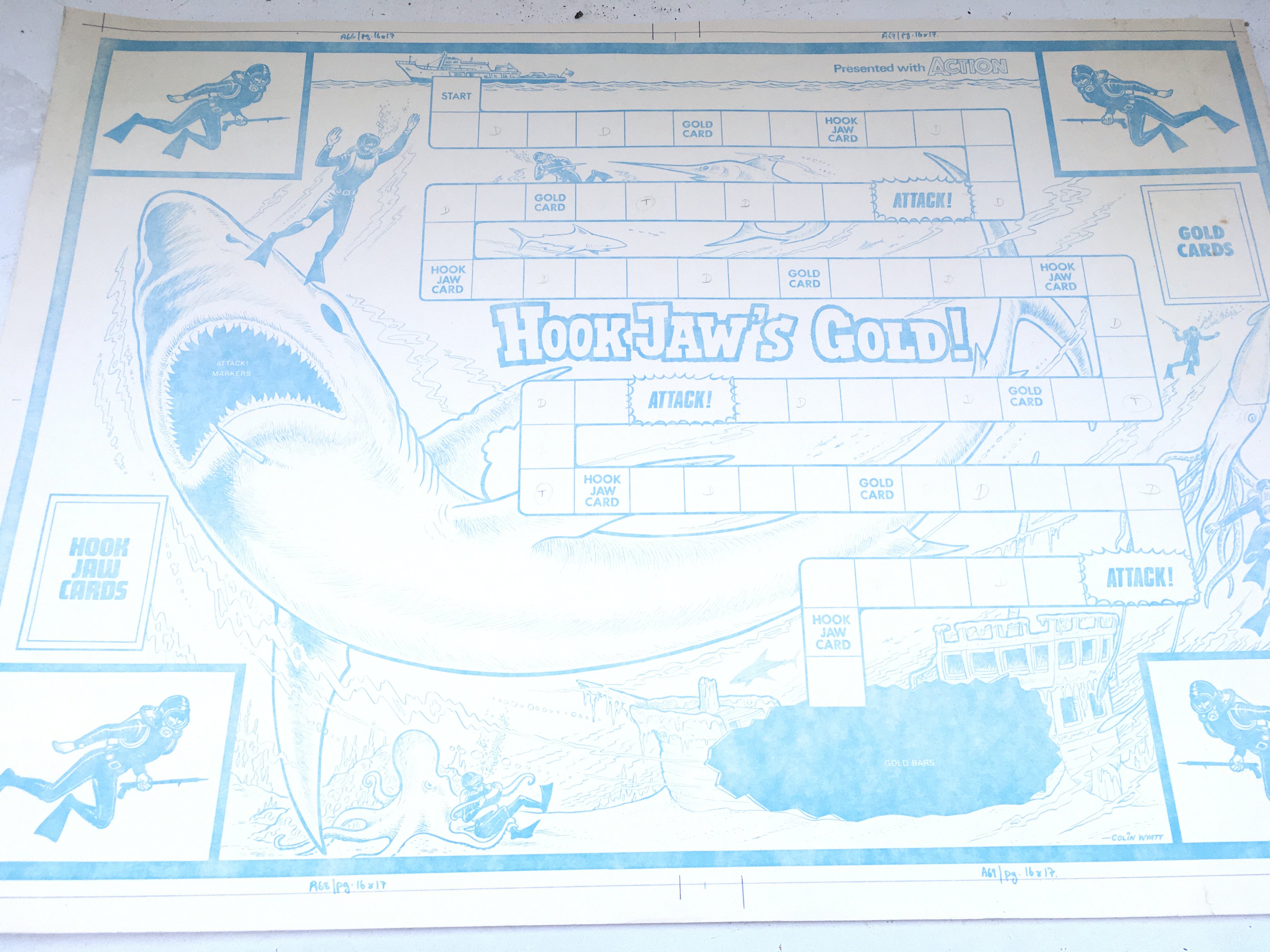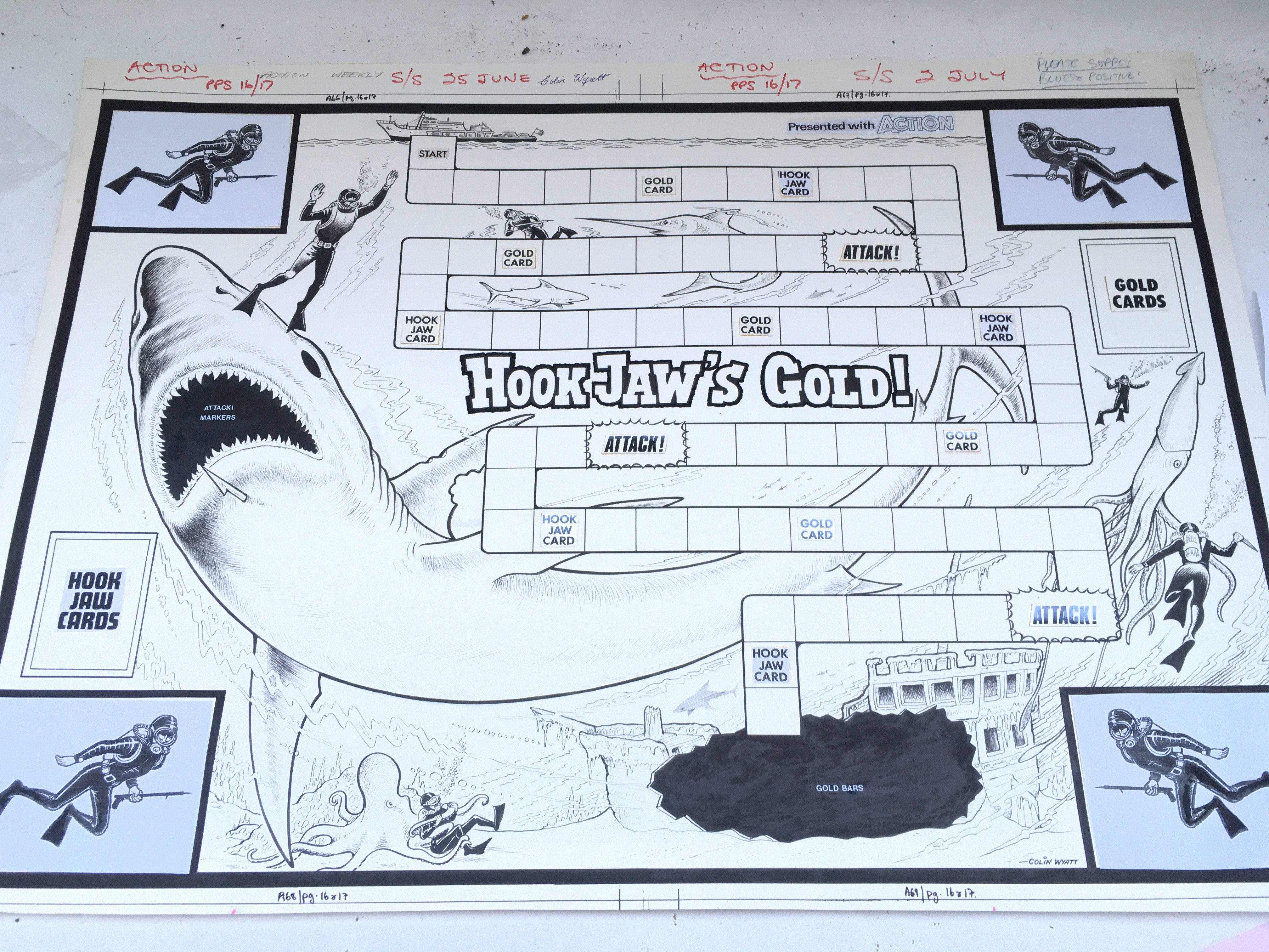 Art Work By Colin Wyatt For The Action Comic 25th June 1977. This Is The Artwork For The Pull Out Of Hook Jaws Gold Game. This Also Includes The Original Front Cover Proof. And the Original Sketch Drawing. These had To Be Collected Over 4 Issues.