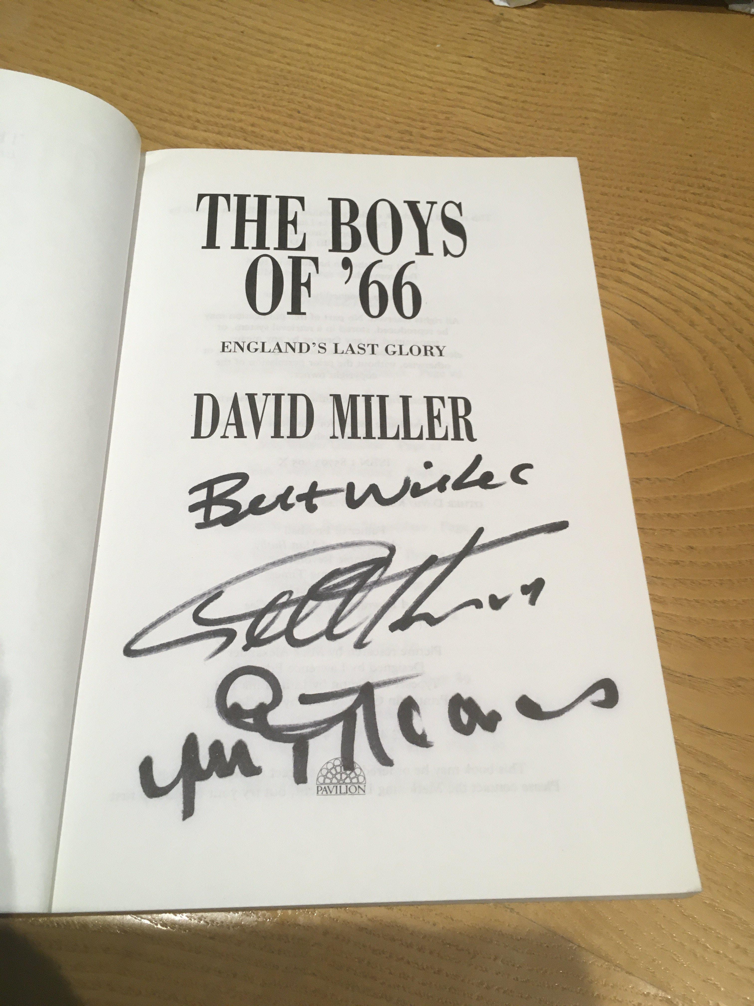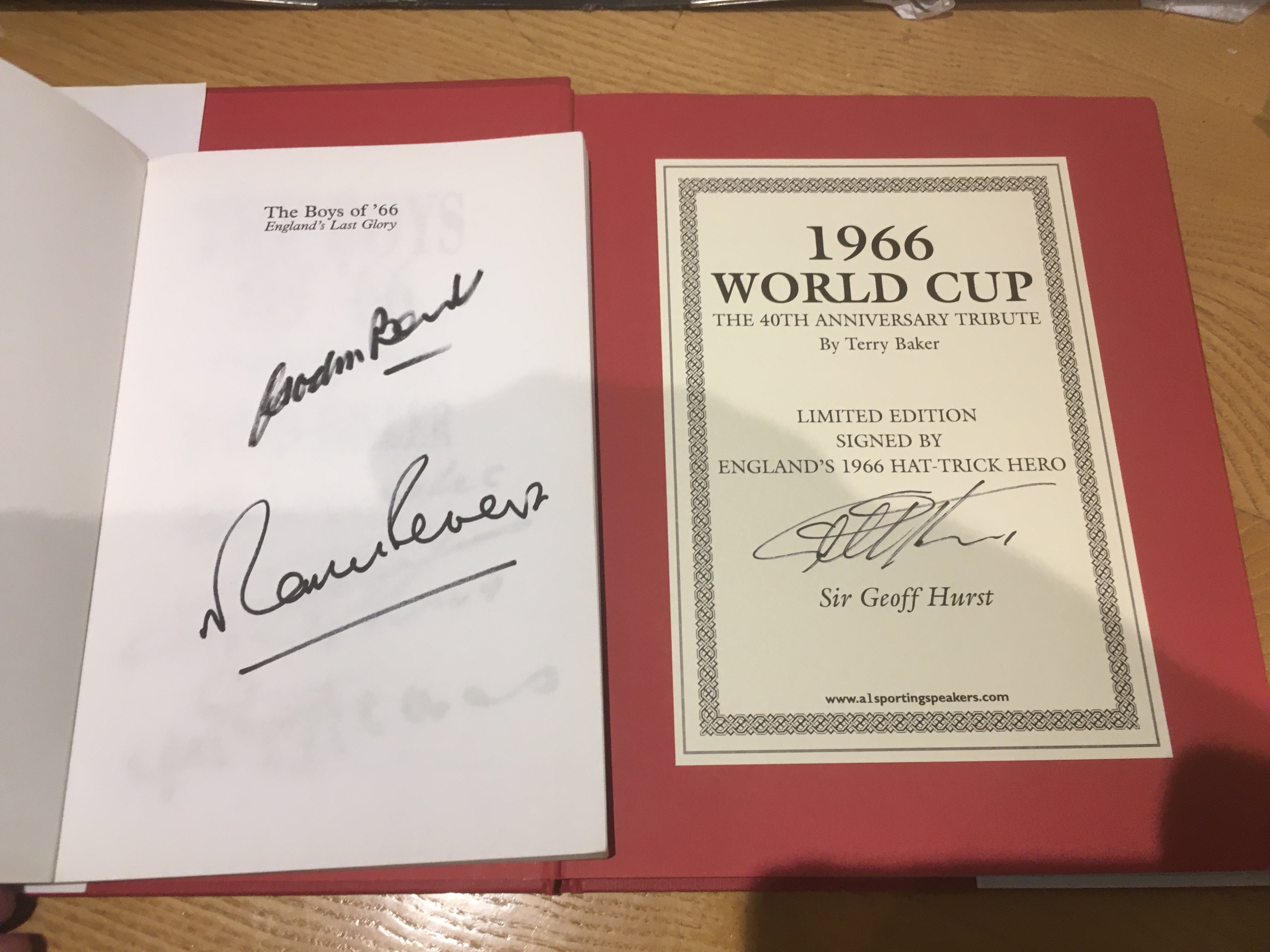 England 1966 World Cup Signed Football Books: Boys Of 66 soft cover by David Miller signed by Gordon Banks Martin Peters Geoff Hurst and Jimmy Greaves. Hardback 40th anniversary of the 1966 World Cup by Terry Baker with autograph of Geoff Hurst. (2)