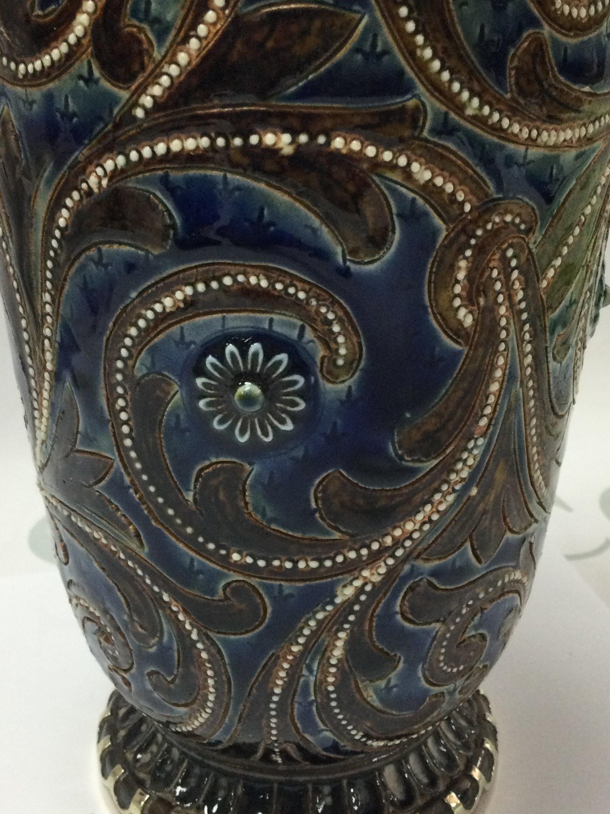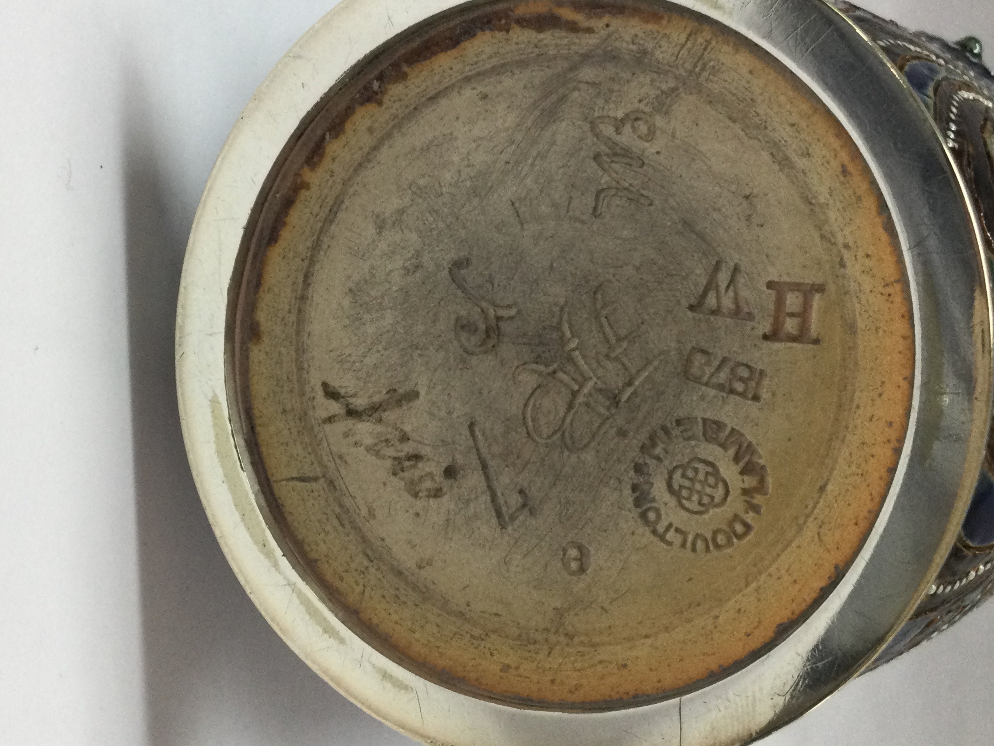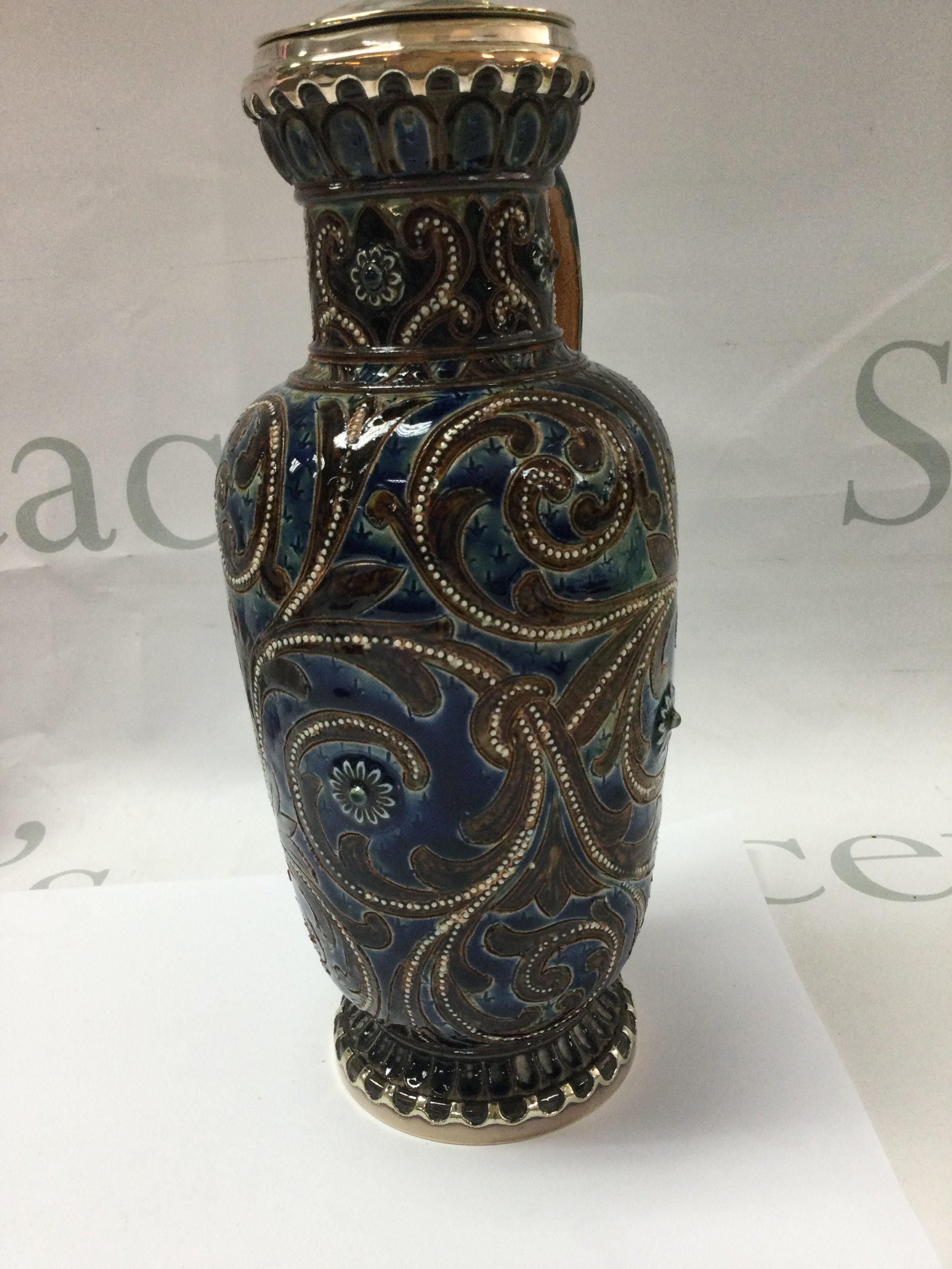 A Doulton Lambeth stoneware jug decorated with flower heads with silver plated lid 22 cm .