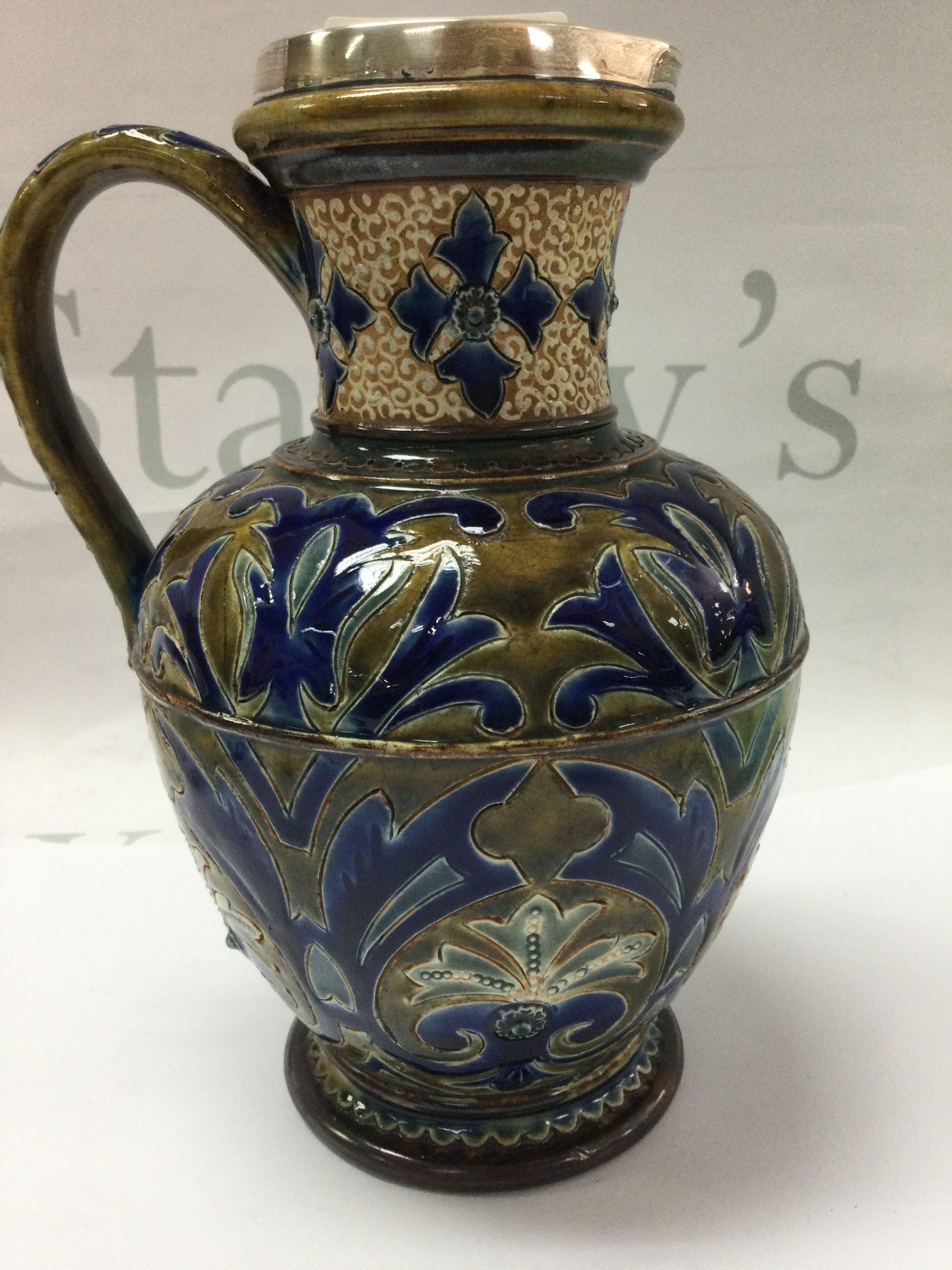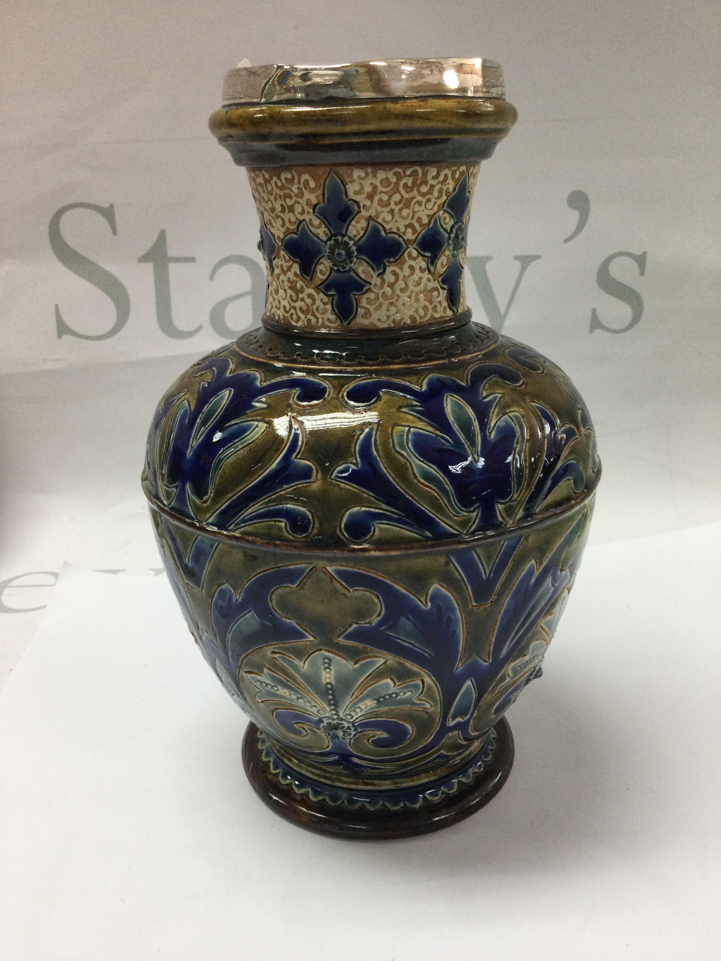 A Victorian Doulton Lambeth jug decorated with floral design with silver Plated rim 20 cm .