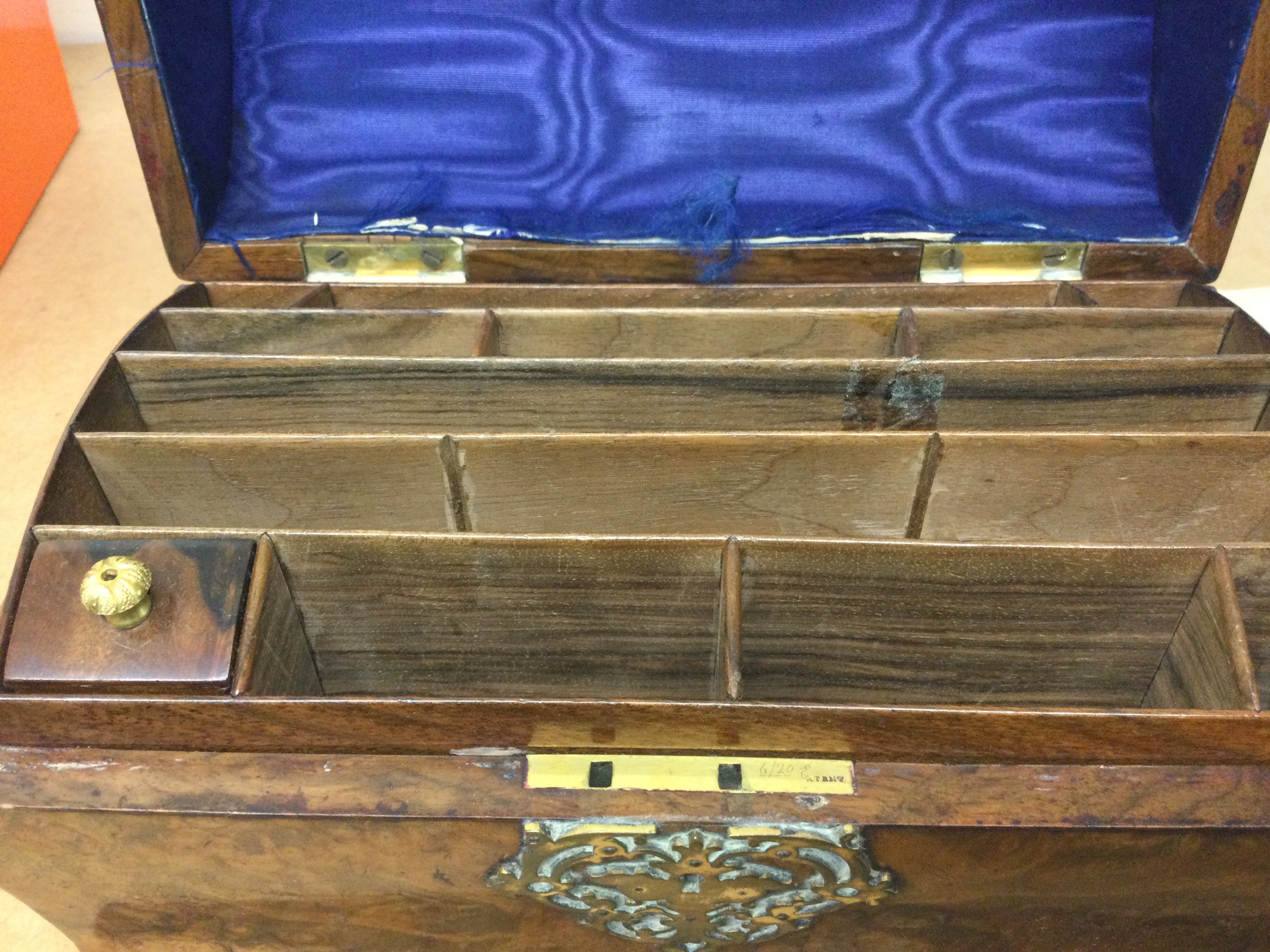 A Victorian walnut stationary box the hinged lid enclosing a fitted interior.
