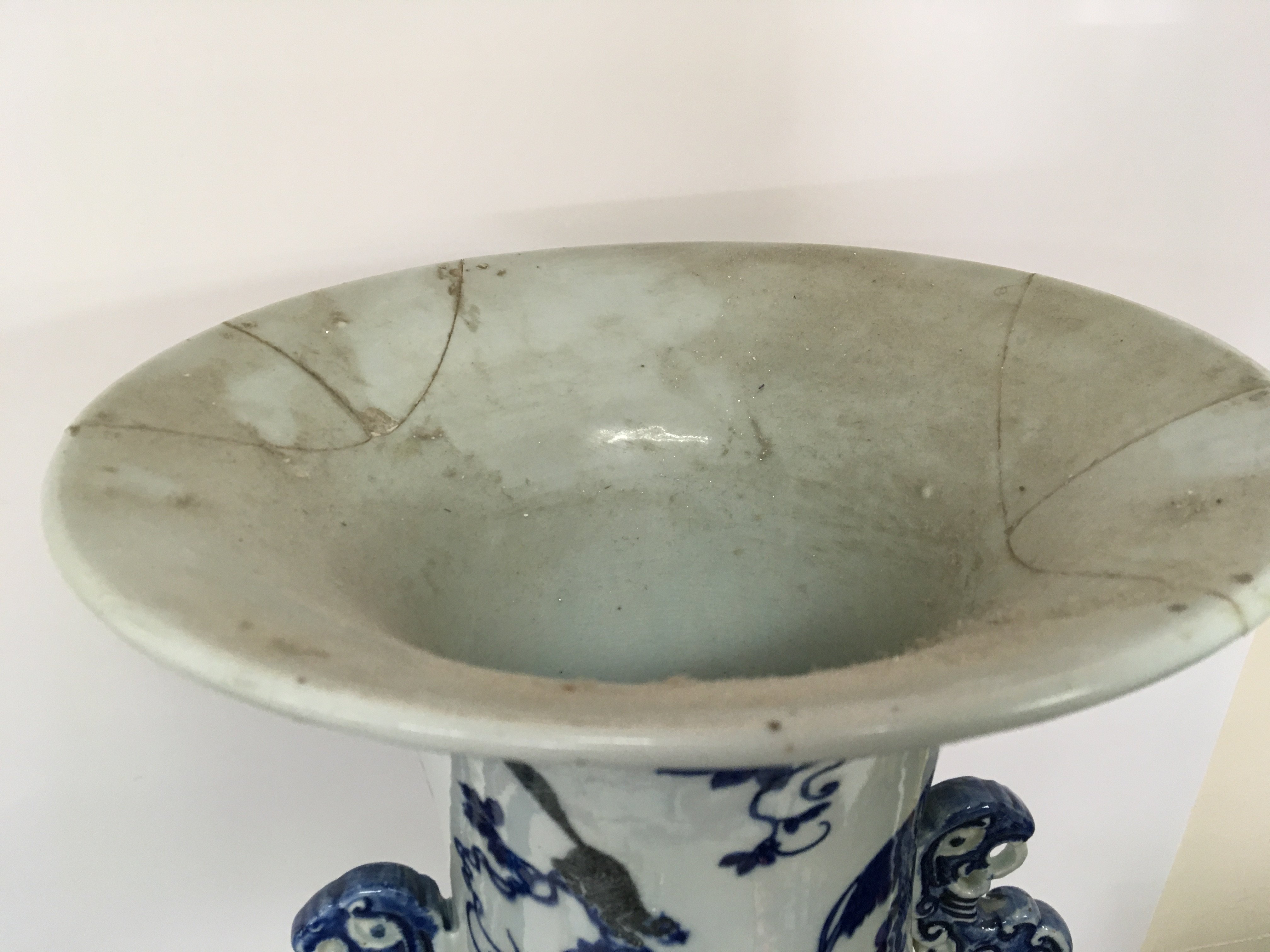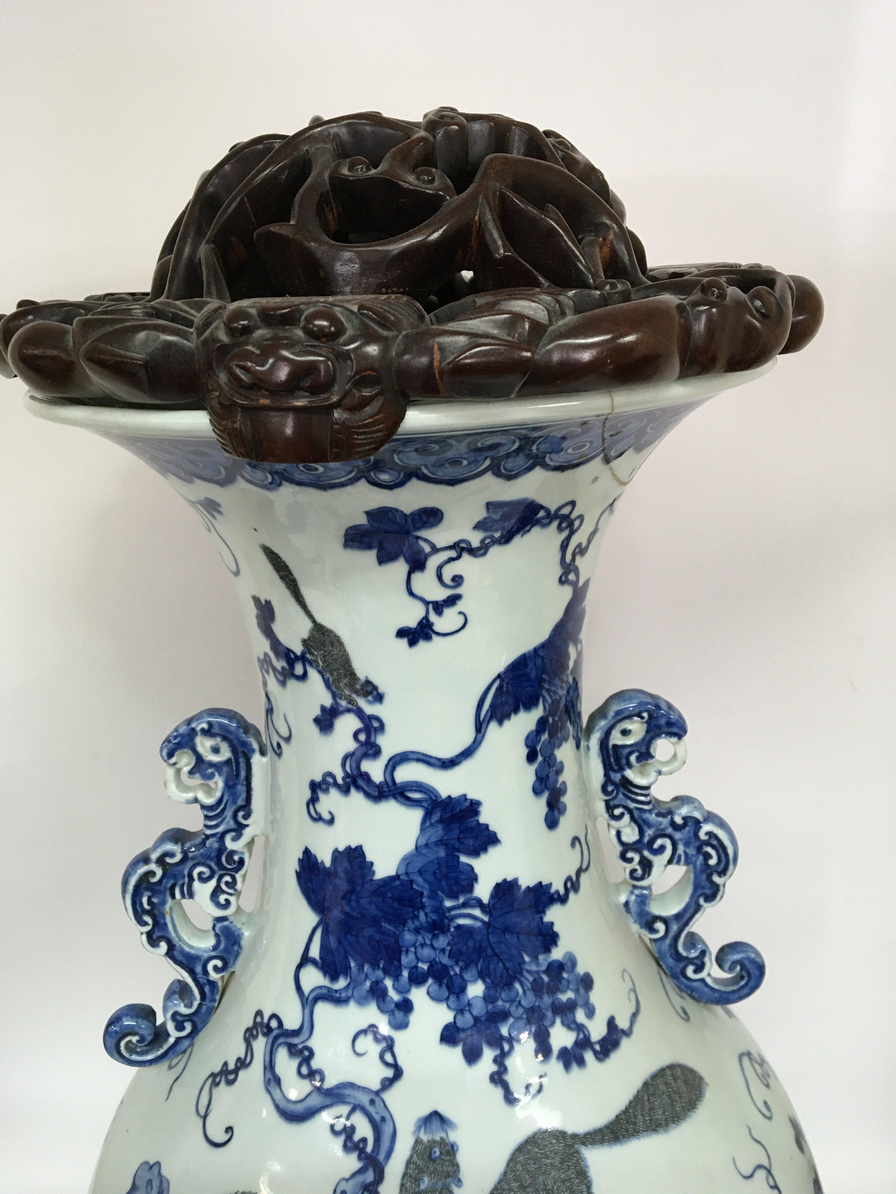 A large Chinese export porcelain blue and white floor vase decorated with animals amongst grape vines the sides with raised handles and the top with a carved wood cover some repair to the rim. 98cm high.