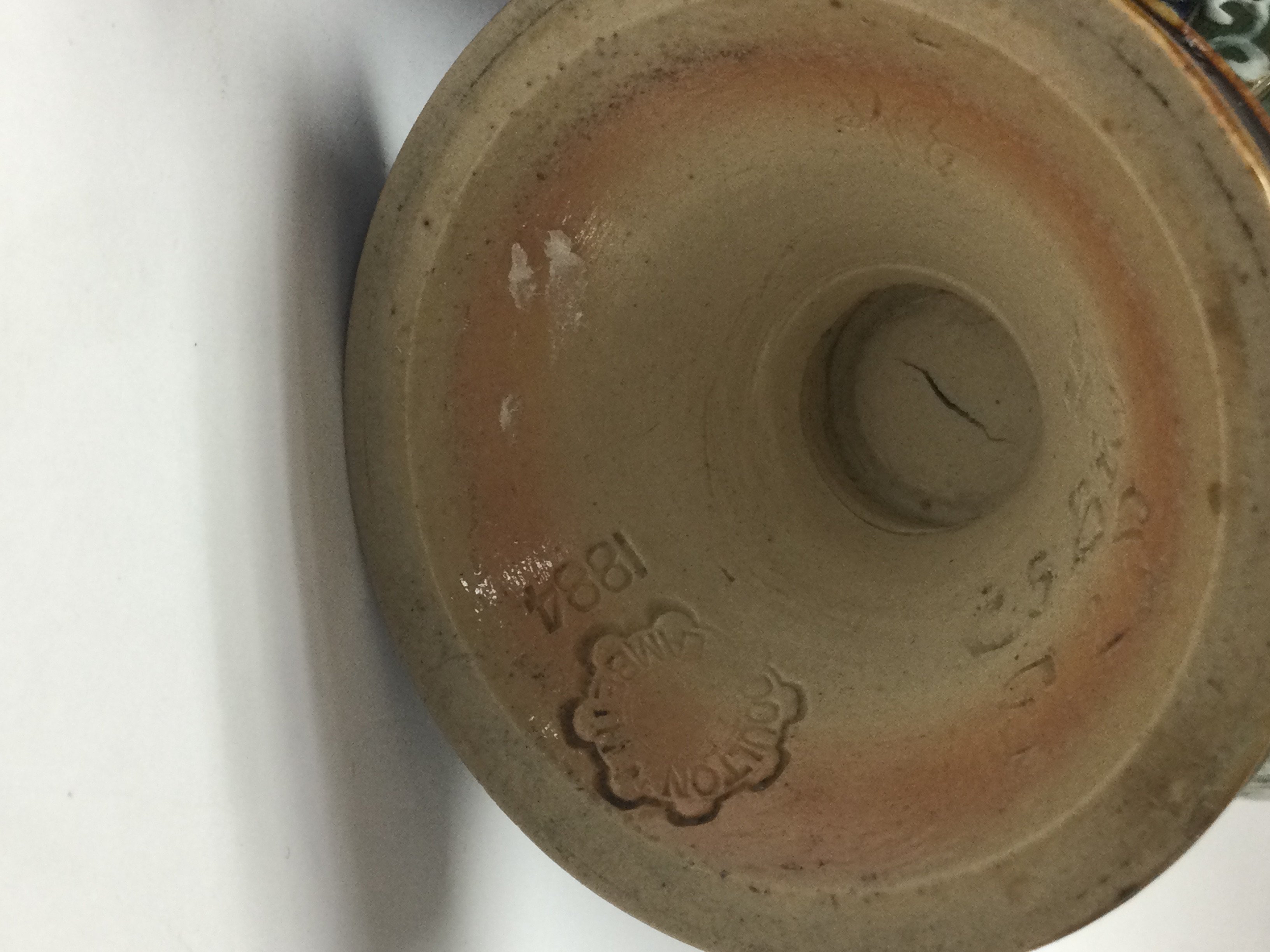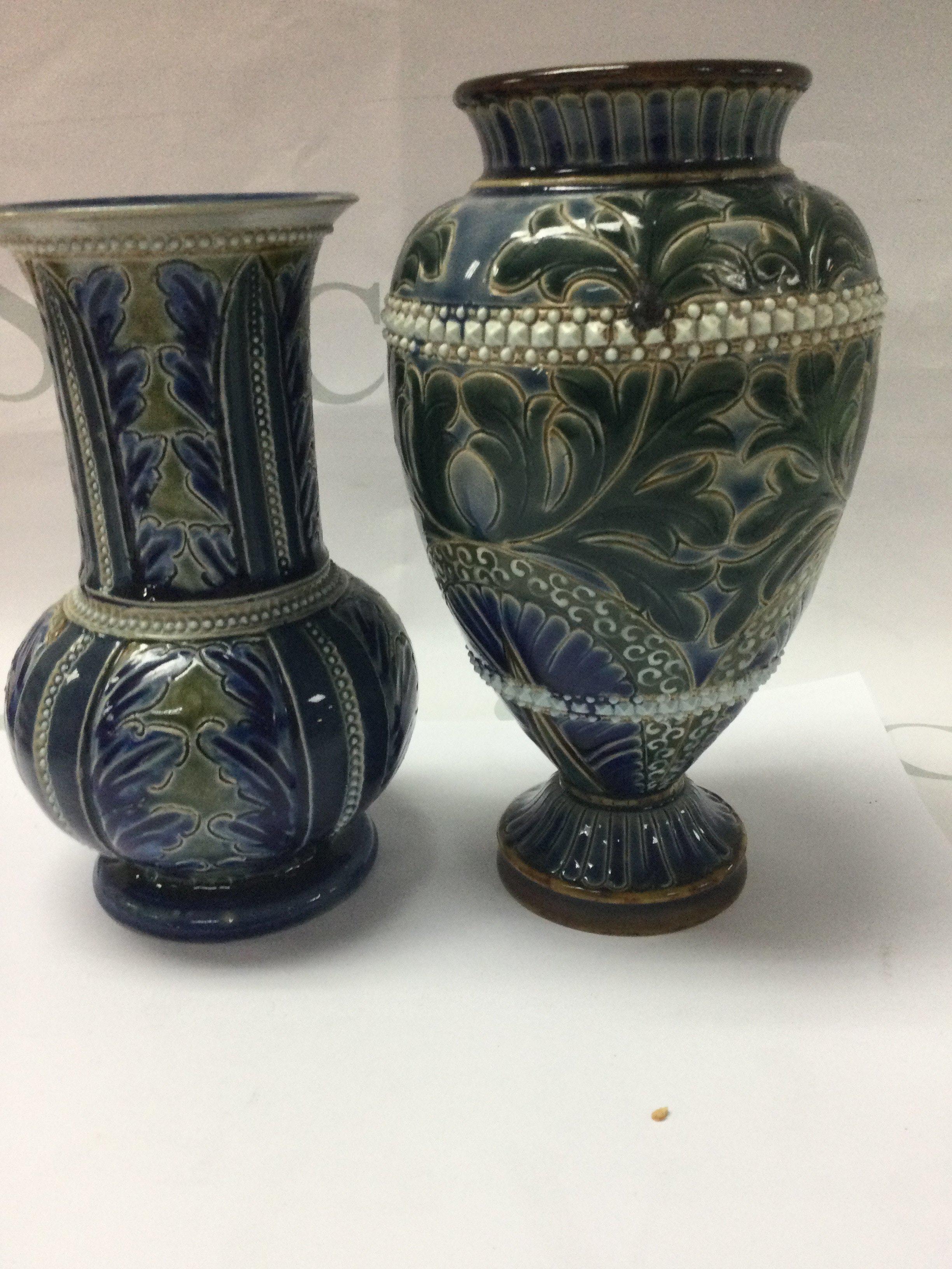 Two Doulton Lambeth vases decorated with foliage including ELisa Simmannce 16 cm and 18 cm .