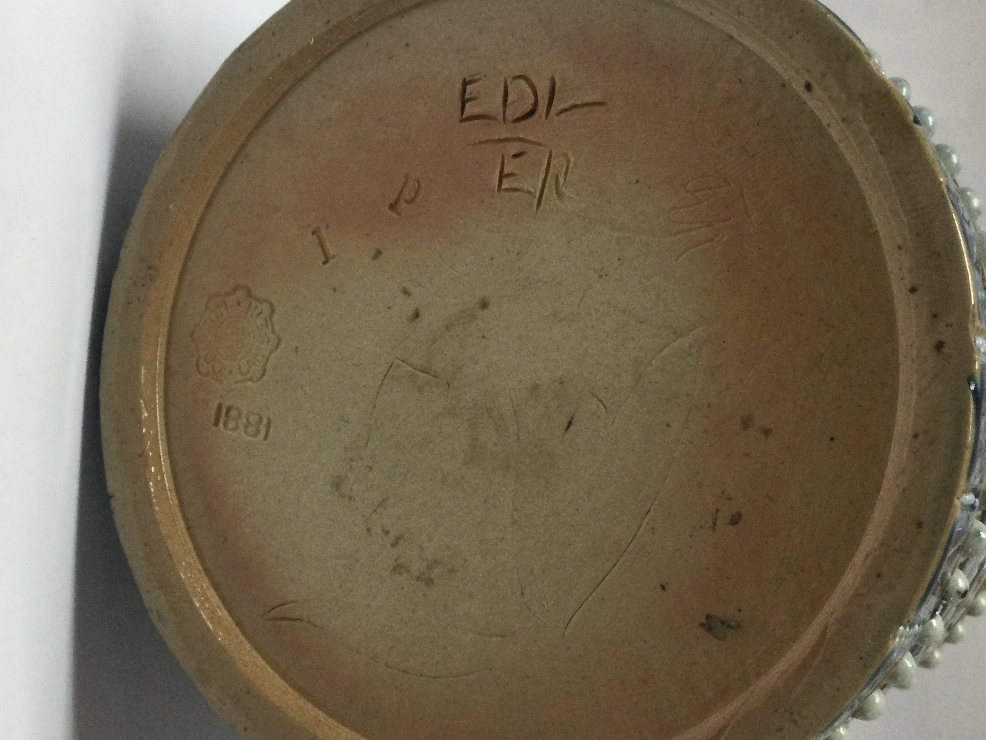 A Doulton Lambeth preserve pot by Edith Lupton the silver plated lid with raised butterfly 10 cm .
