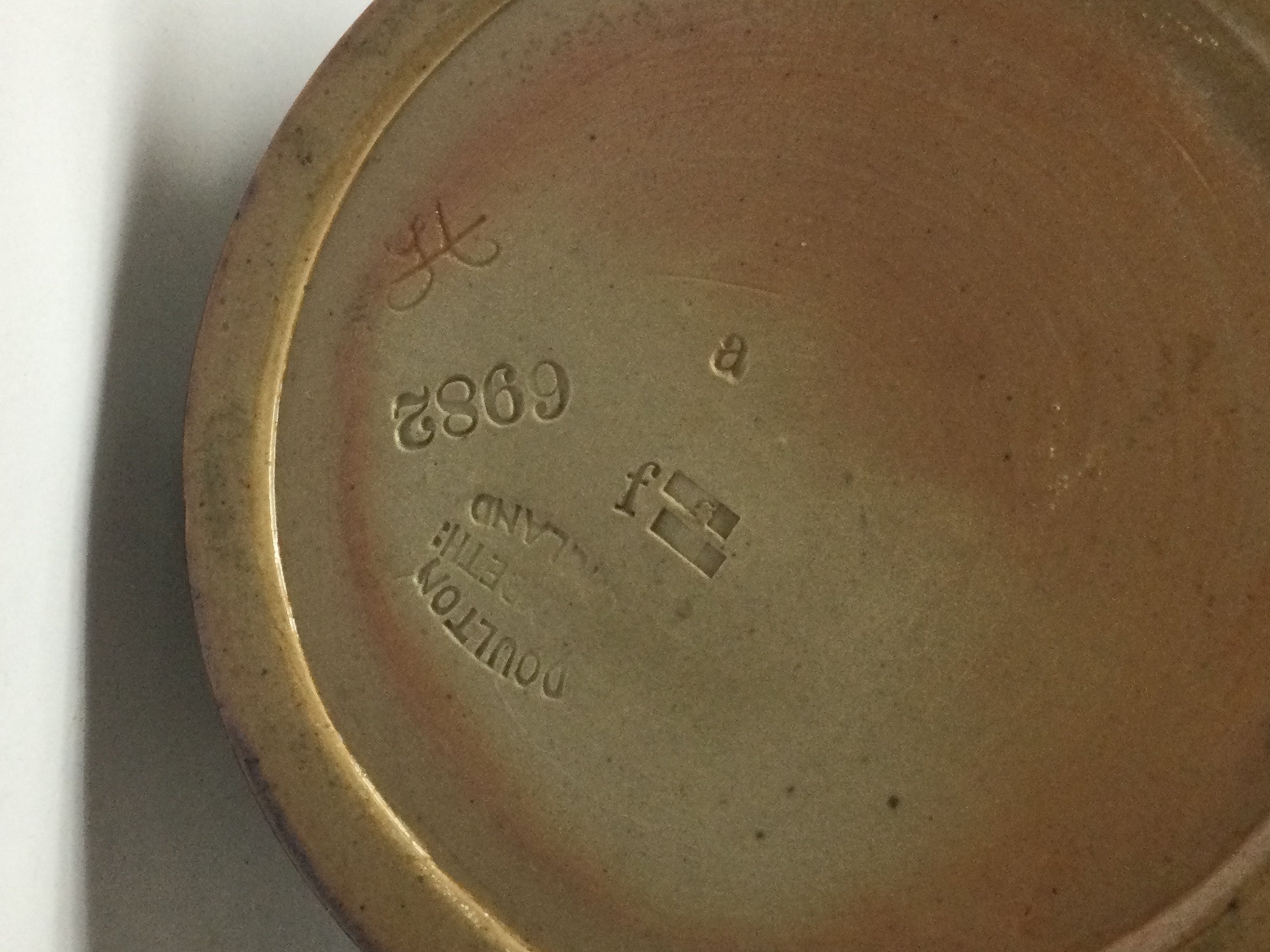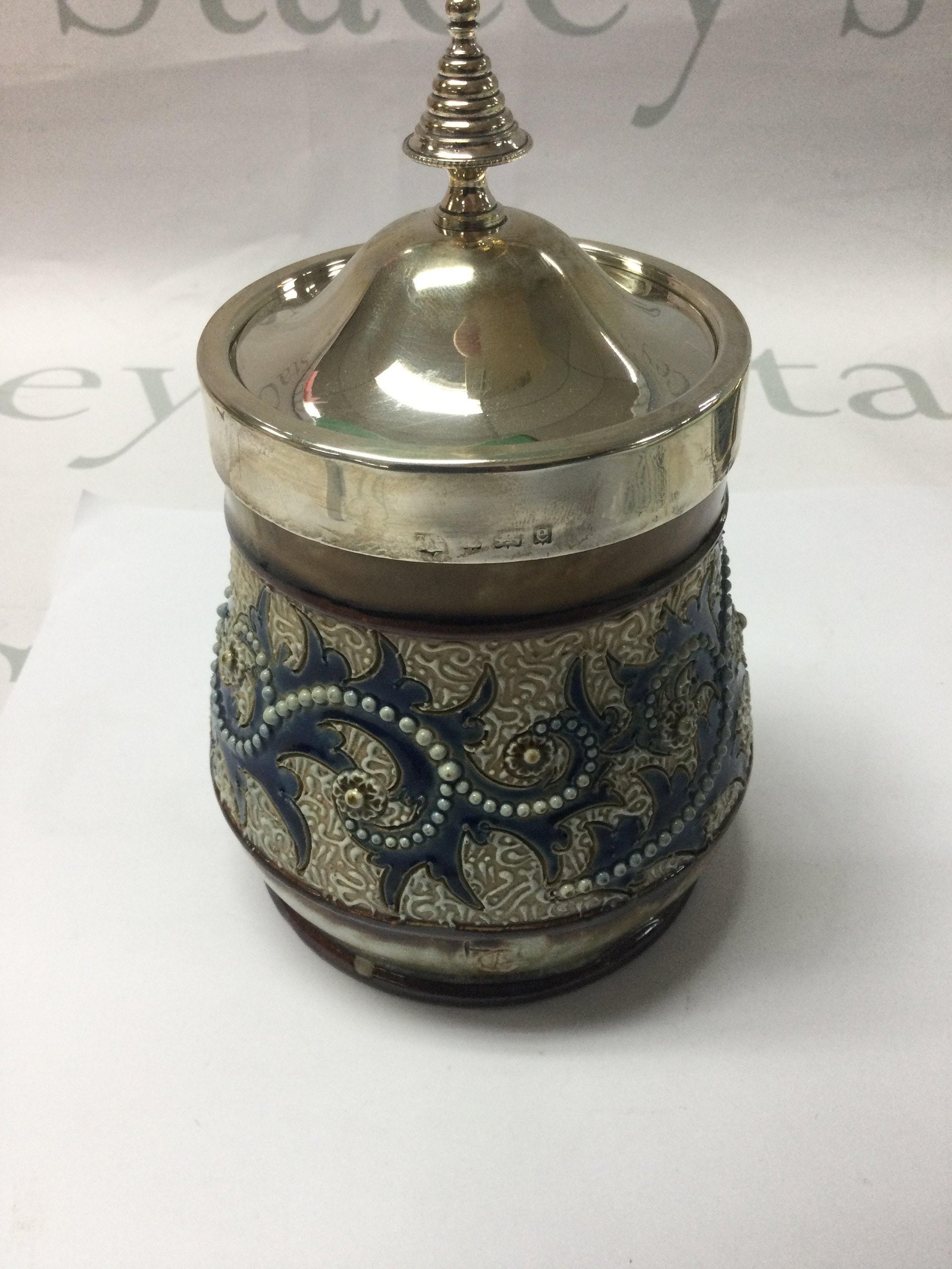 A Doulton Lambeth George tinworth preserve jar . With silver plated Lid and silver rim . 12 cm .