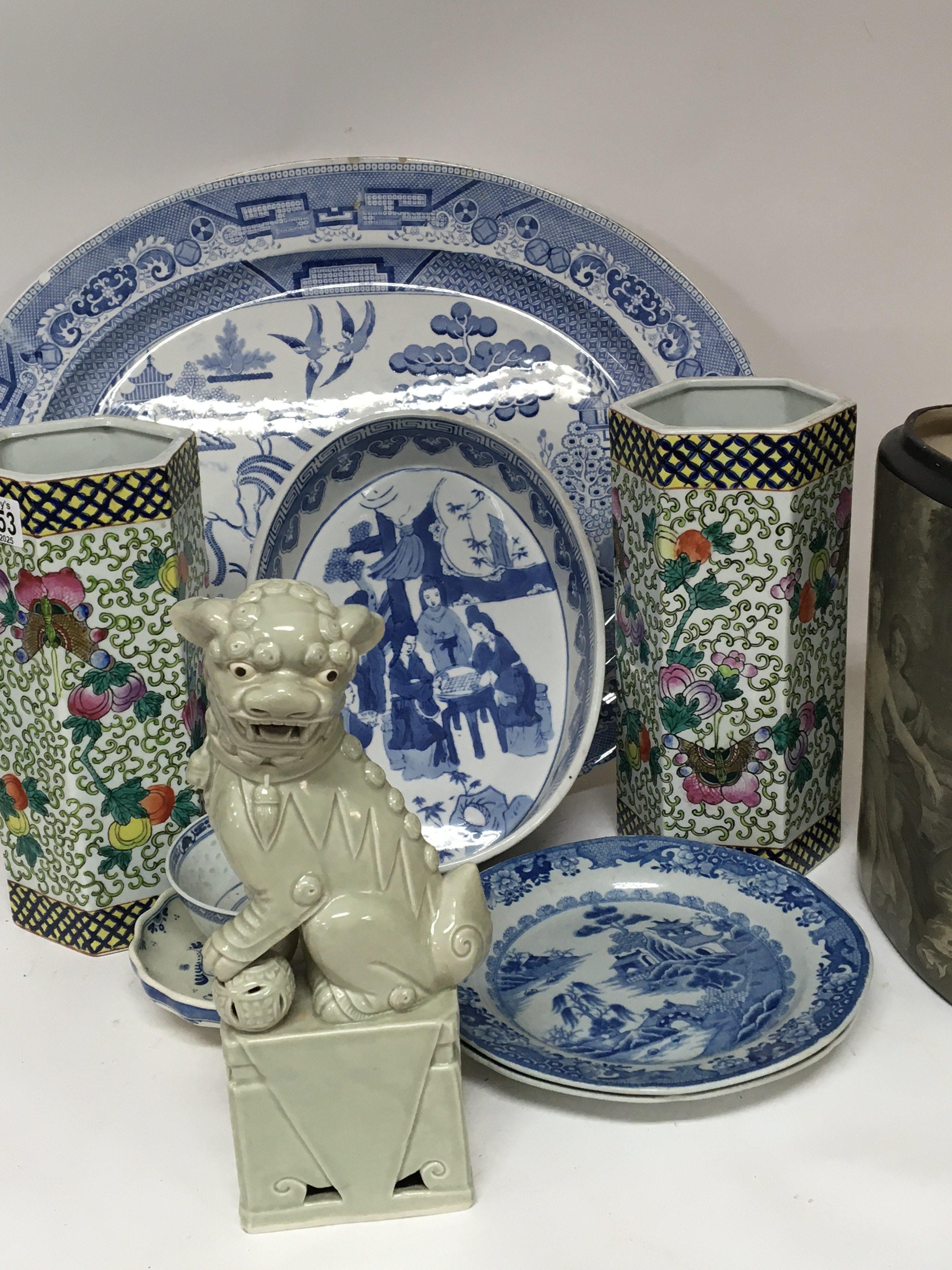 A collection of ceramics large Victorian meat plates blue and white dishes and 20th century Chinese ceramics and other ornaments.