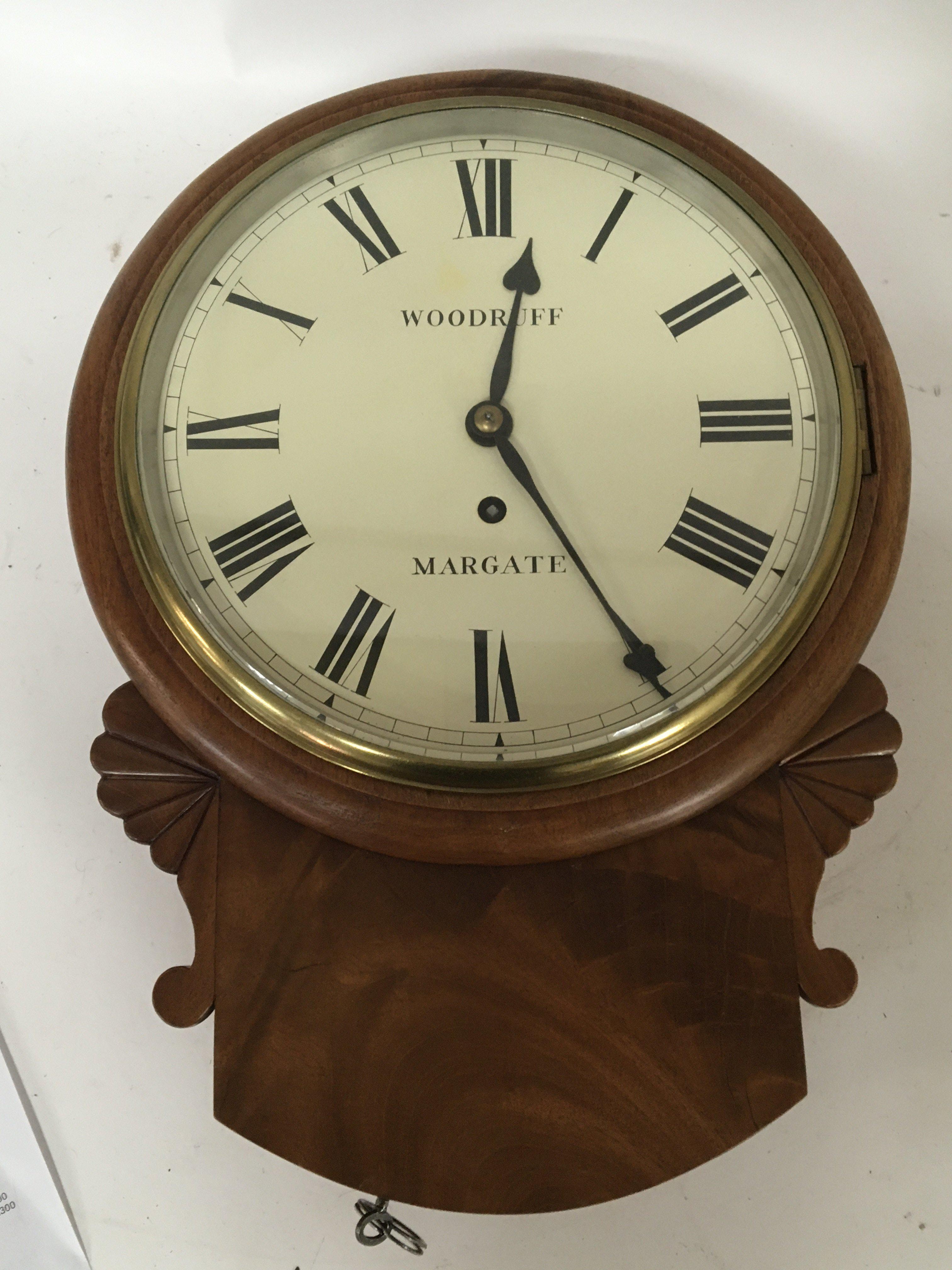 A walnut cased late 19th century wall clock with single fusee movement the dial with maker Woodruff Margate with pendulum dial diameter 30cm