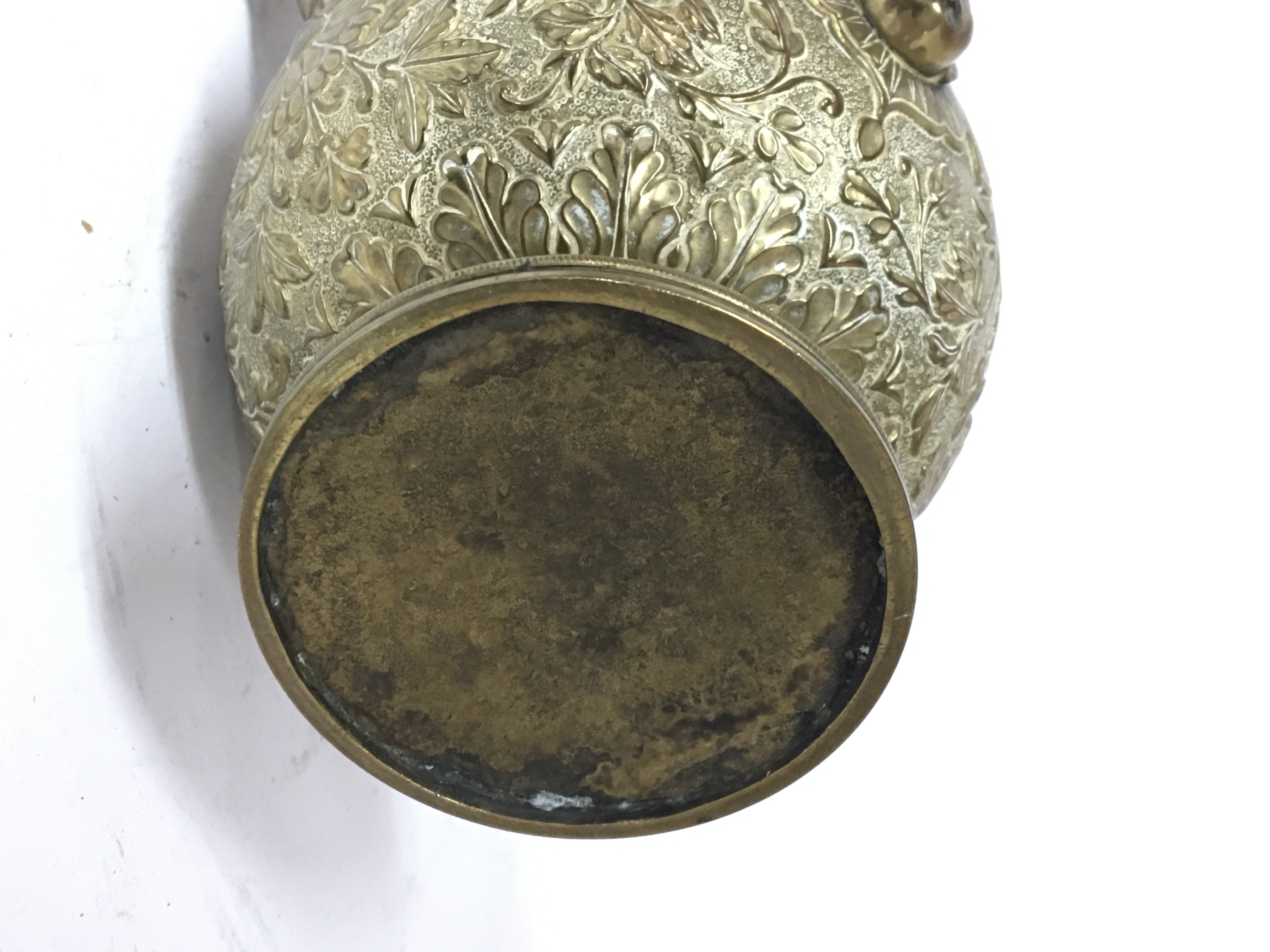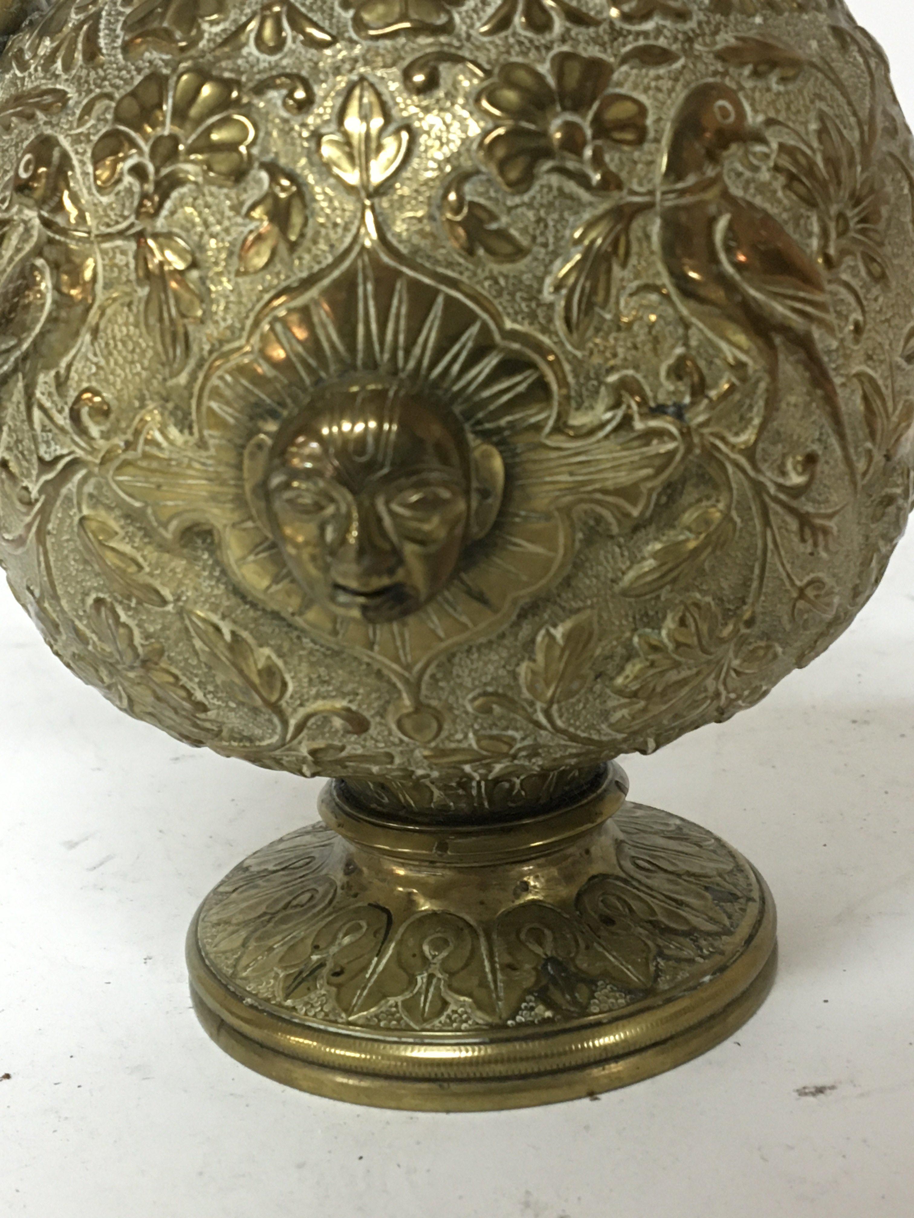 A Quality and interesting 19th century wine vessel with profuse decoration with birds and foliage raised heads a scroll handle and elephant shaped spout. Height 26cm.