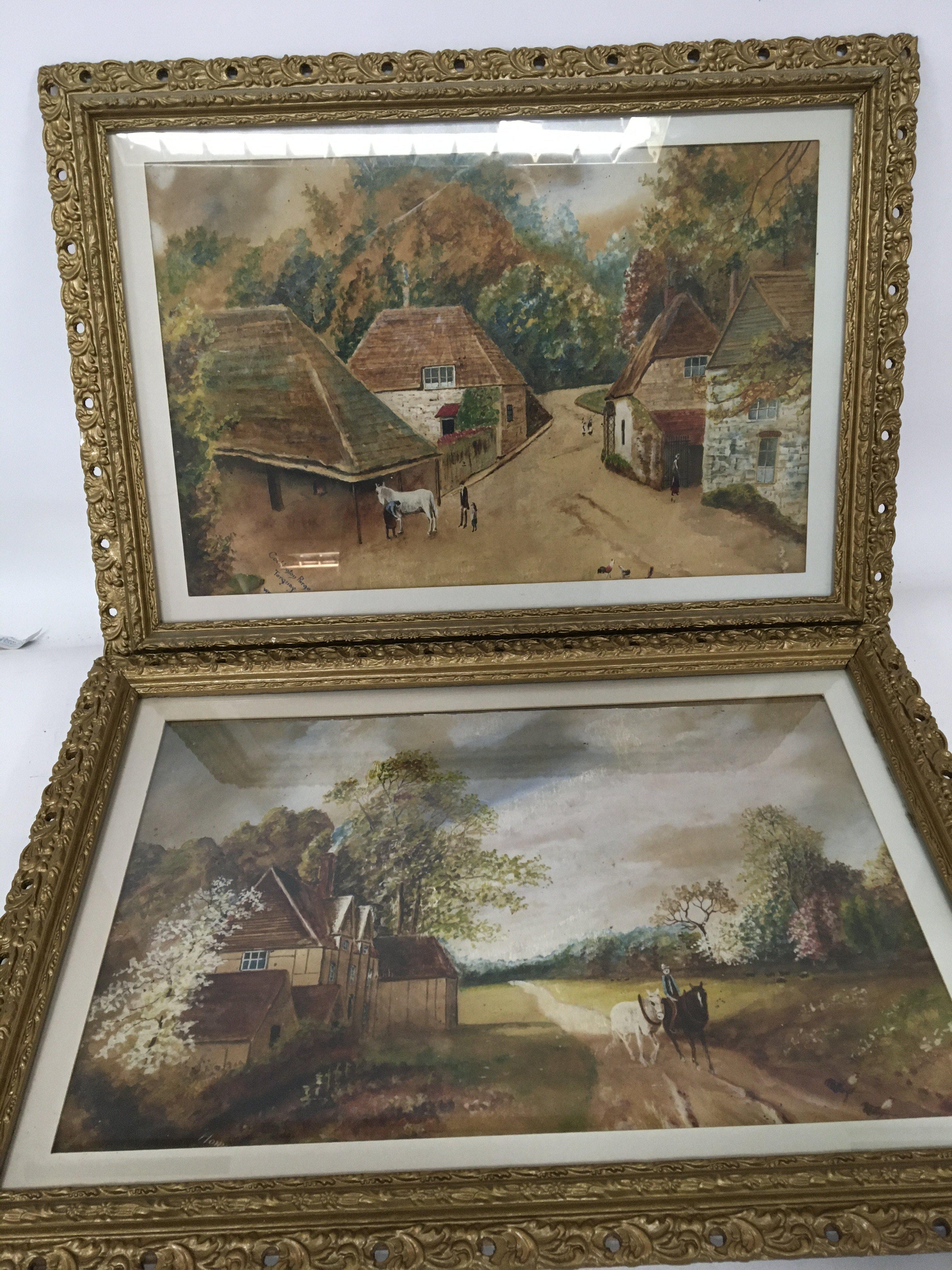 A pair of 19th century gilt framed Vernacular Naive watercolours a view of the Cockington Forge Torque and one other. 56x40cm (2)