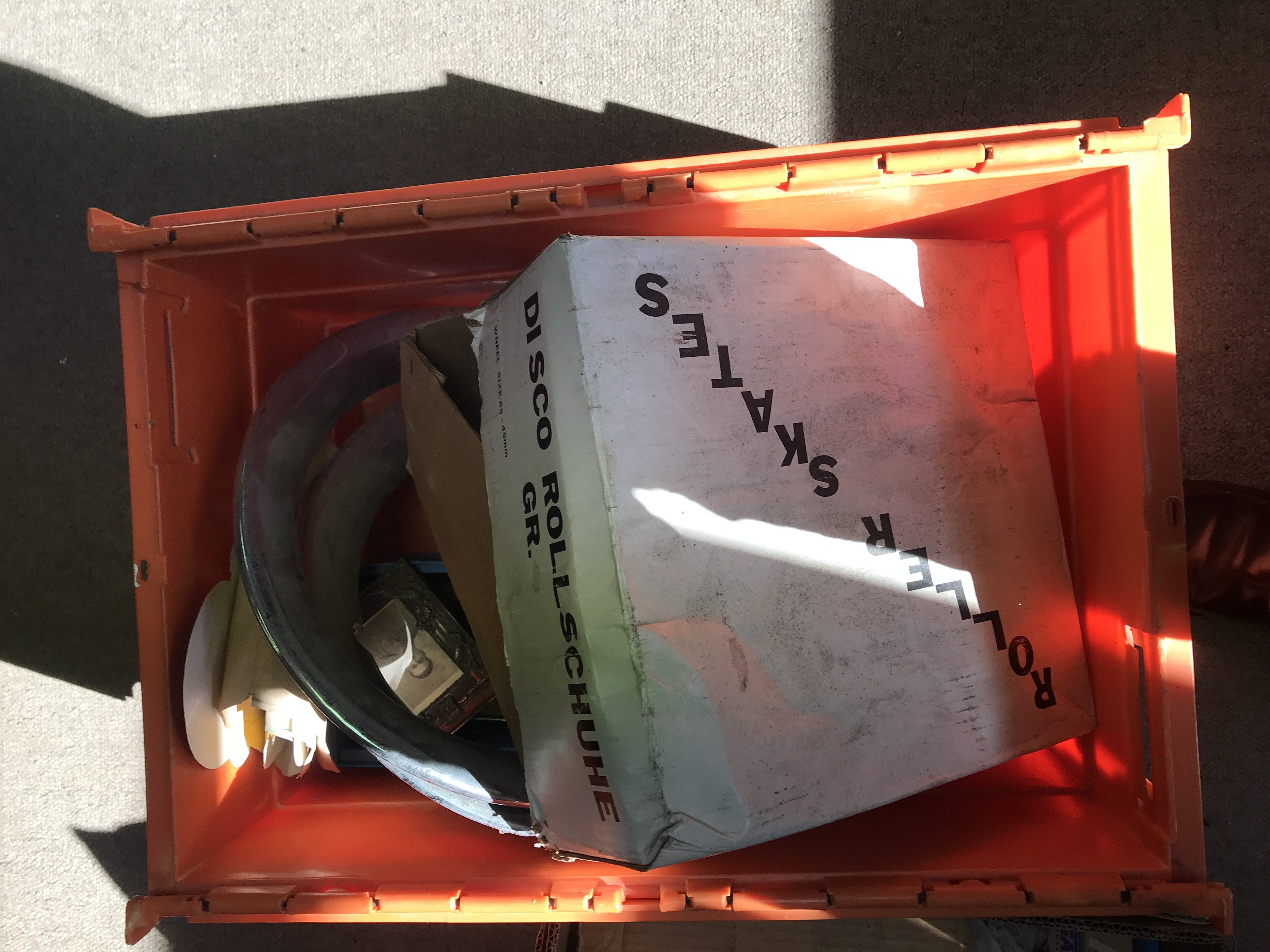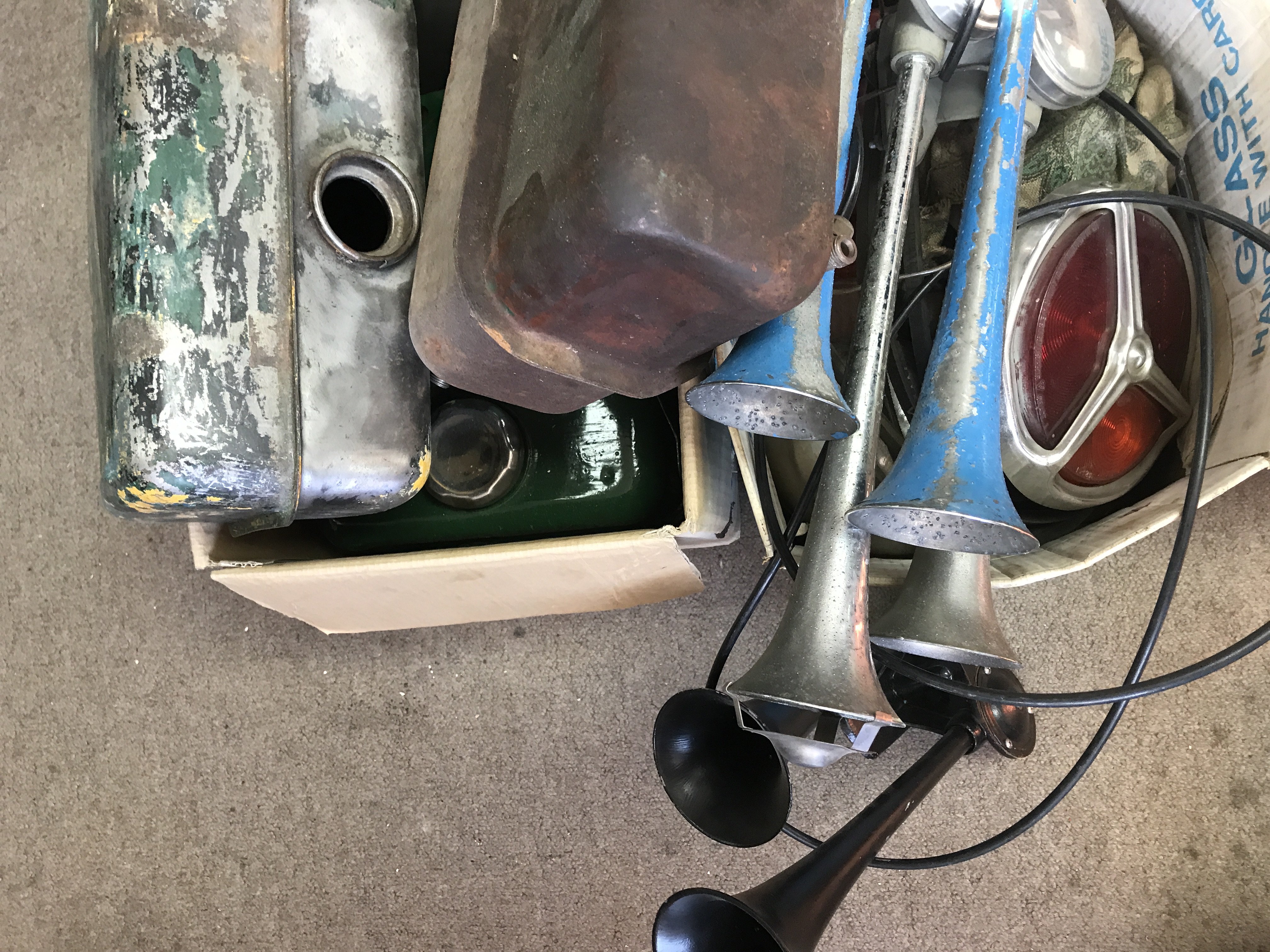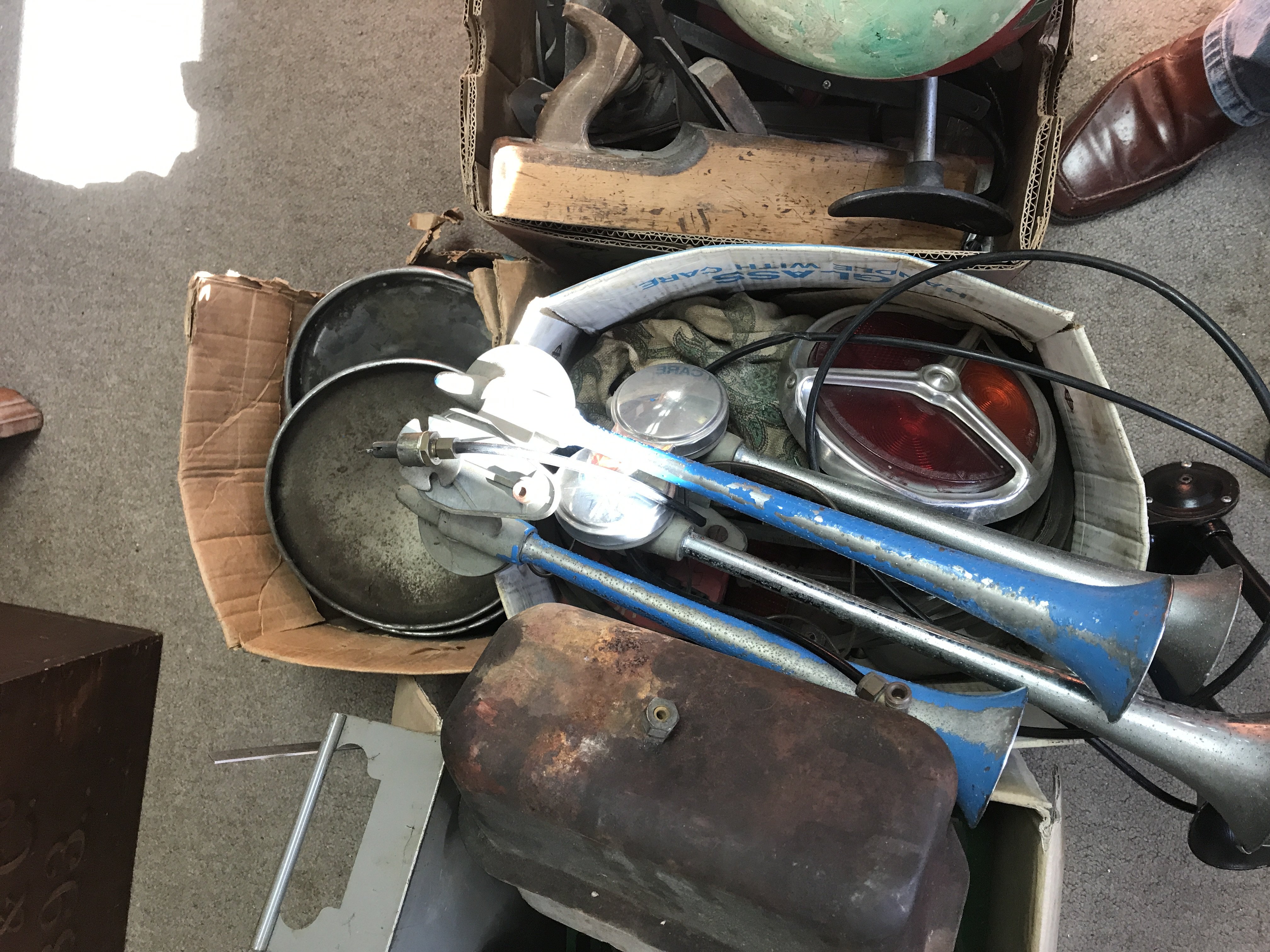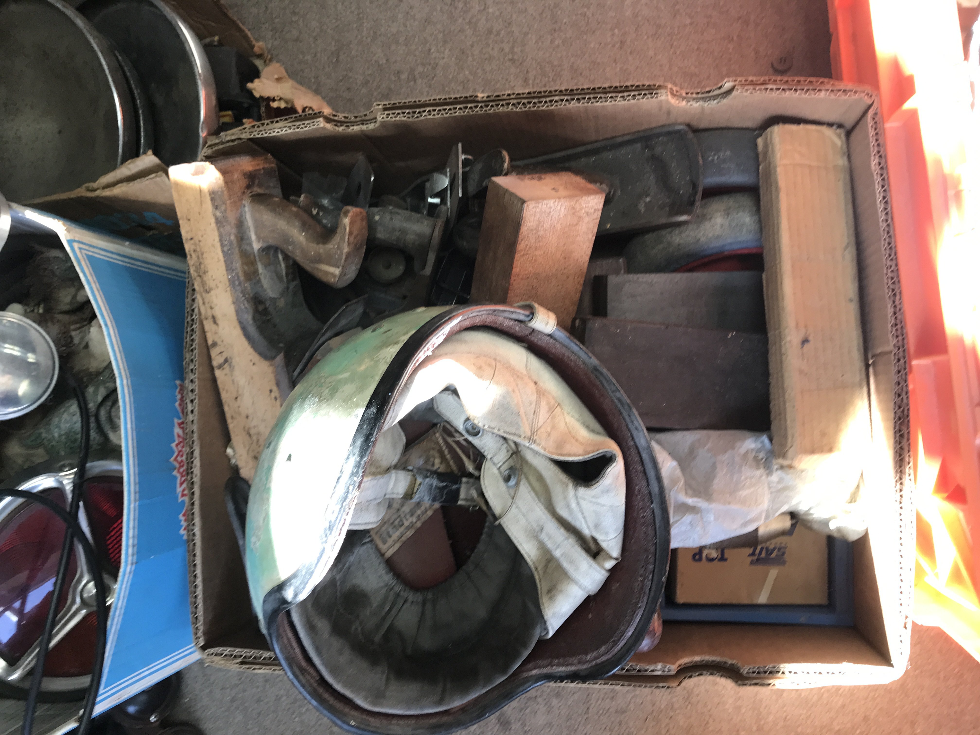 Five boxes containing moulding planes small oil tanks and car parts various and a vintage motorcycle helmet.