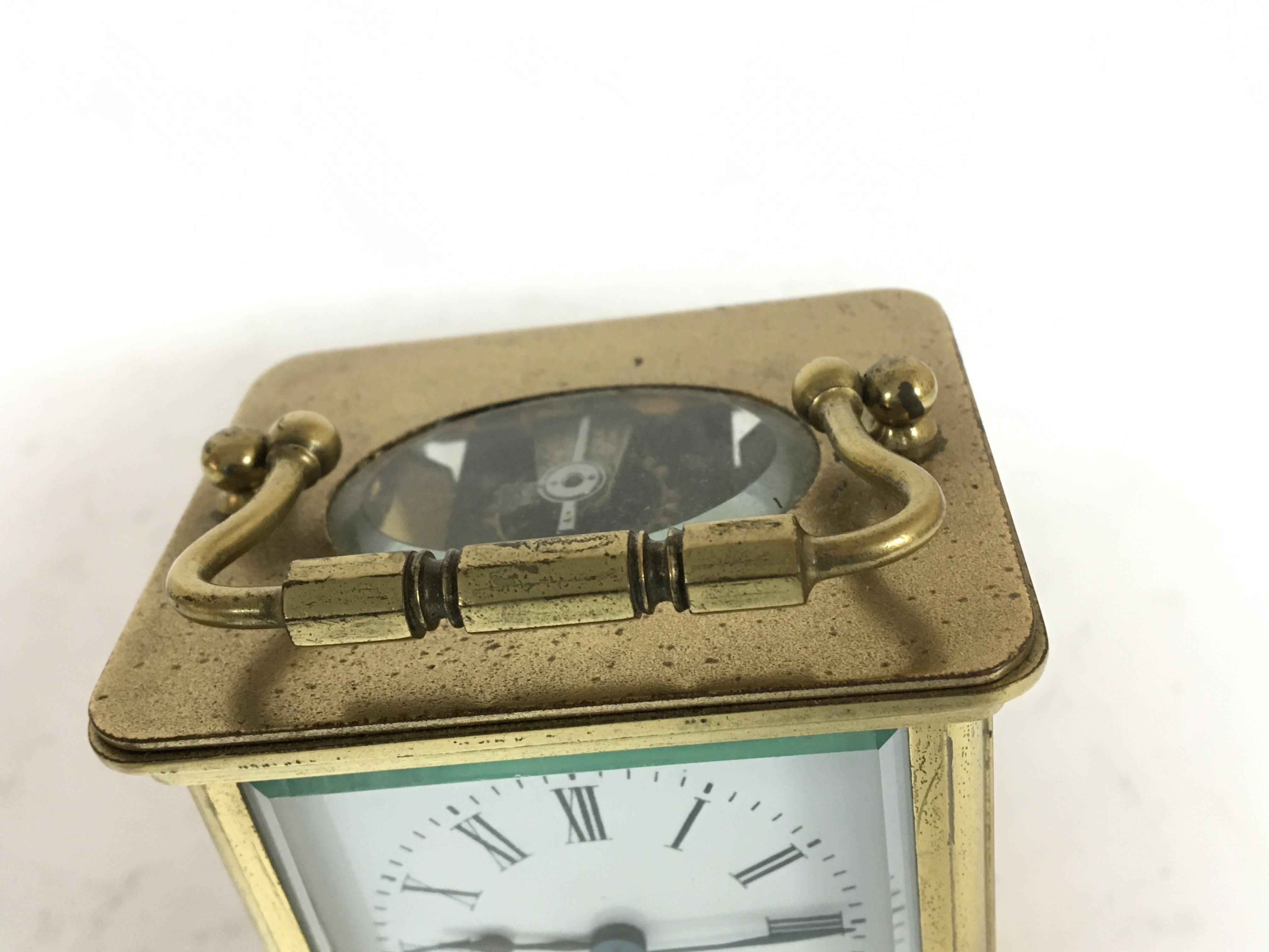 A brass cased carriage clock enamel dial seen working. Height 11cm