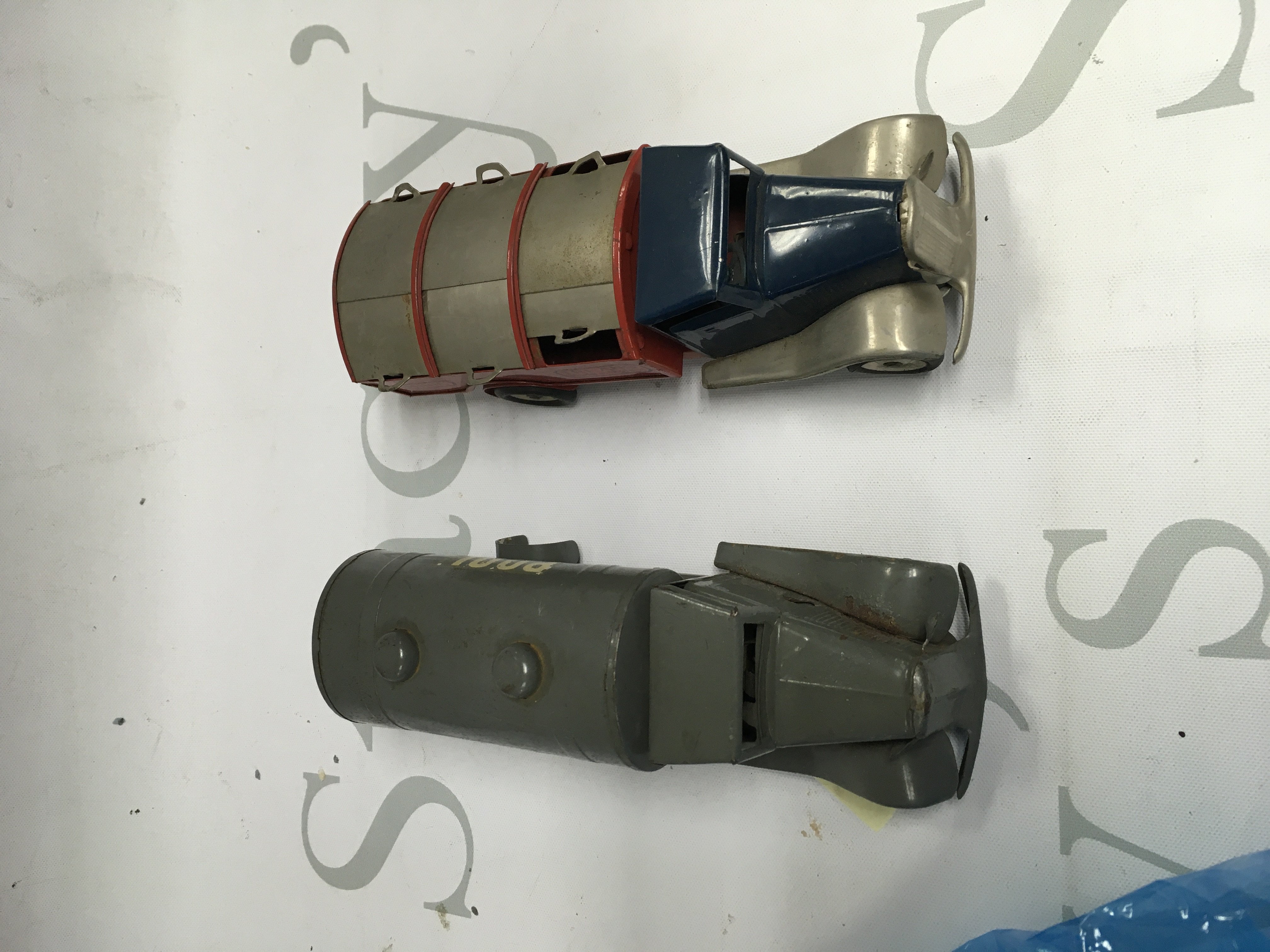 A vintage phantom II motor matic car in box with other playworn cars.