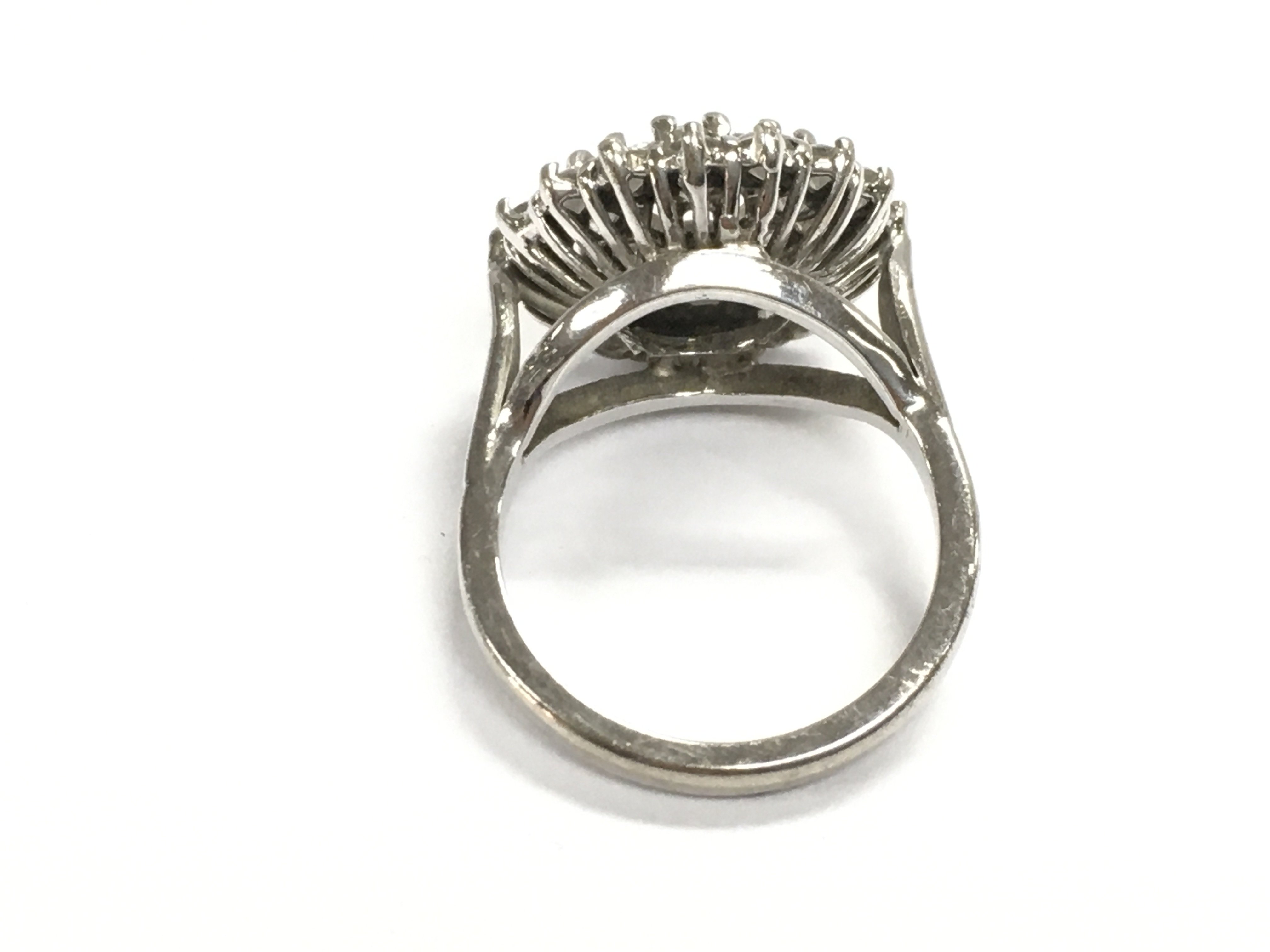 An 18ct white gold diamond cluster ring. Size N and 8.15g Central diamond is approximately 0.50ct and approximately 3.2ct total in diamonds