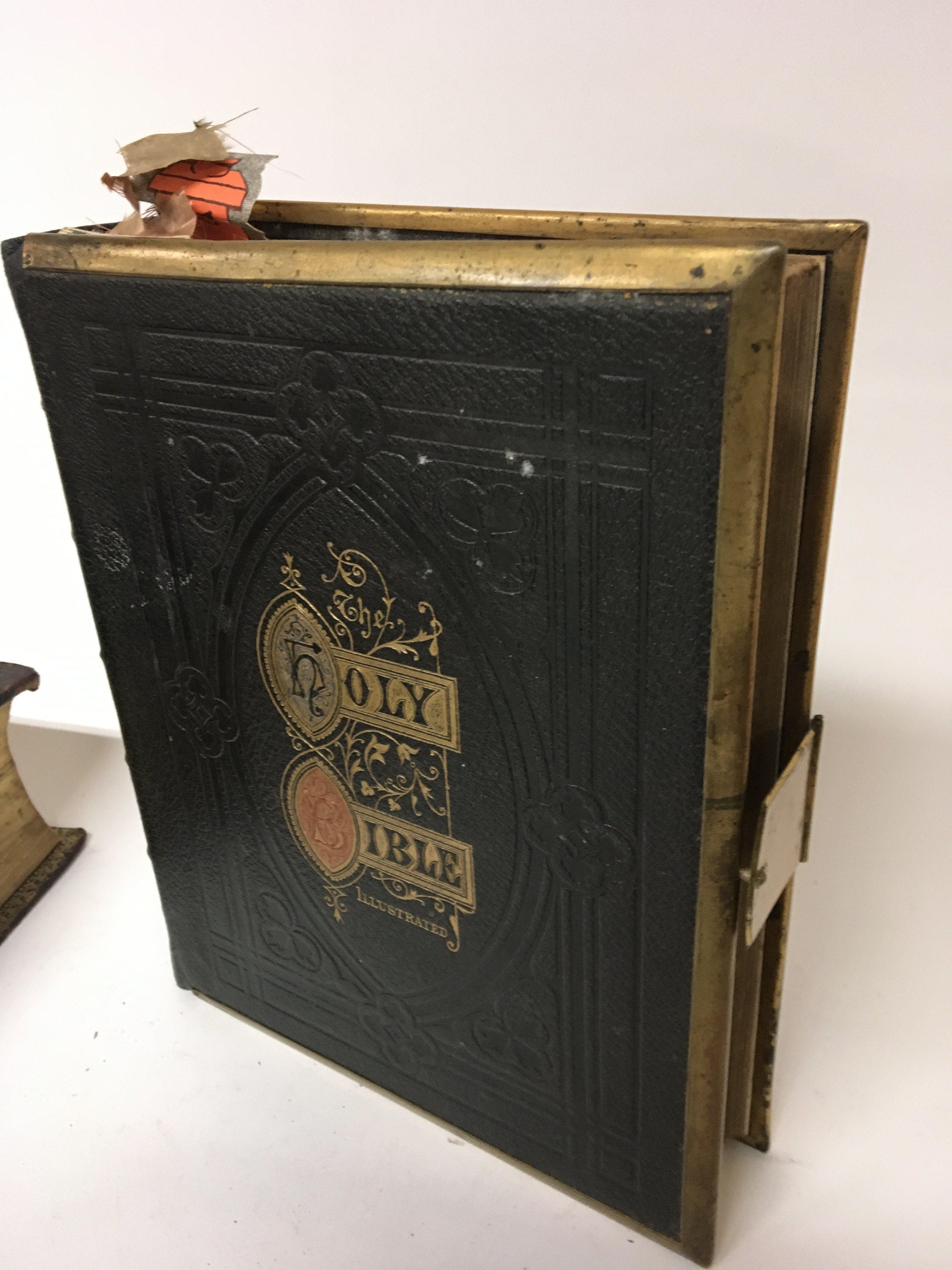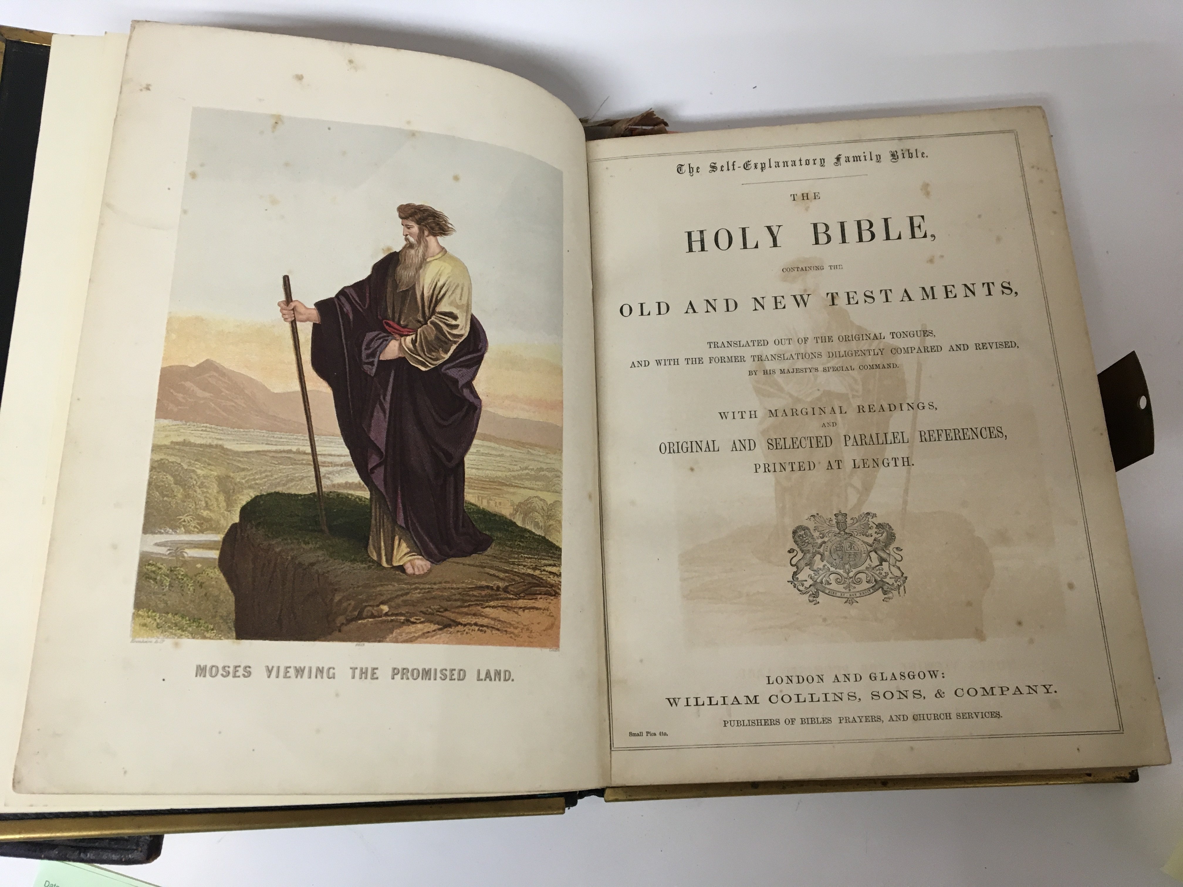 Two Victorian family bibles old and New Testament published William Collins with illustrations and brass clip bound and one other (2)